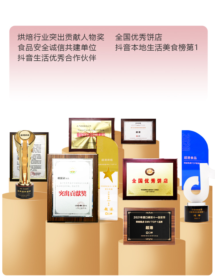 超港创立于1992年,是一家集生产销售面包、蛋糕、传统糕点、中西点于一体的全国性连锁烘焙企业,拥有百余家直营门店。超港以“玩味烘焙、文创美学”为经营理念。