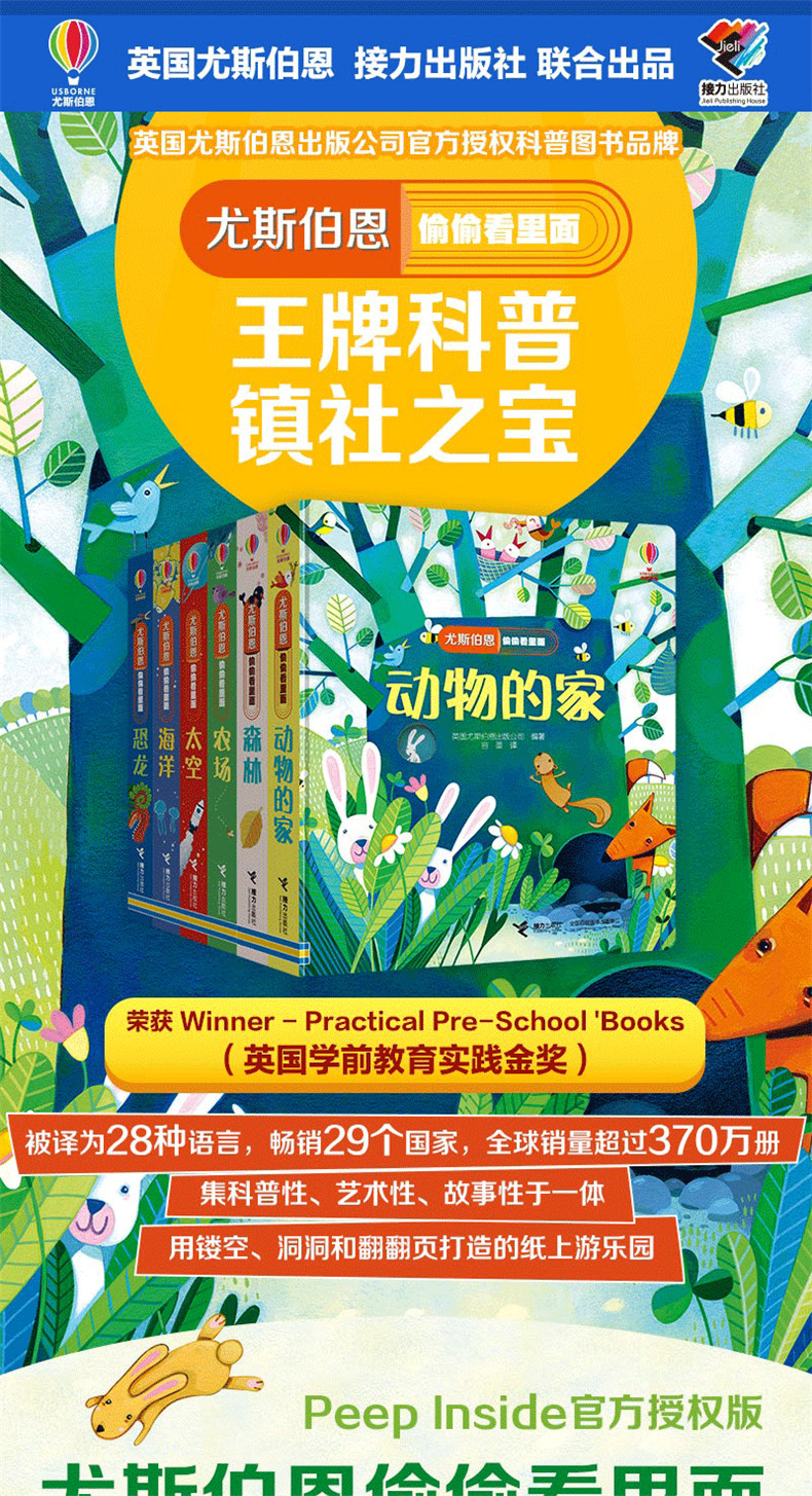 尤斯伯恩出版公司是英国优秀的少儿出版社,所出版童书被译成语言超过100种,是全世界孩子都喜爱的图书出版品牌。童书品类丰富,囊括从婴儿书到青少年读物所有年龄段的所有类别图书,其中以科普书、玩具书和益智游戏类图书见长。所出品图书充满创意,各类图书形式新颖,新奇有趣。多种图书获得各种奖项,2012年5月,尤斯伯恩被授予英国儿童出版协会年度儿童出版商奖。