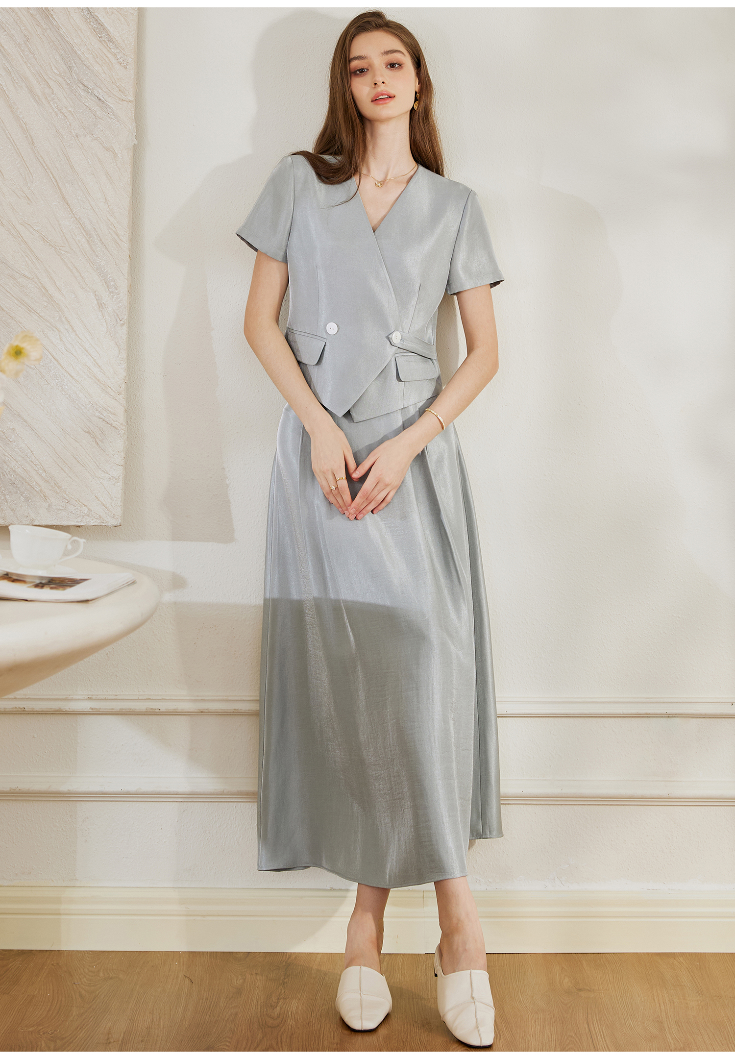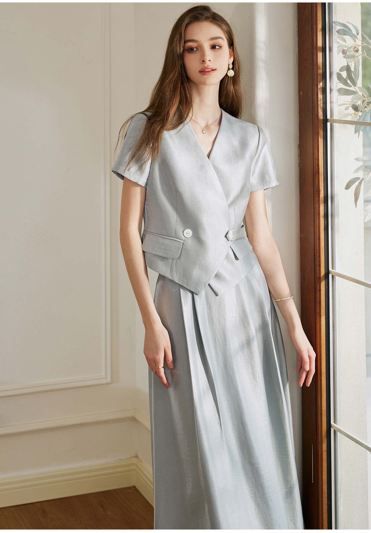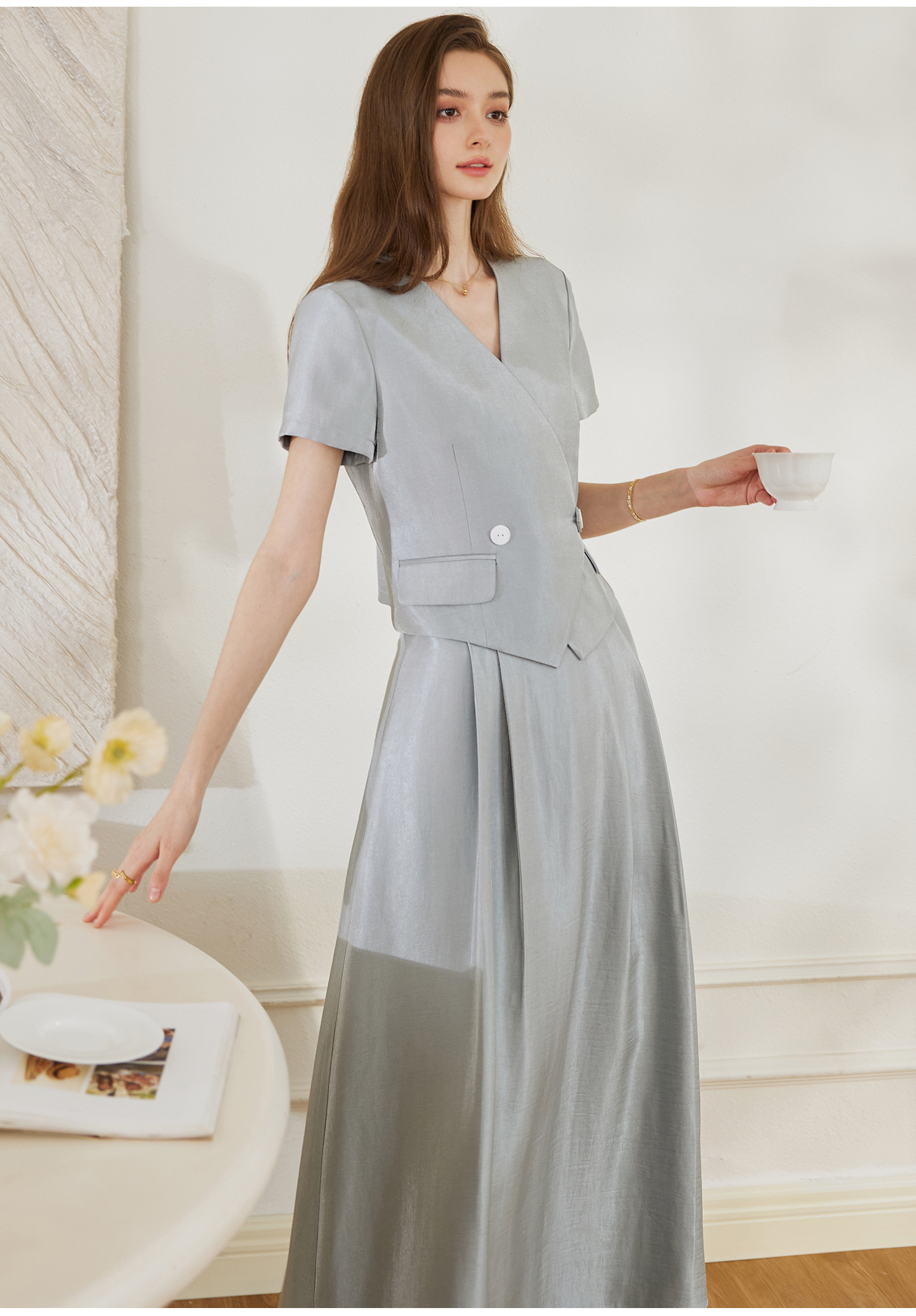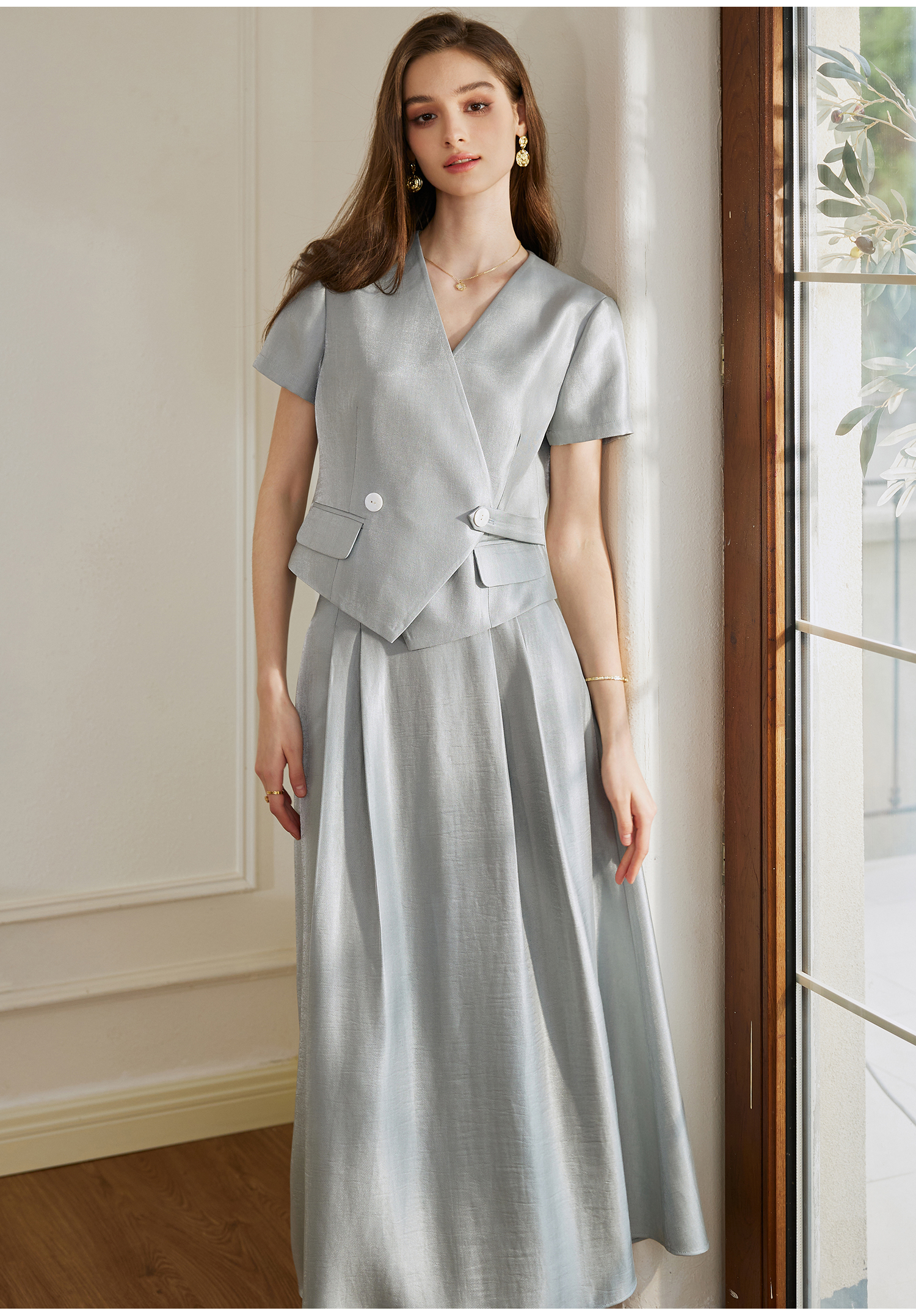 *【罗衣】高级亮丝修身套装夏季新款浅蓝色上衣半身裙两件套10550