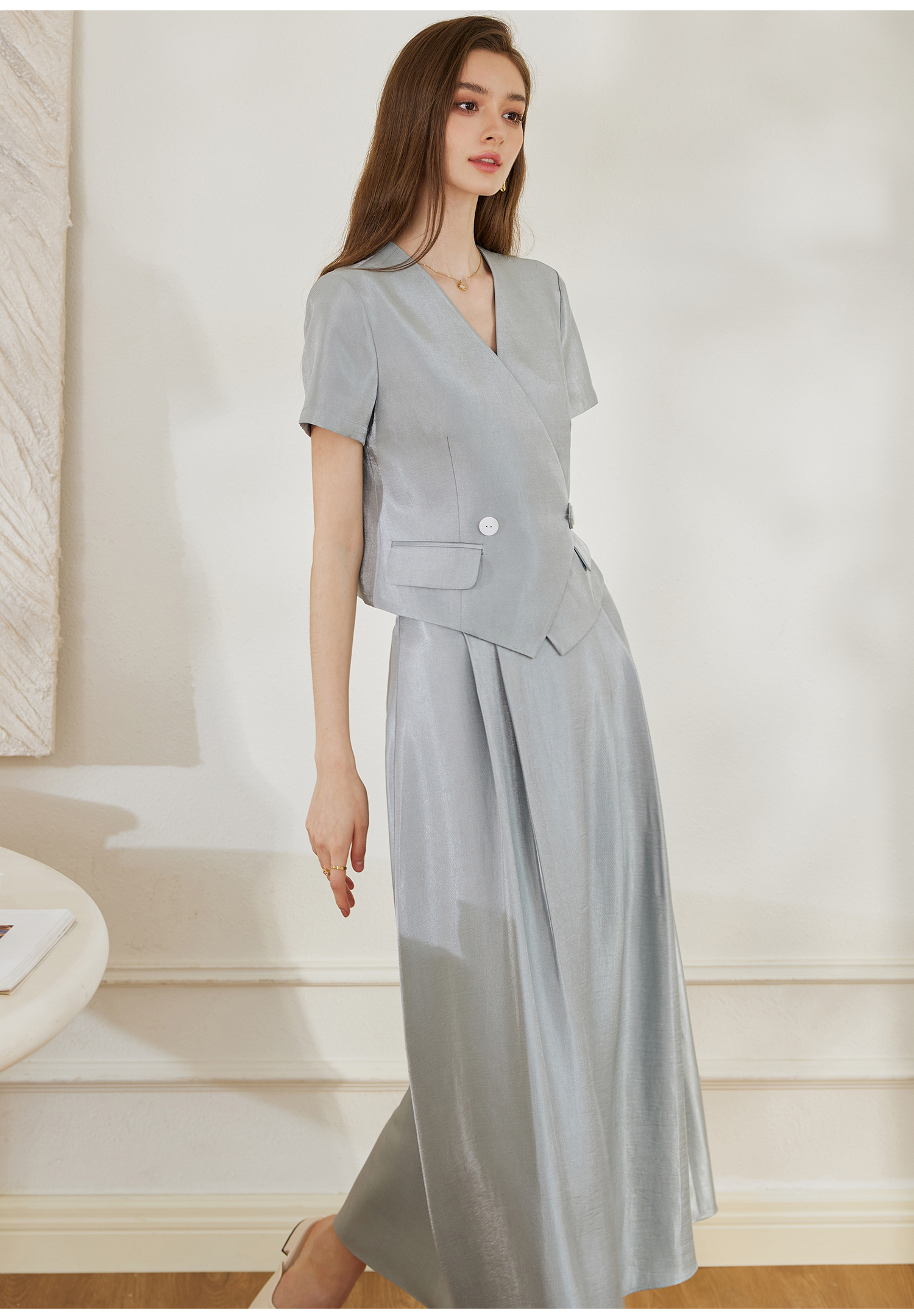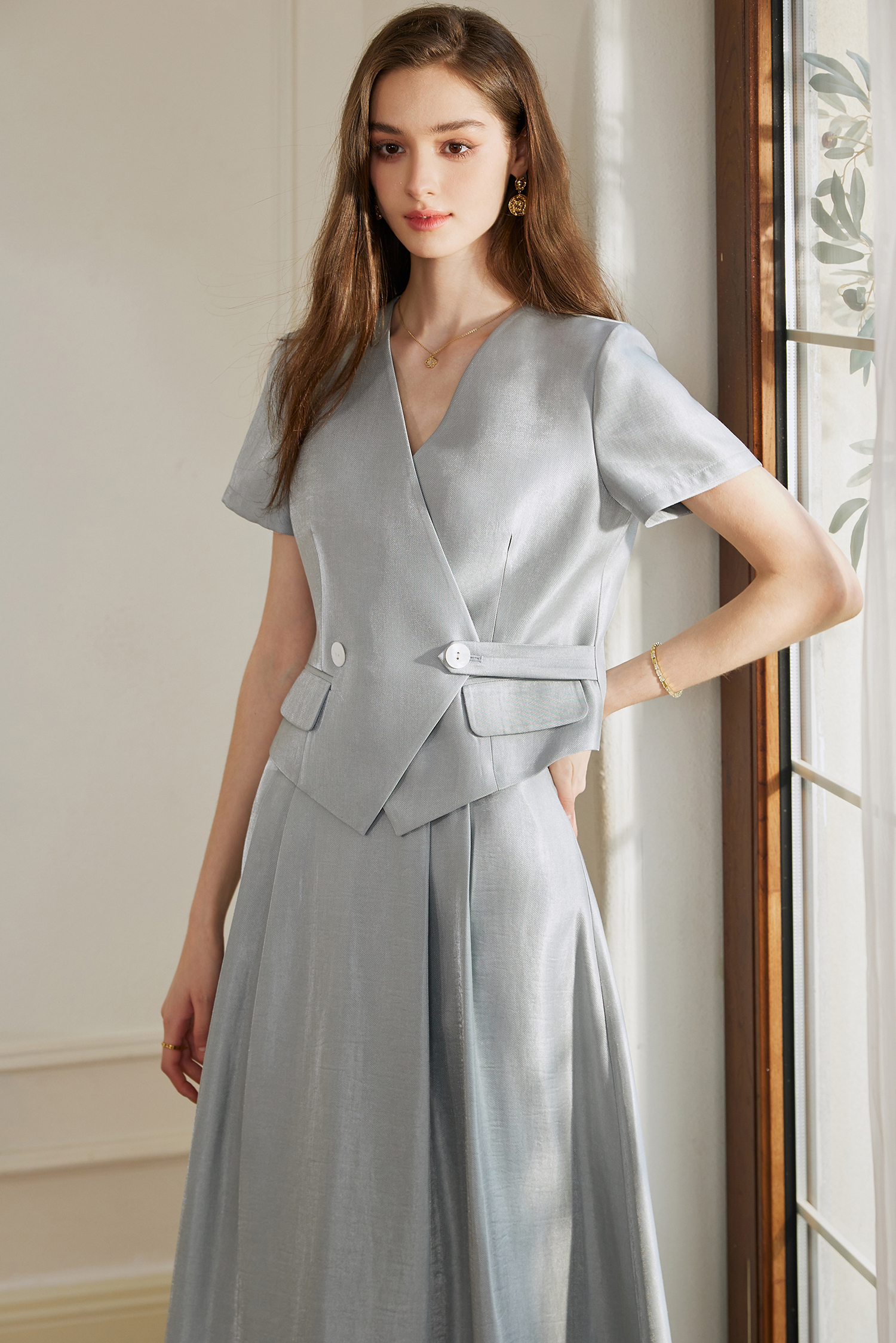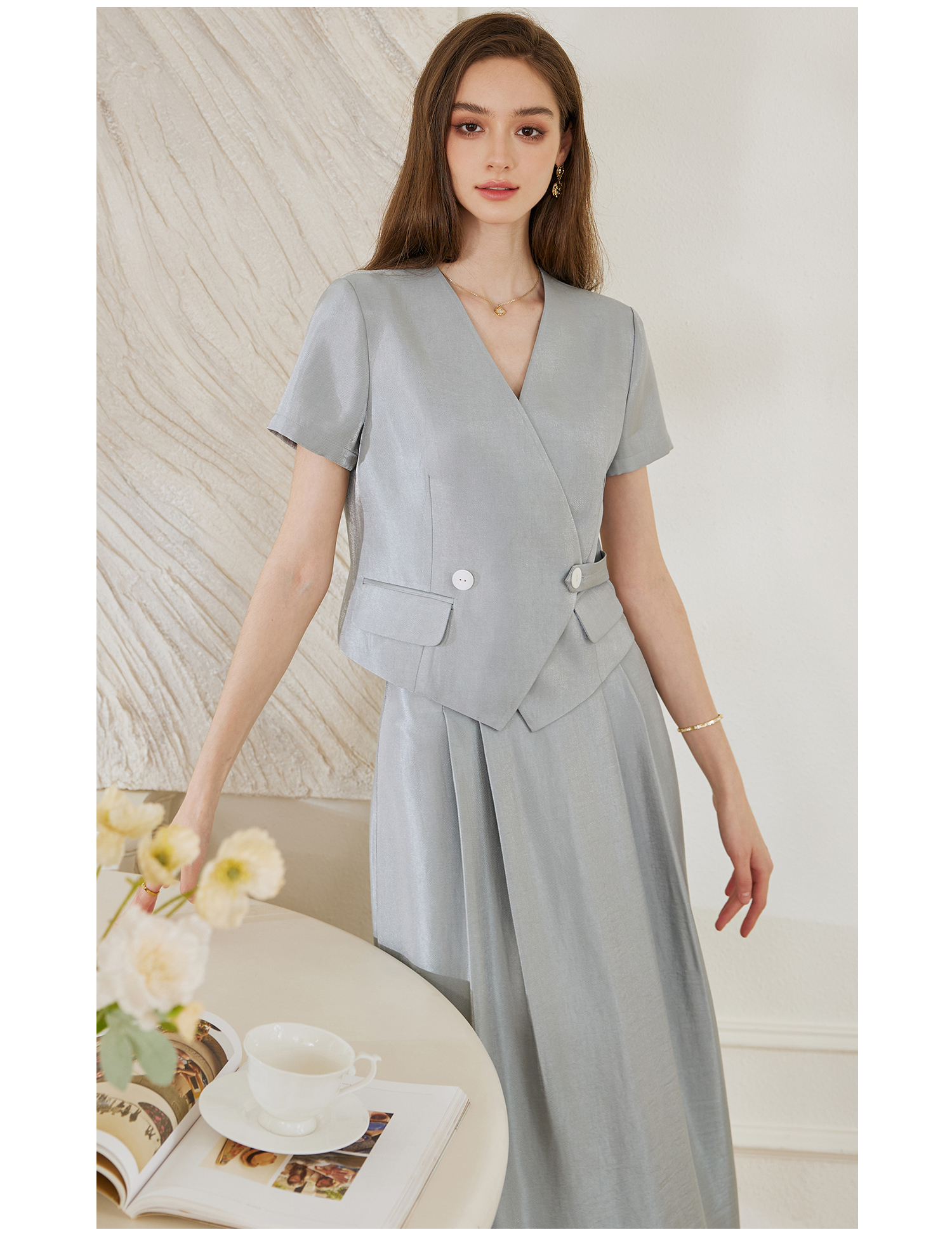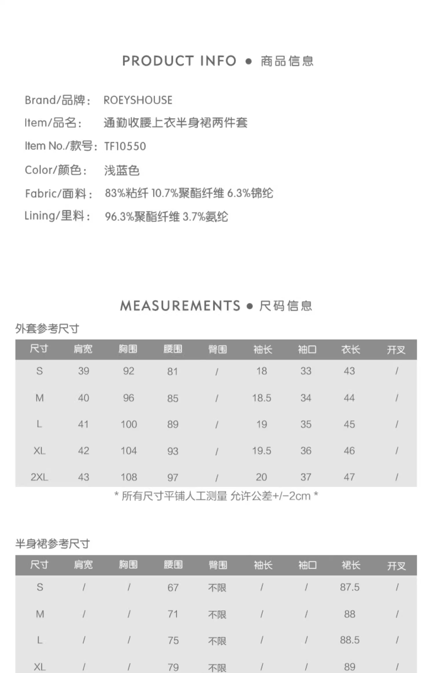 *【罗衣】高级亮丝修身套装夏季新款浅蓝色上衣半身裙两件套10550