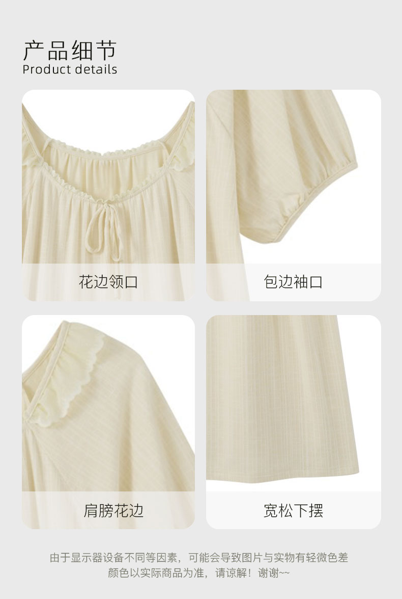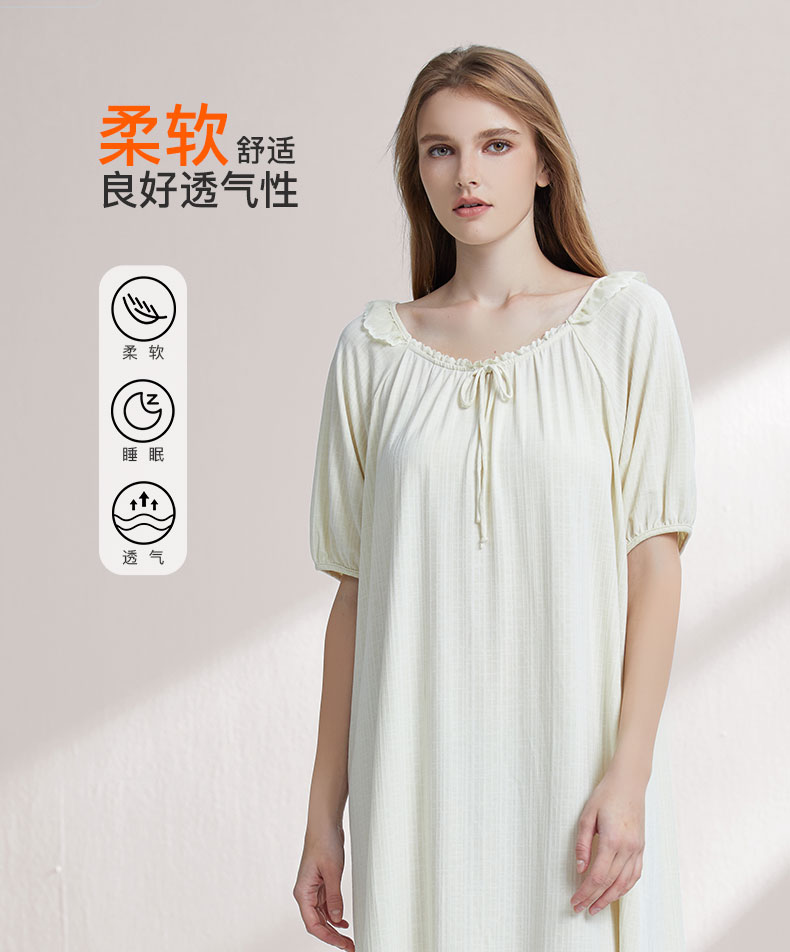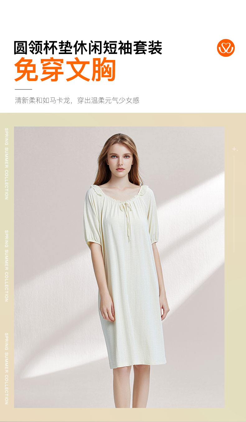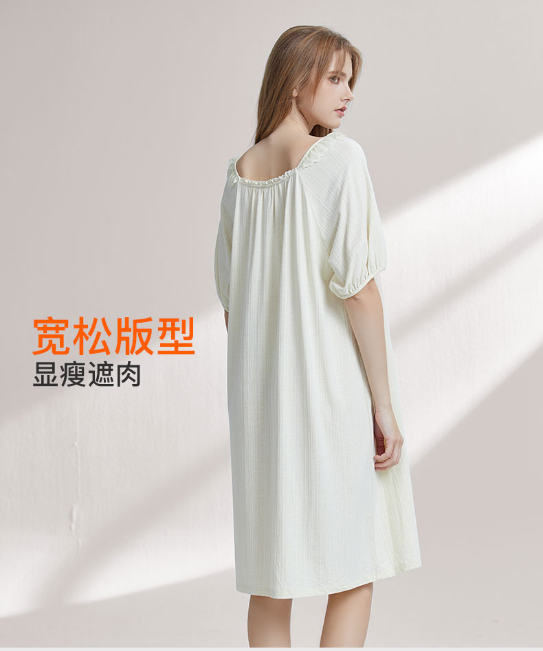 【7.5折限时特惠】(大版)【秀黛】女圆领针织提花短袖裙锦棉悬垂清爽收褶方V领女士夏季短袖睡裙W2551085T【门店同款】