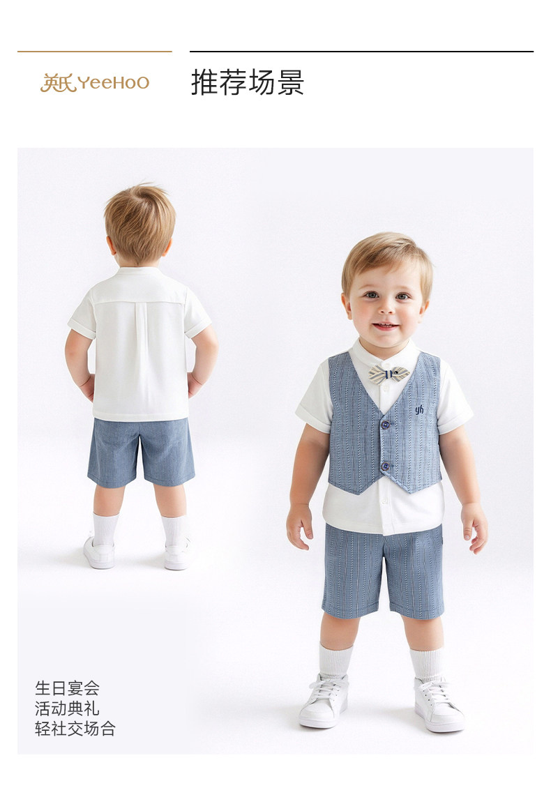 英氏儿童套装男童夏季假两件短袖短裤防蚊小绅士衣服YRABJ2S012A