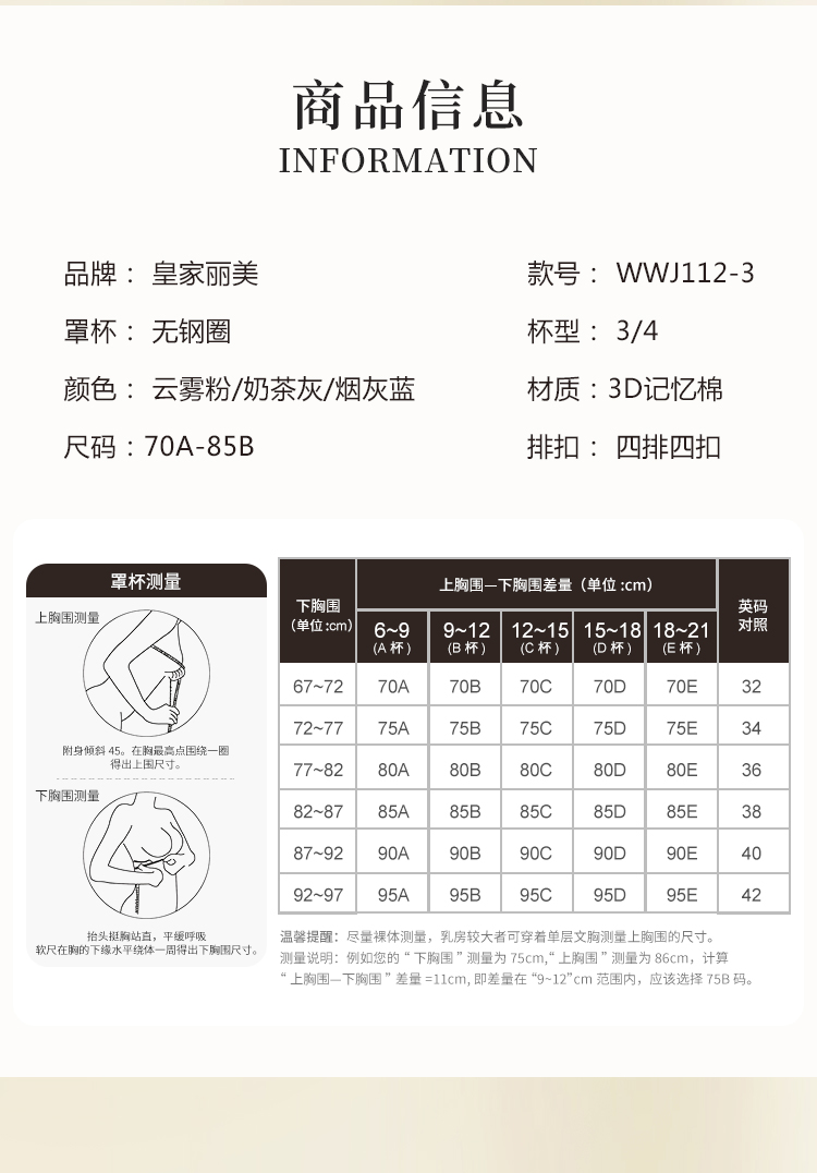 皇家丽美3D记忆棉无钢圈内衣女小胸显大聚拢调整型收副乳文胸WWJ112-3