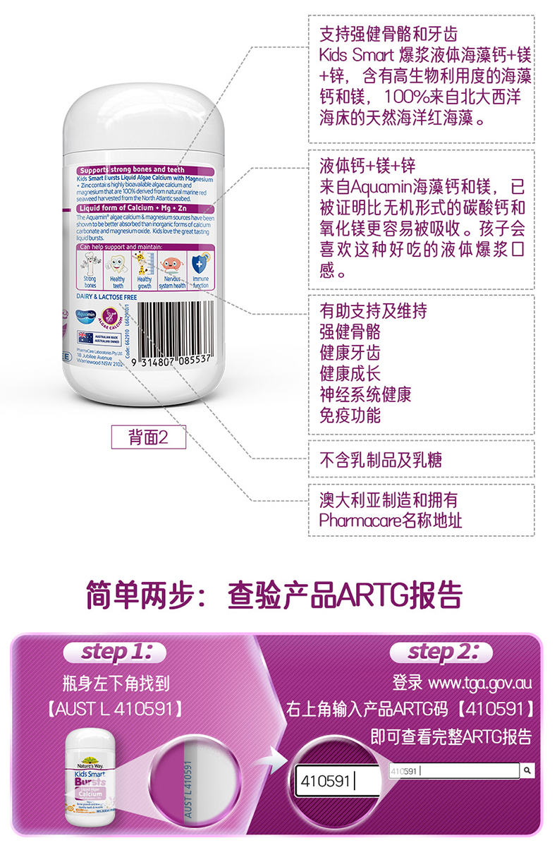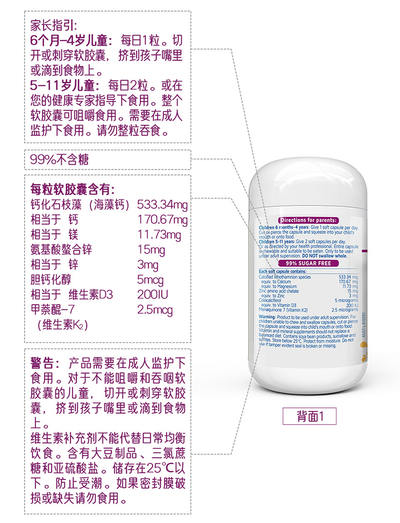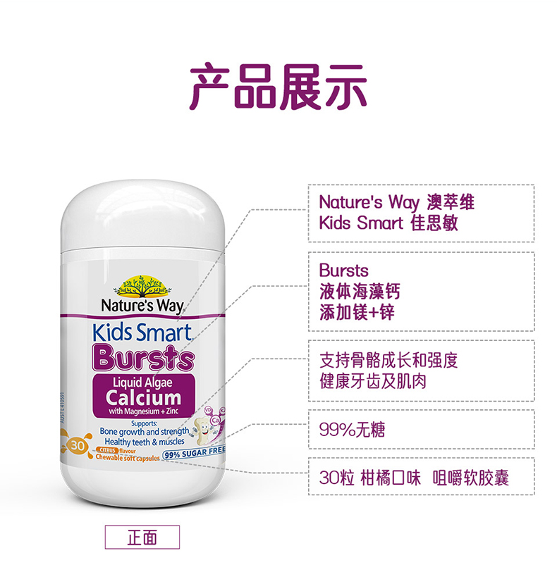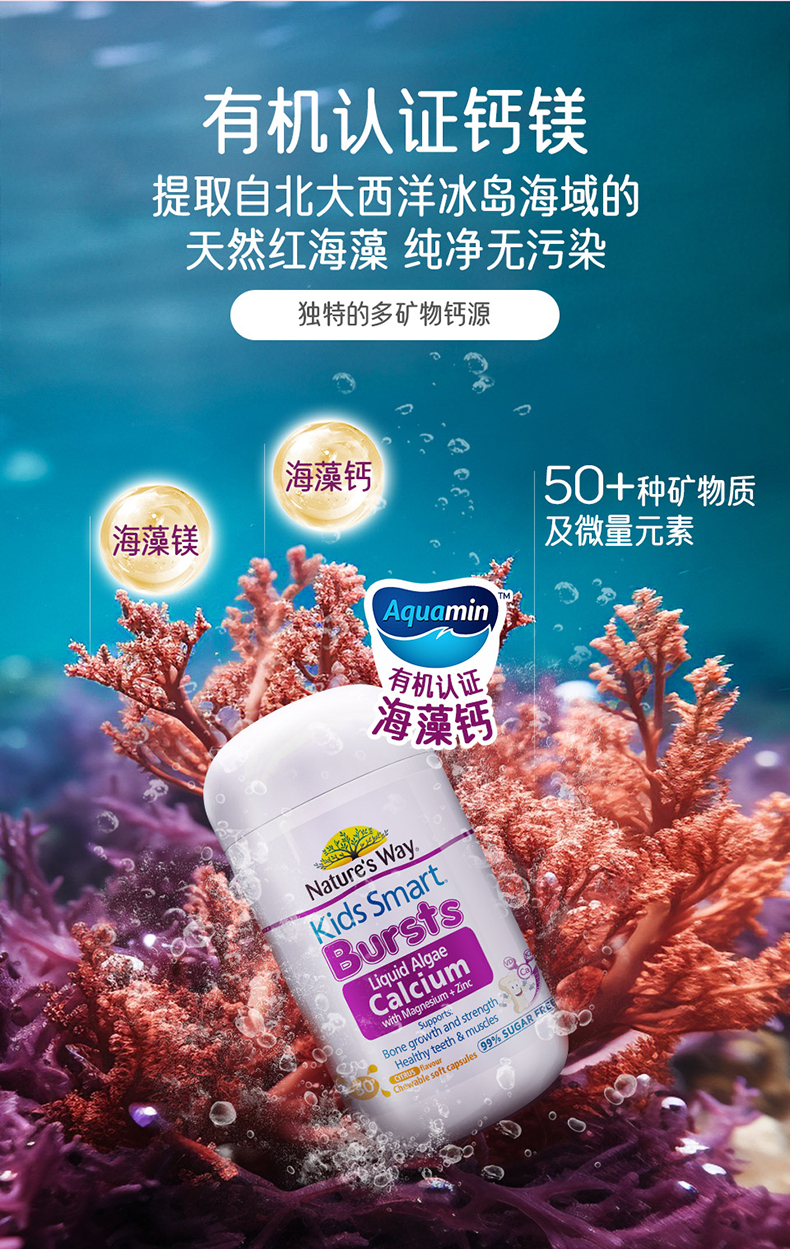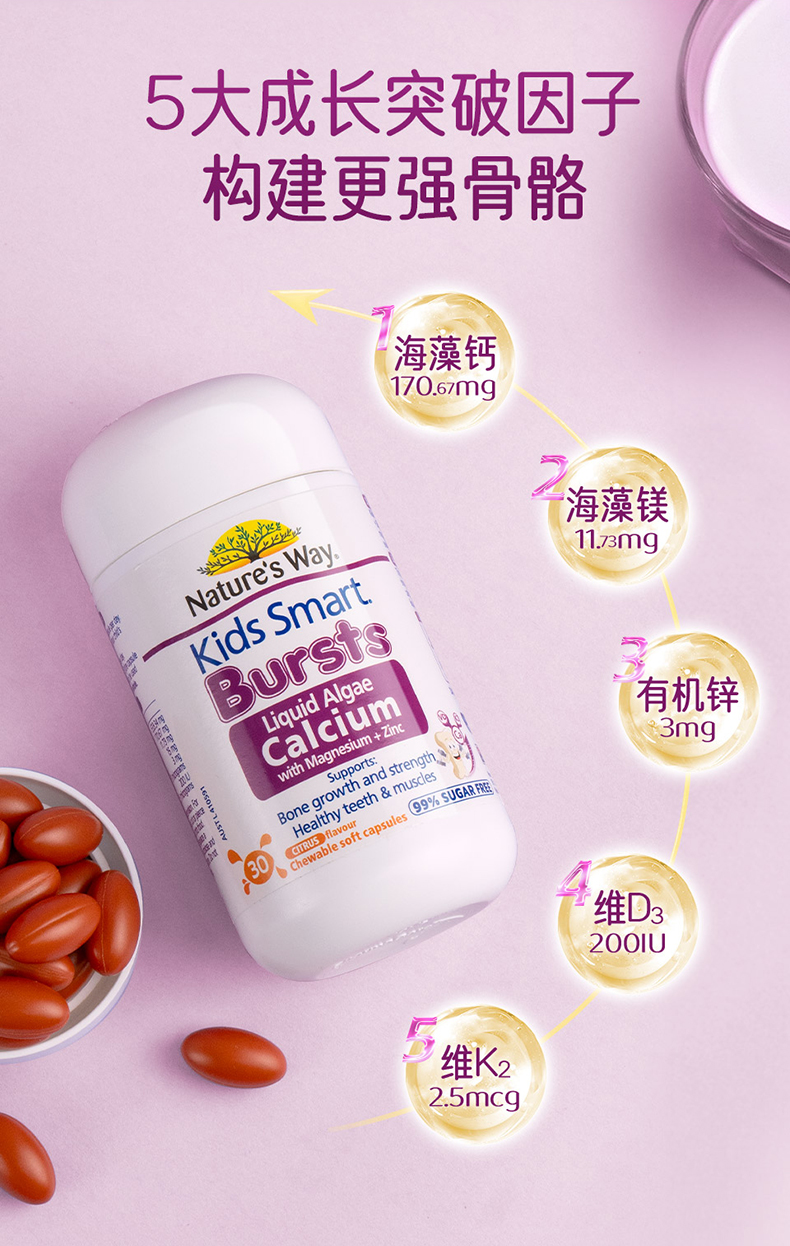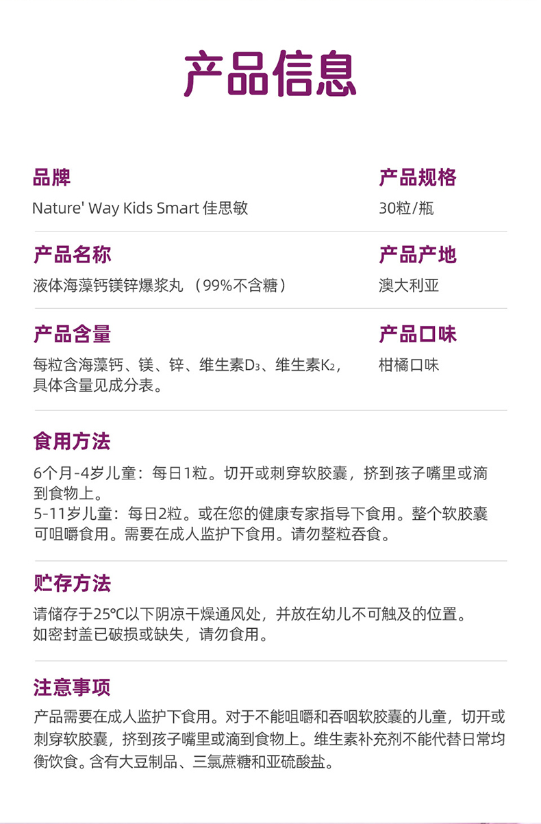 佳思敏海藻钙儿童液体钙镁锌K2D3宝宝VD30粒