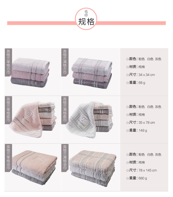 颜色分类: 满格粉色浴巾 满格白色浴巾 满格灰色浴巾 两条满格粉色方巾 两条满格白色方巾 两条满格灰色方巾 两条单格粉色方巾 两条单格白色方巾 两条单格灰色方巾 英格兰单格面巾/白 英格兰单格面巾/粉 英格兰单格面巾/灰 英格兰满格面巾/白 英格兰满格面巾/粉 英格兰满格面巾/灰