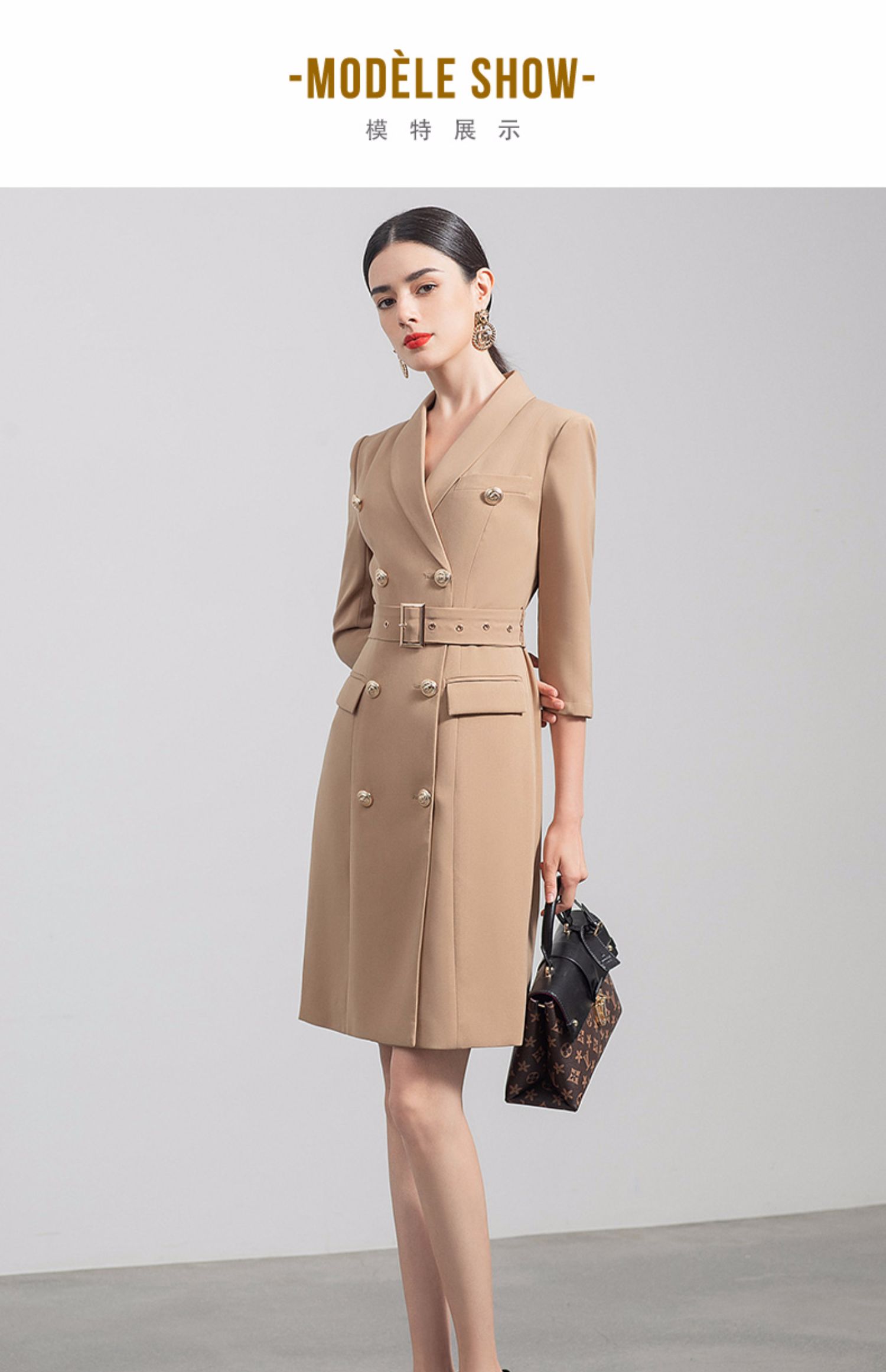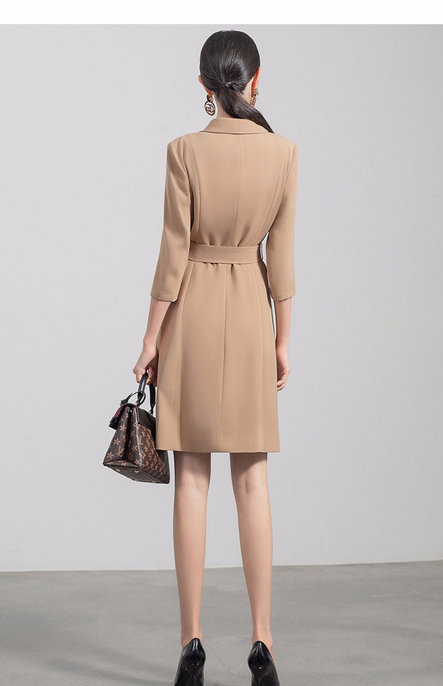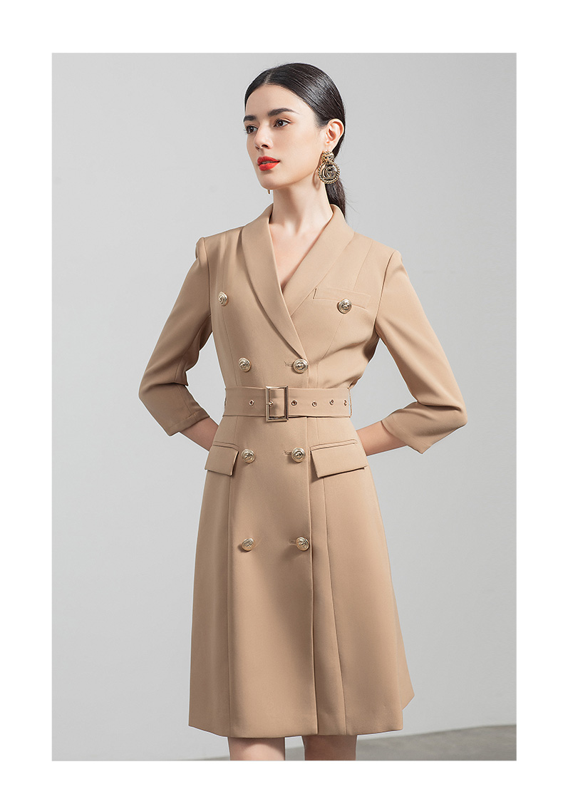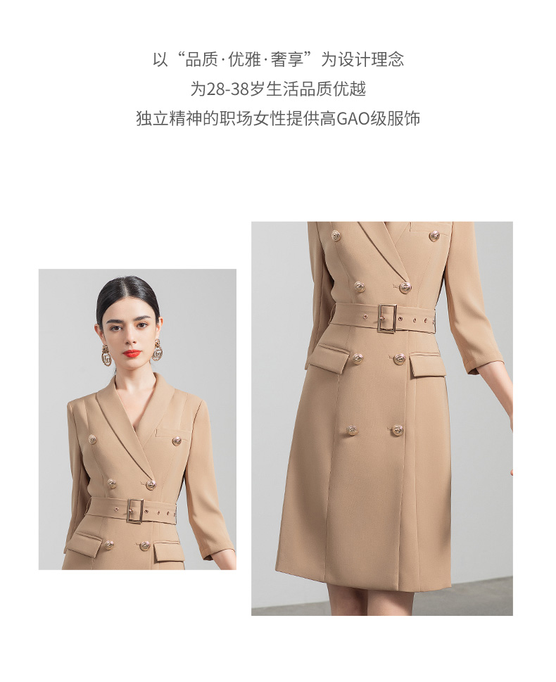 IWY/气质双排扣卡其色西装连衣裙女收腰显瘦职业女裙七分袖通勤工作服Q470