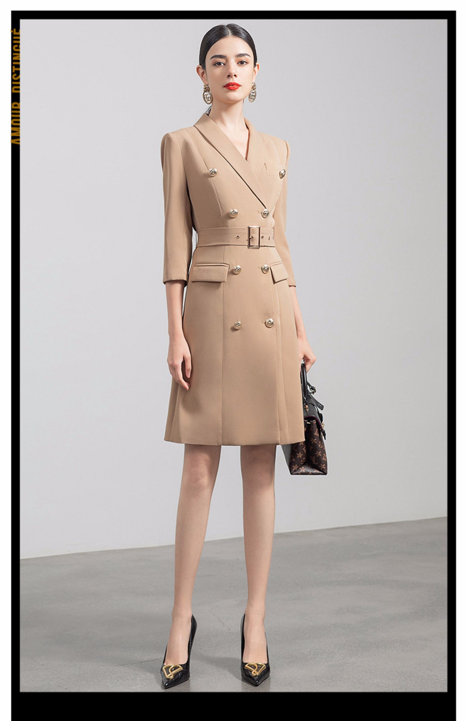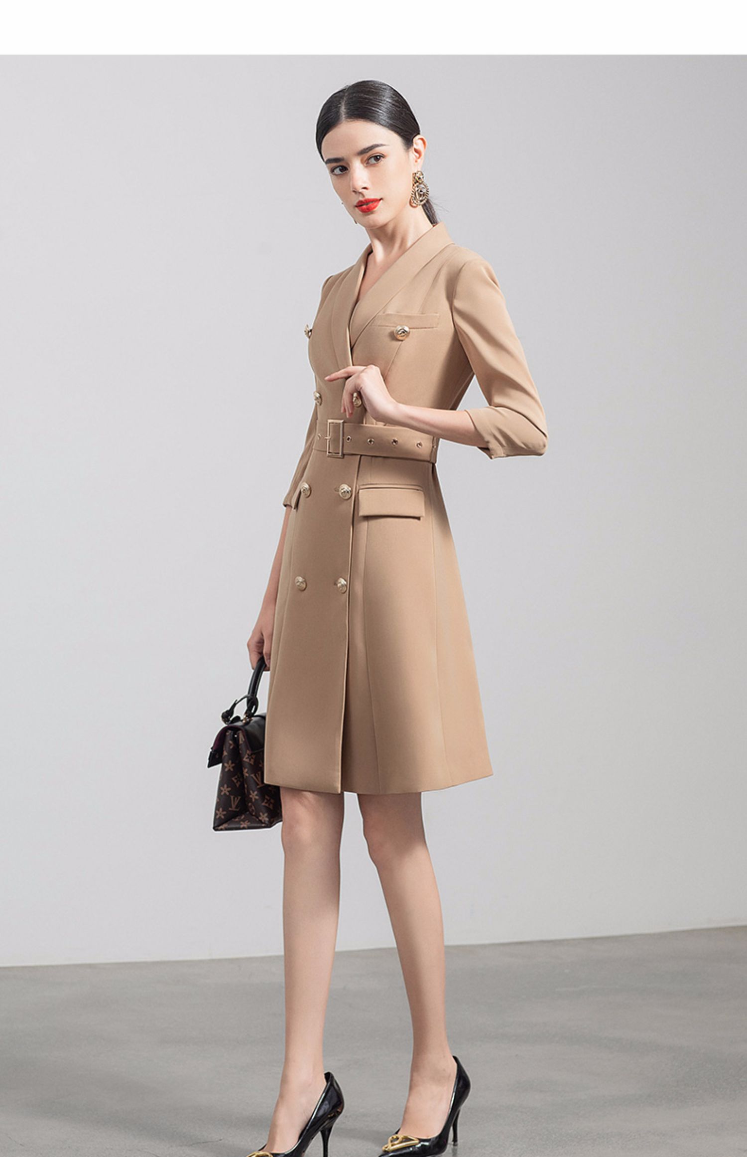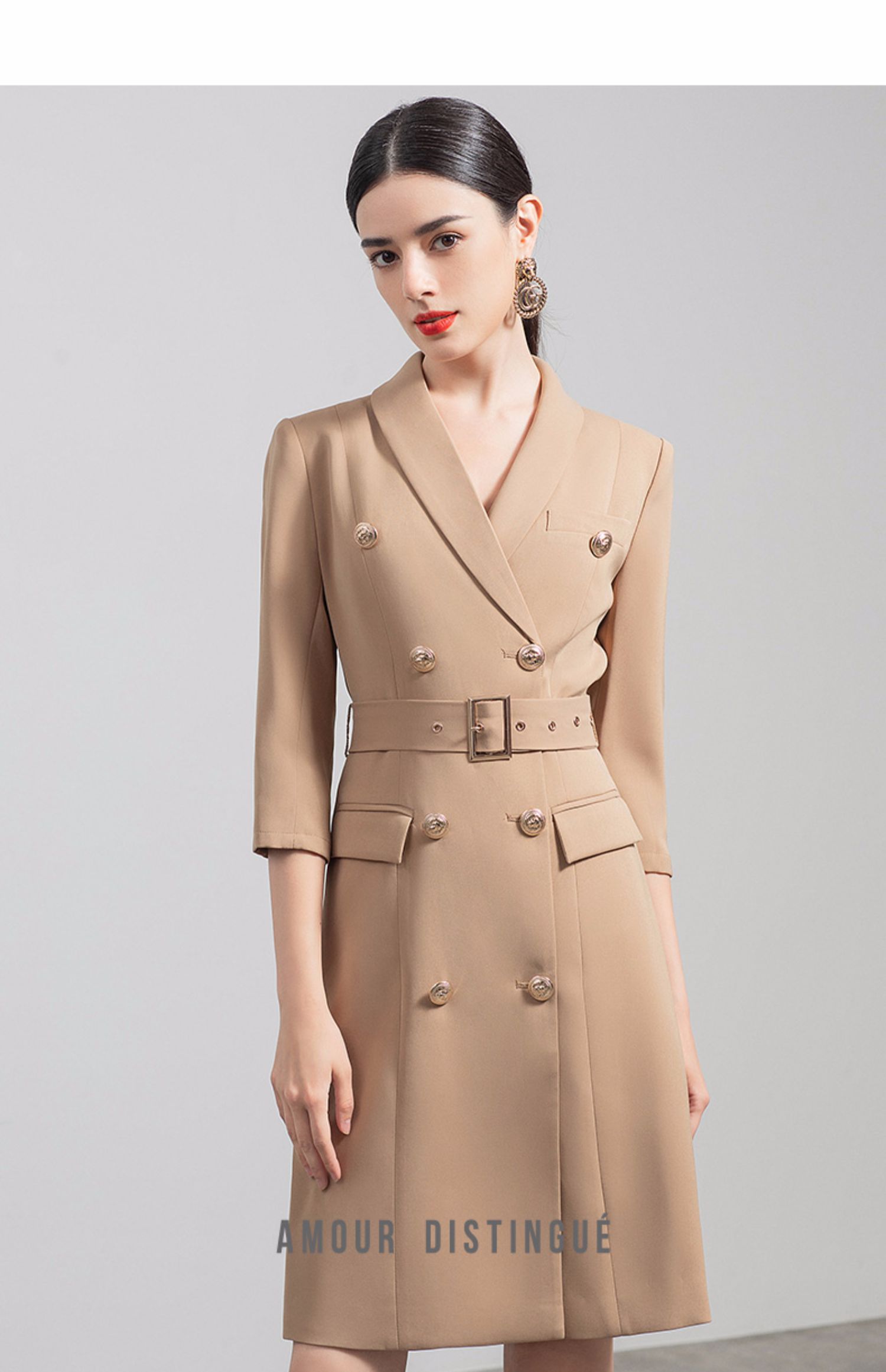 IWY/气质双排扣卡其色西装连衣裙女收腰显瘦职业女裙七分袖通勤工作服Q470