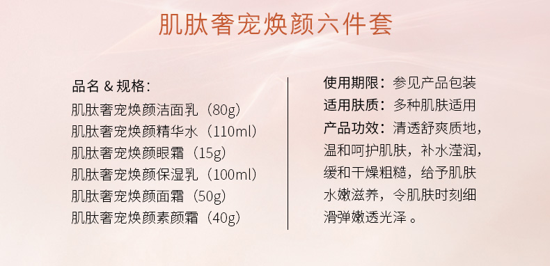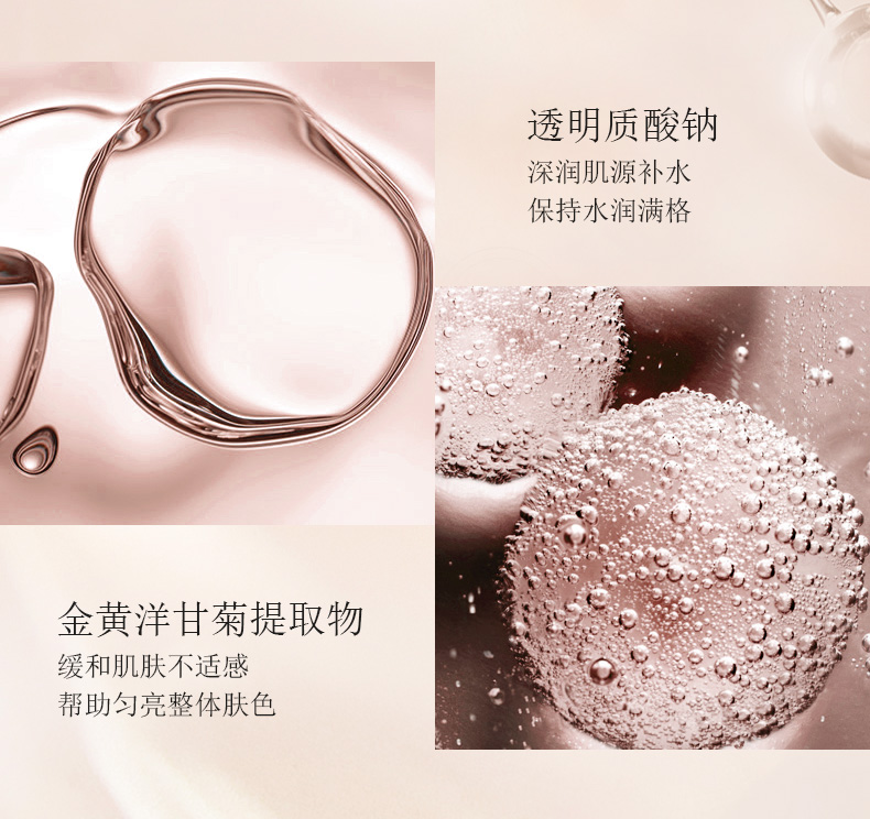 适用产品功效:清透舒爽质地,温和呵护肌肤,补水滢润缓和干燥粗糙,给予肌肤水嫩滋养,令肌肤时刻细滑弹嫩透光泽