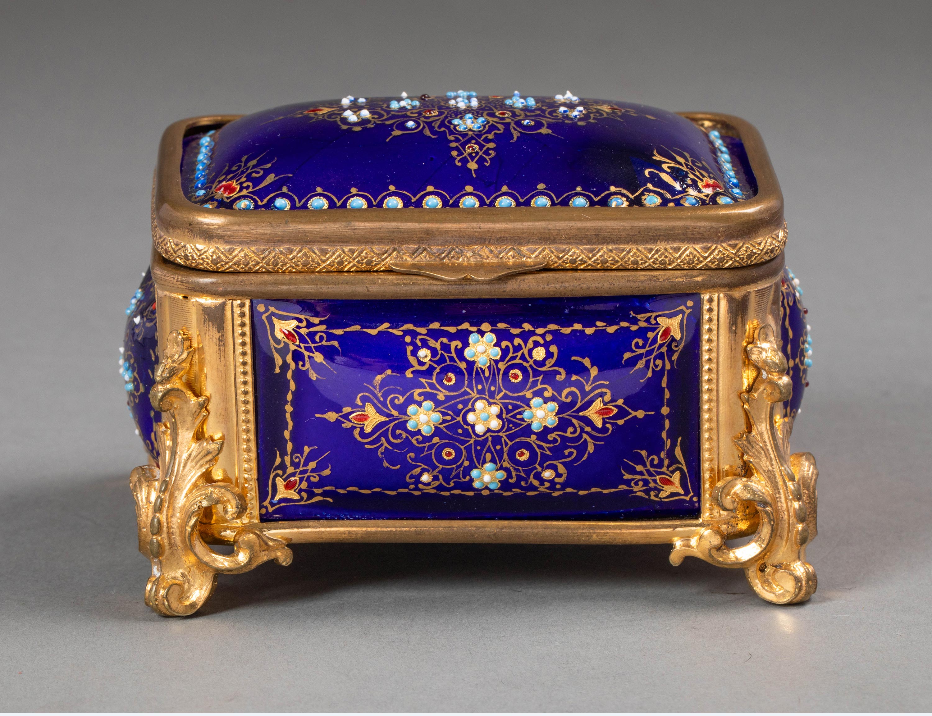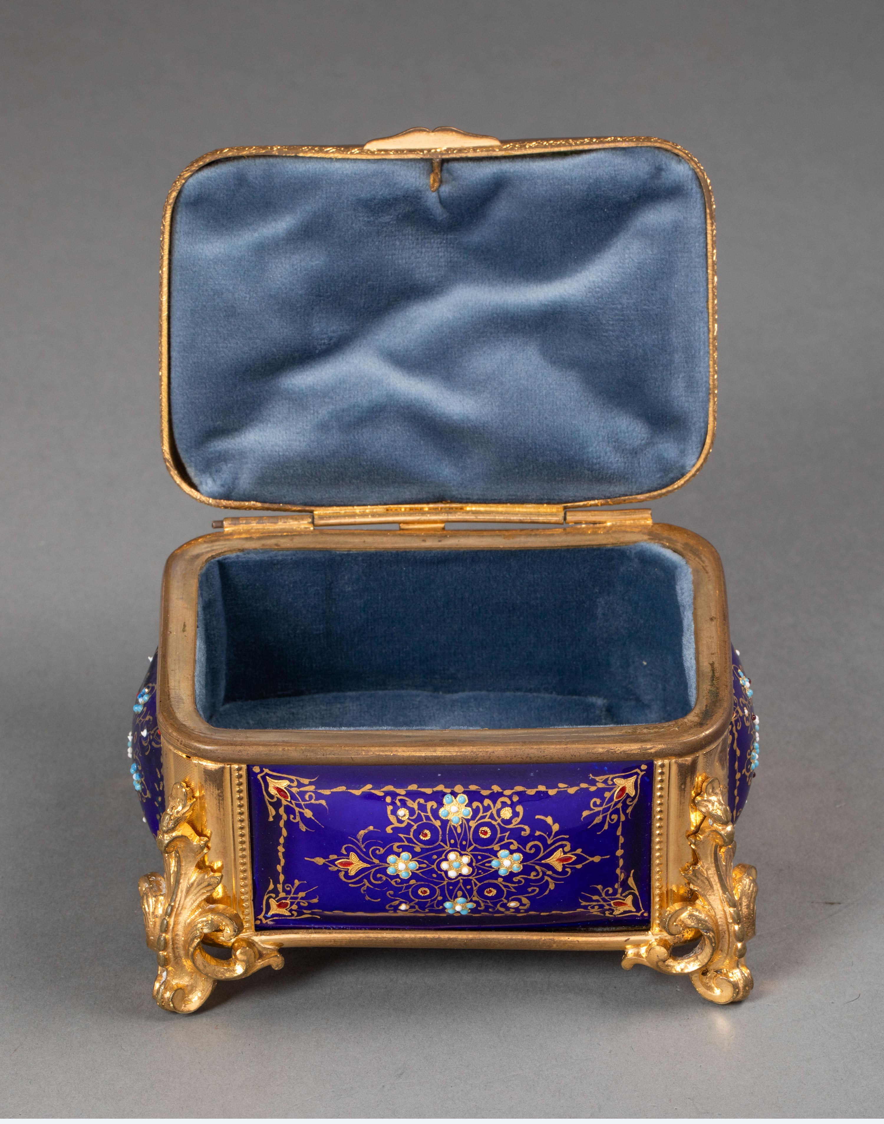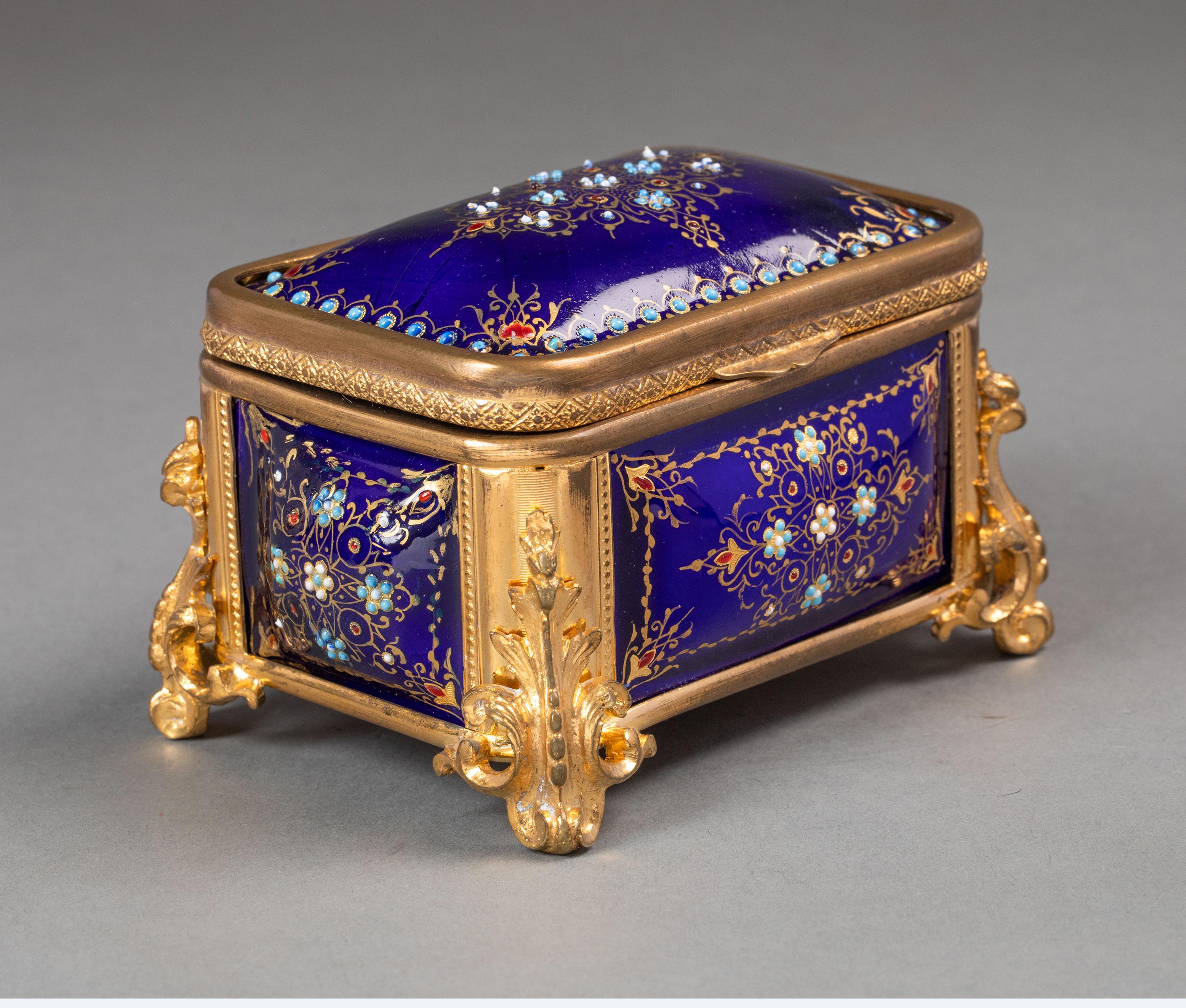 19世纪末法国出品铜鎏金精雕修饰卷叶花卉主题布雷松蓝色珐琅彩绘描金珍宝盒