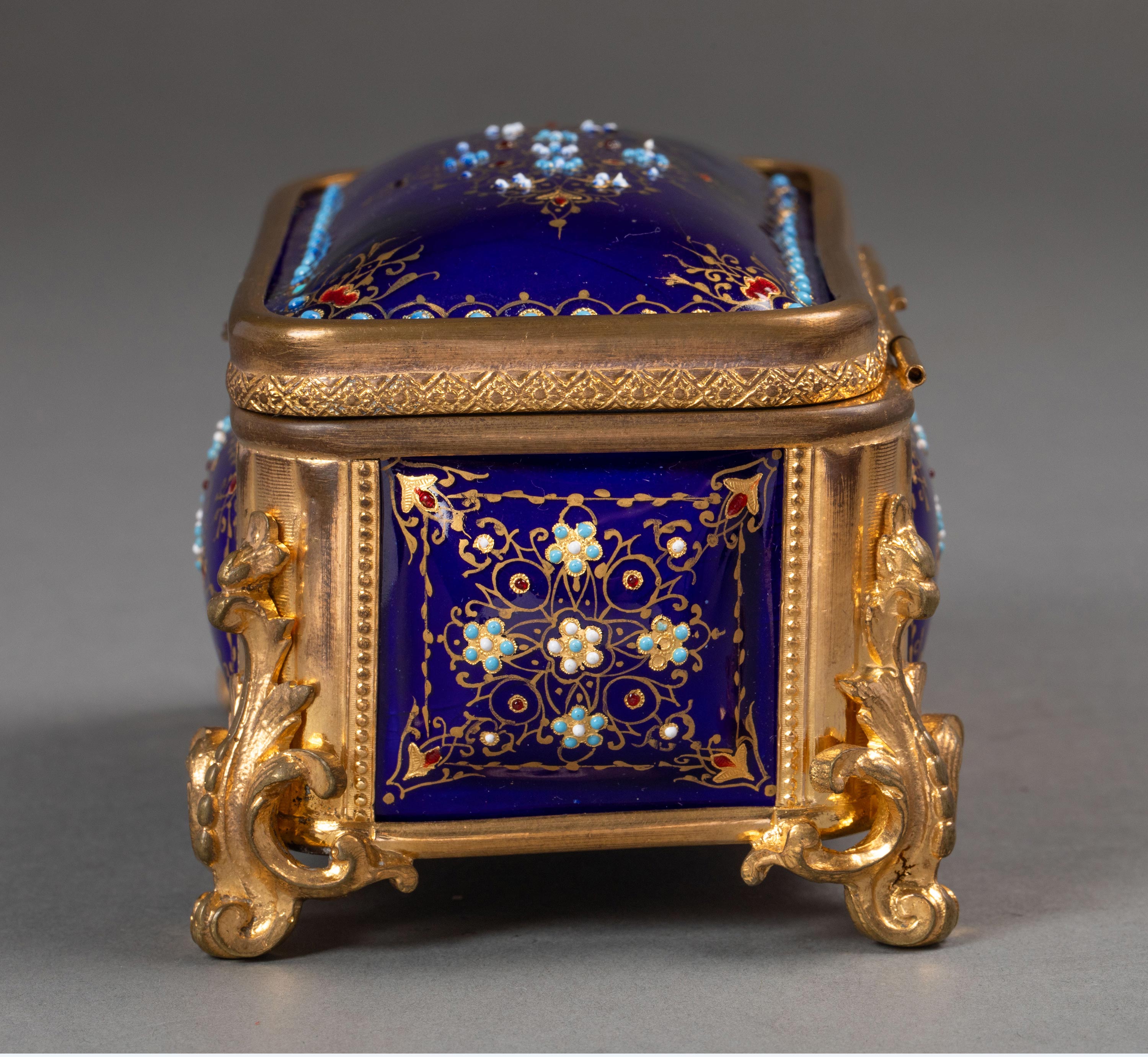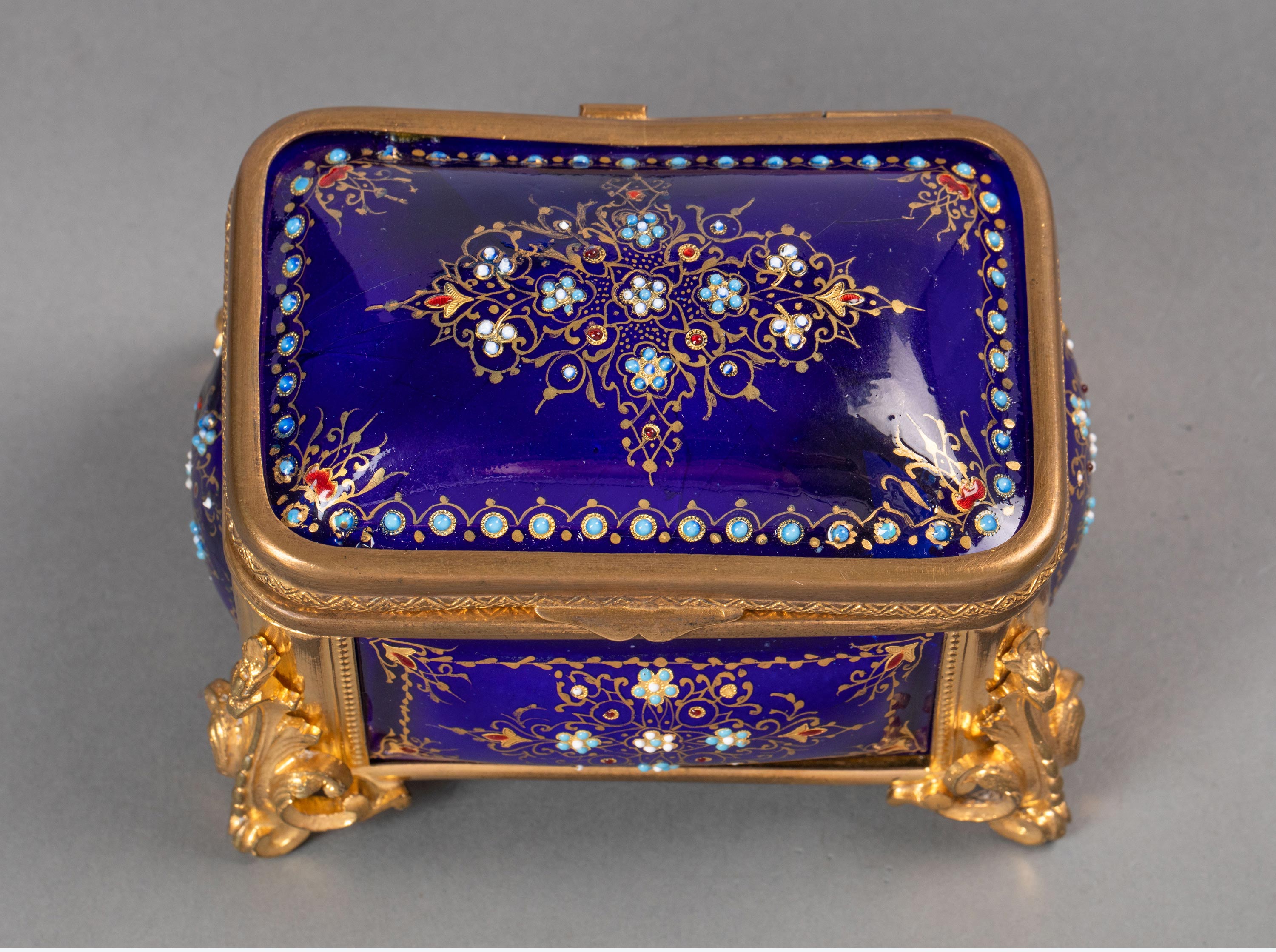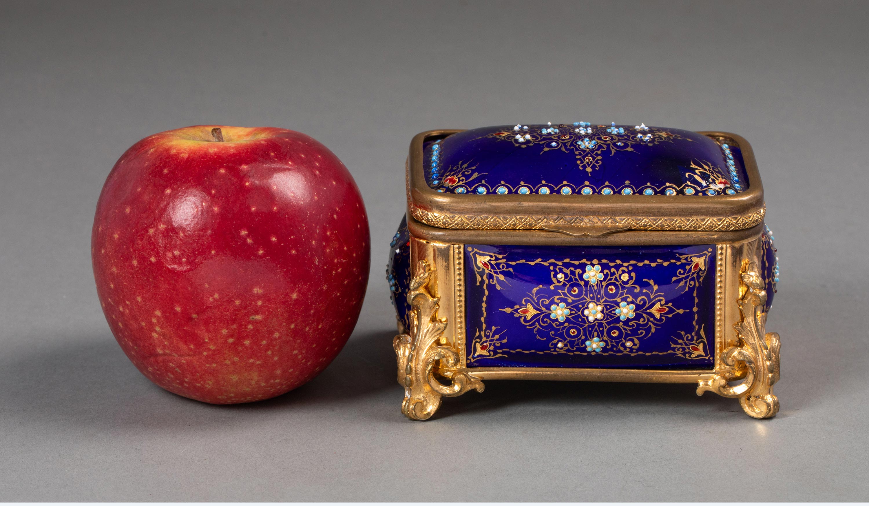 19世纪末法国出品铜鎏金精雕修饰卷叶花卉主题布雷松蓝色珐琅彩绘描金珍宝盒