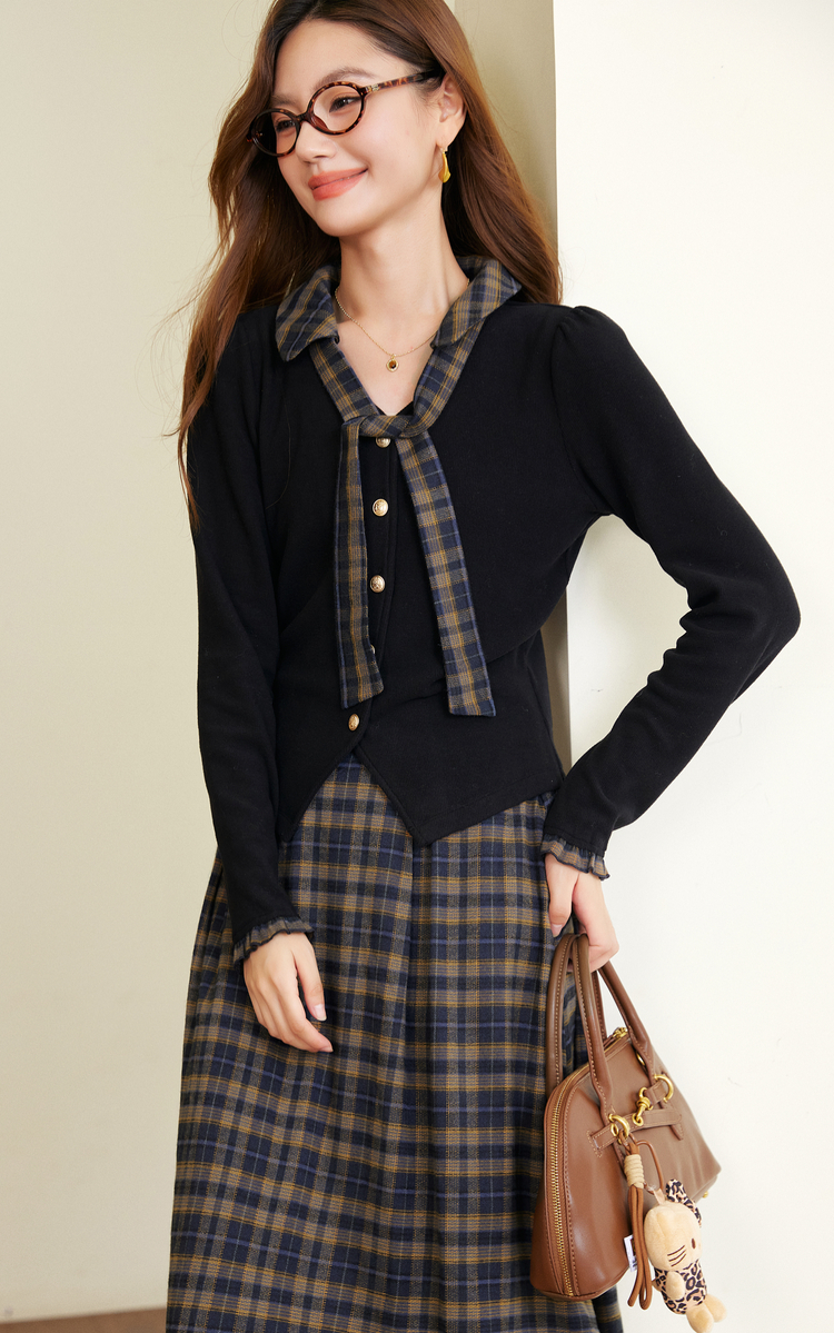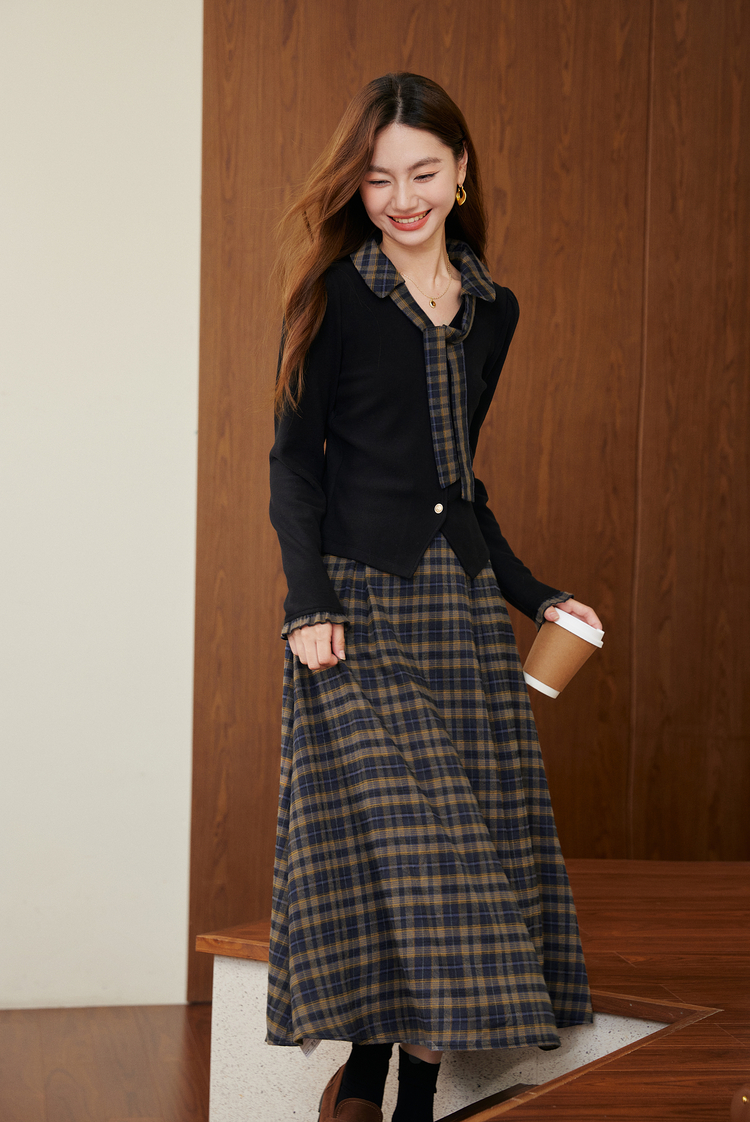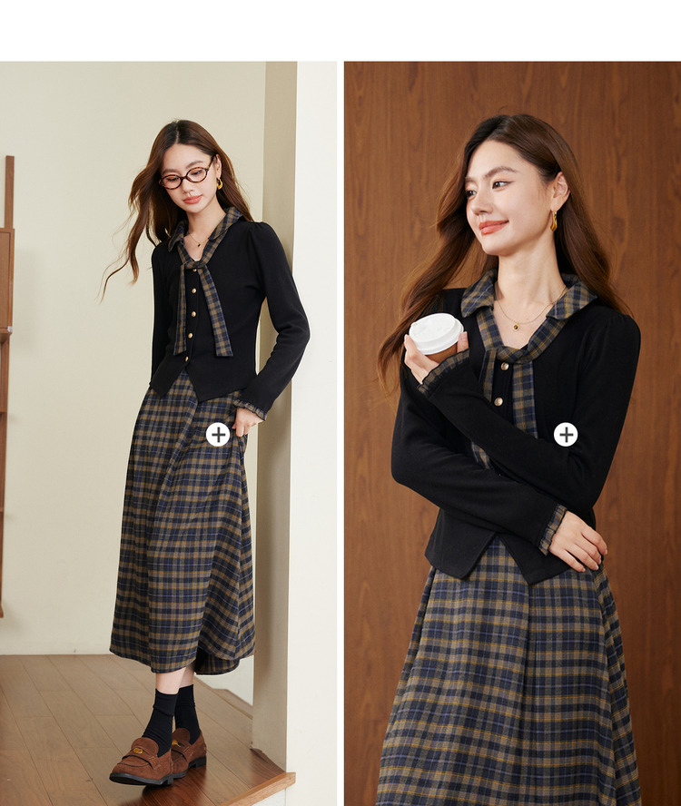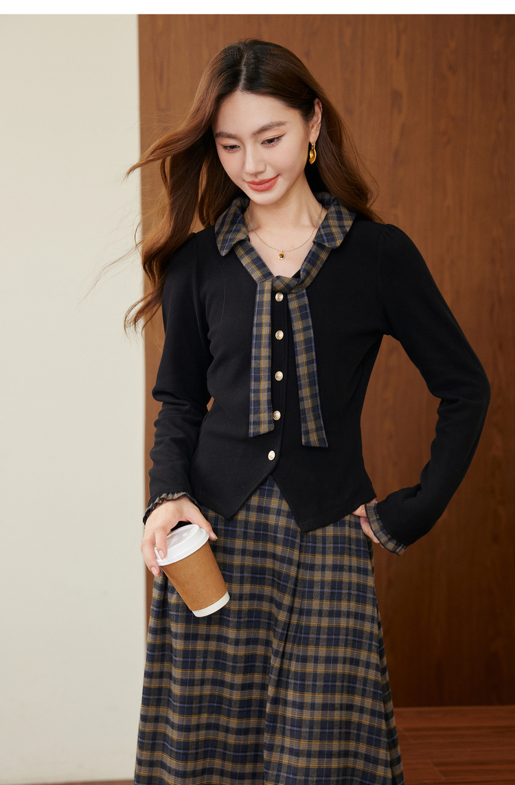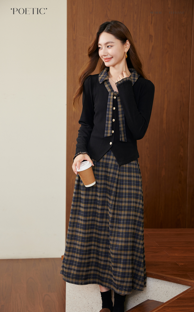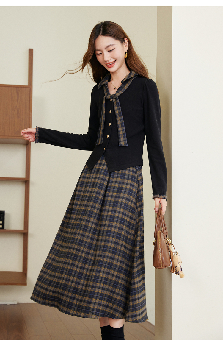 【11/26新品】熙世界彼得堡学院风套装女2025秋冬新款正肩T恤格纹半身裙两件套