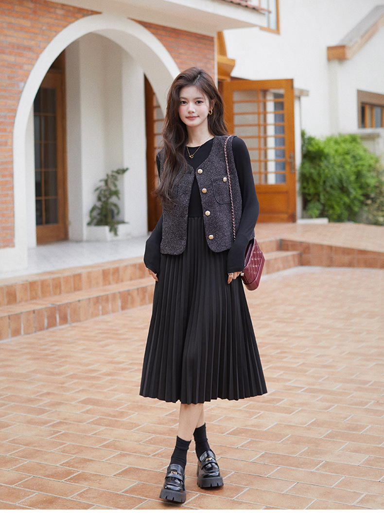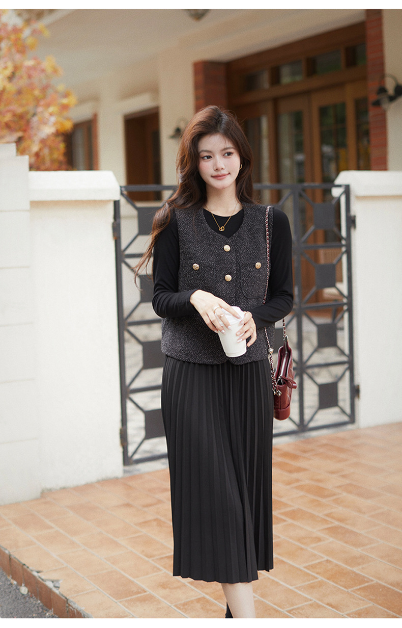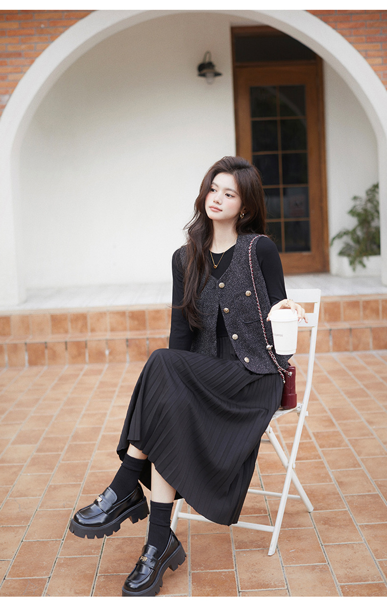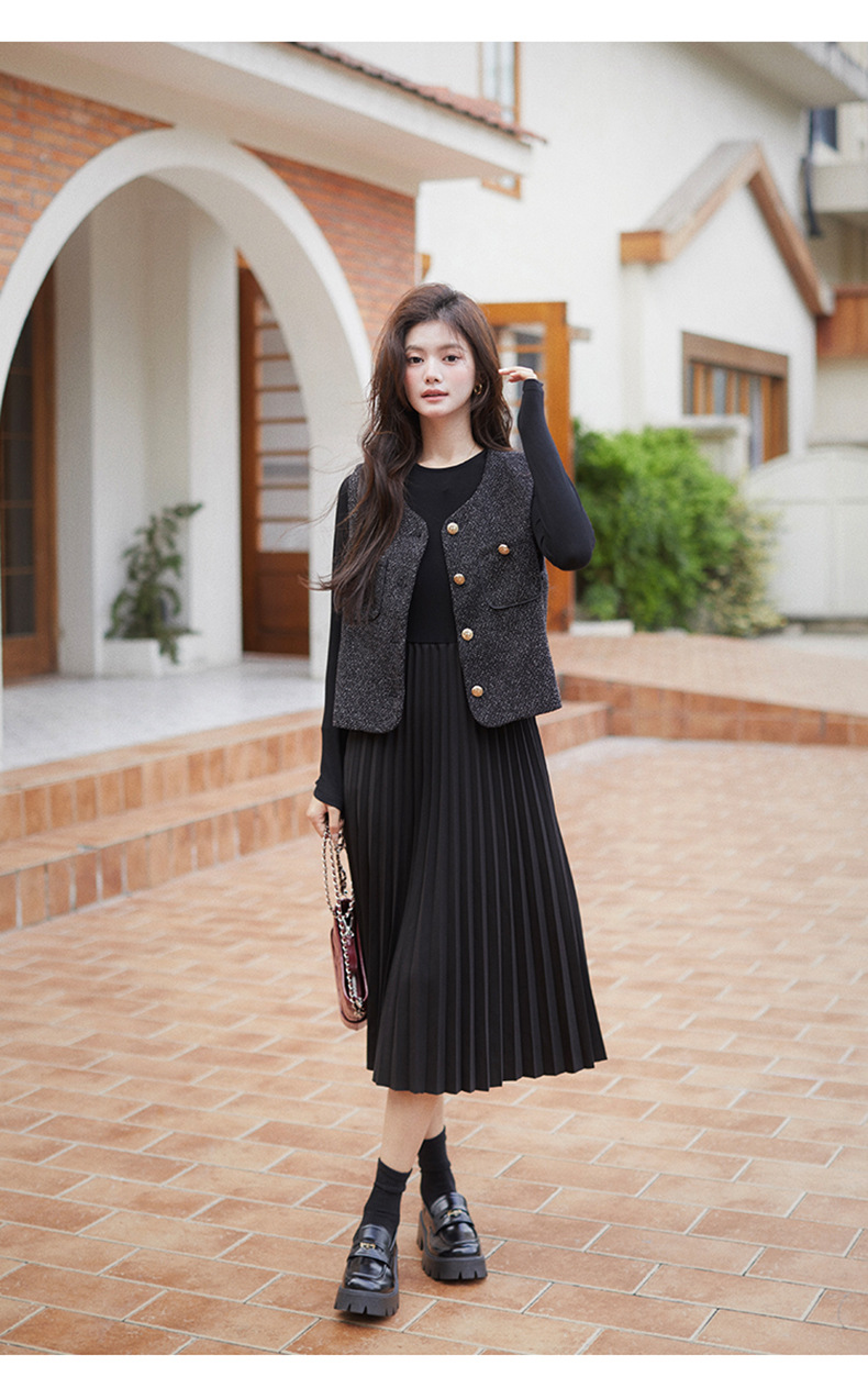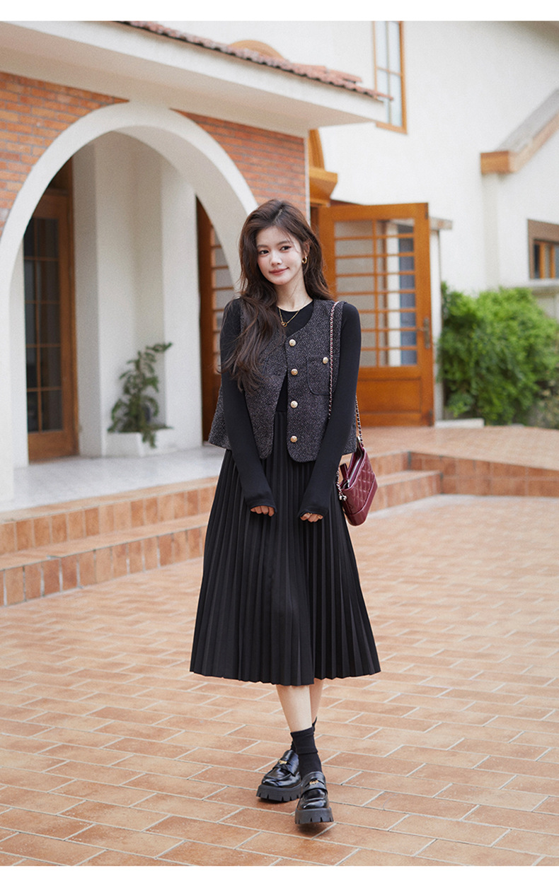 秋季新款法式氛围感小香风马甲背心气质百褶连衣裙套装HR-AIMI29998