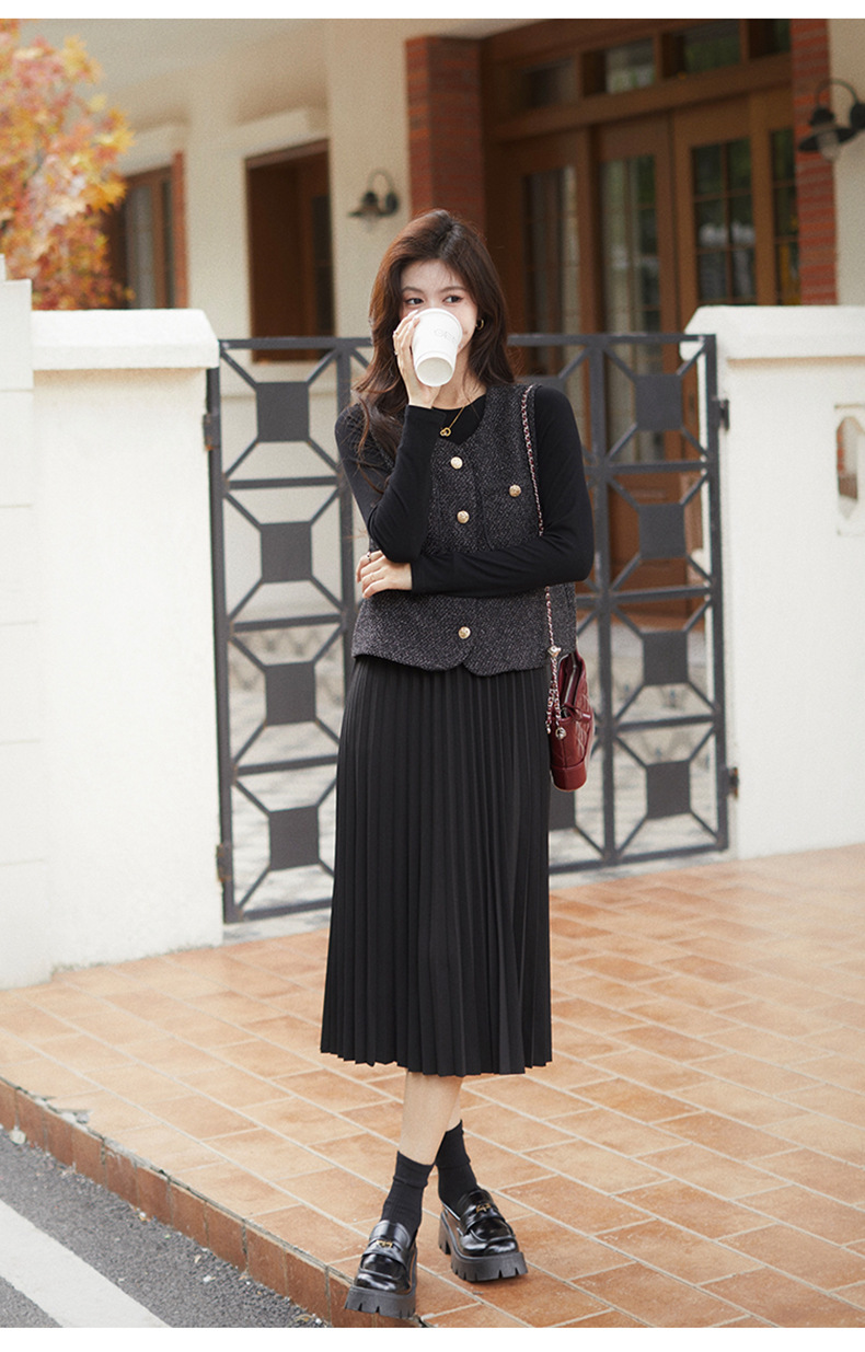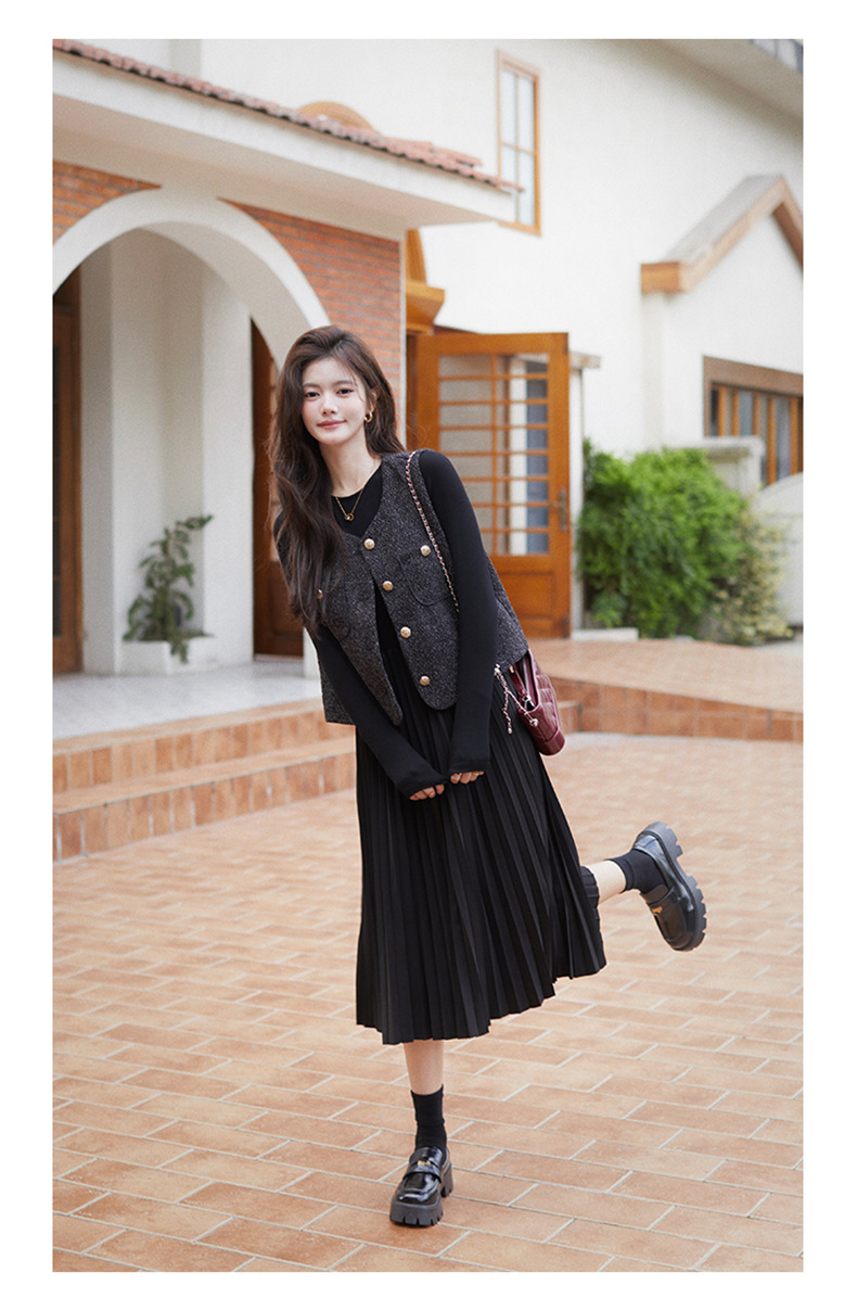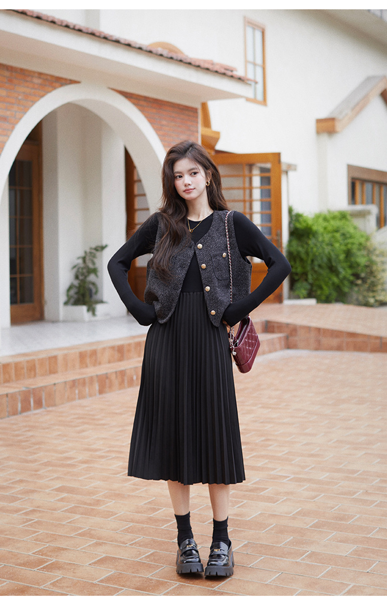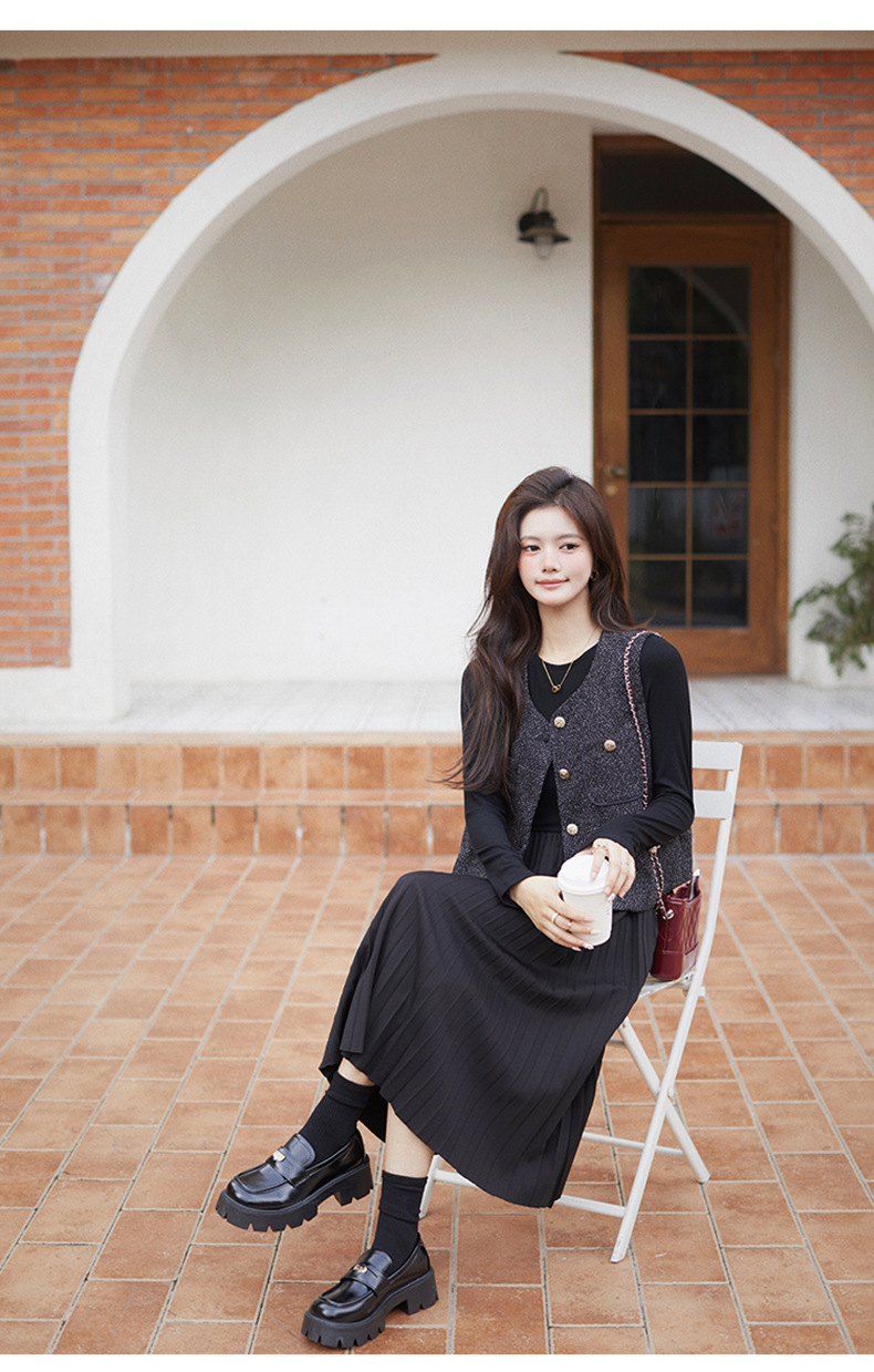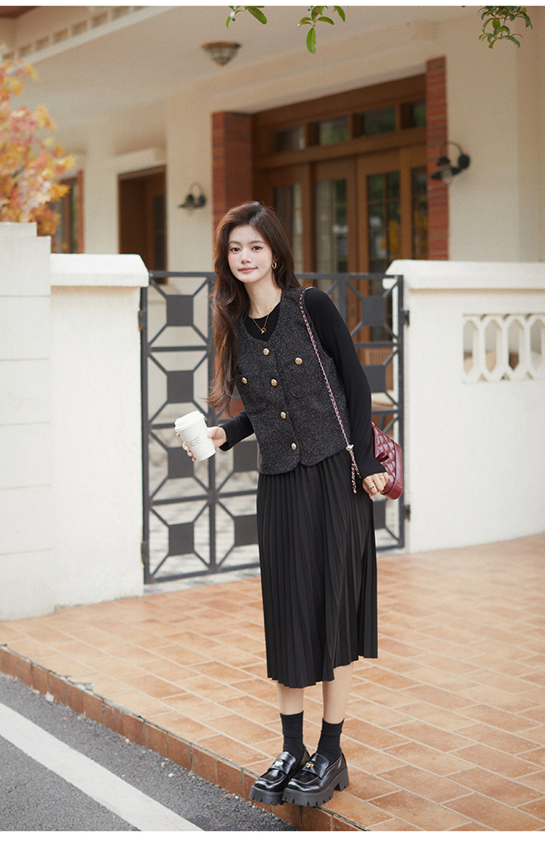 秋季新款法式氛围感小香风马甲背心气质百褶连衣裙套装HR-AIMI29998