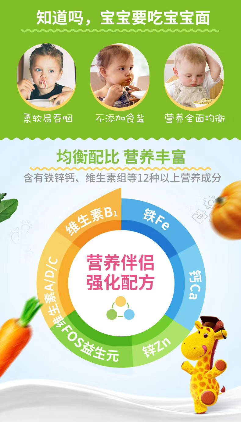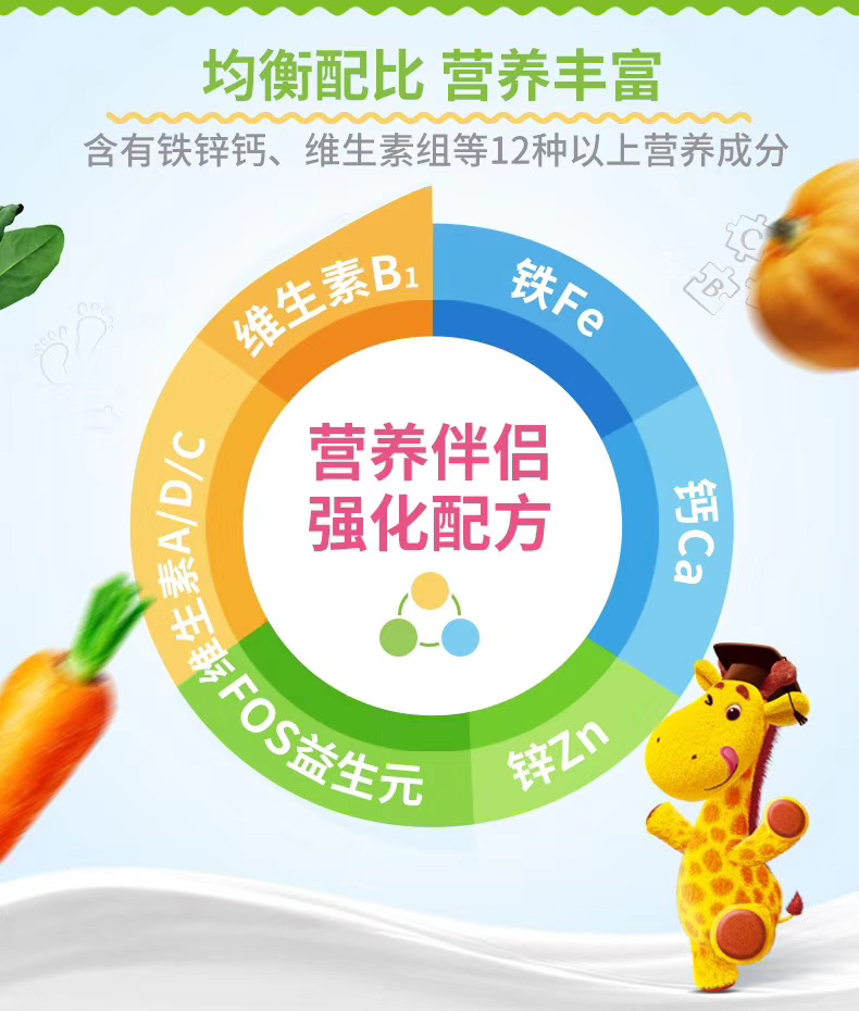 👍营养成分丰富:根据国家法规要求和宝宝的生长发育需求强化了各类维生素,和钙、铁、锌等矿物质