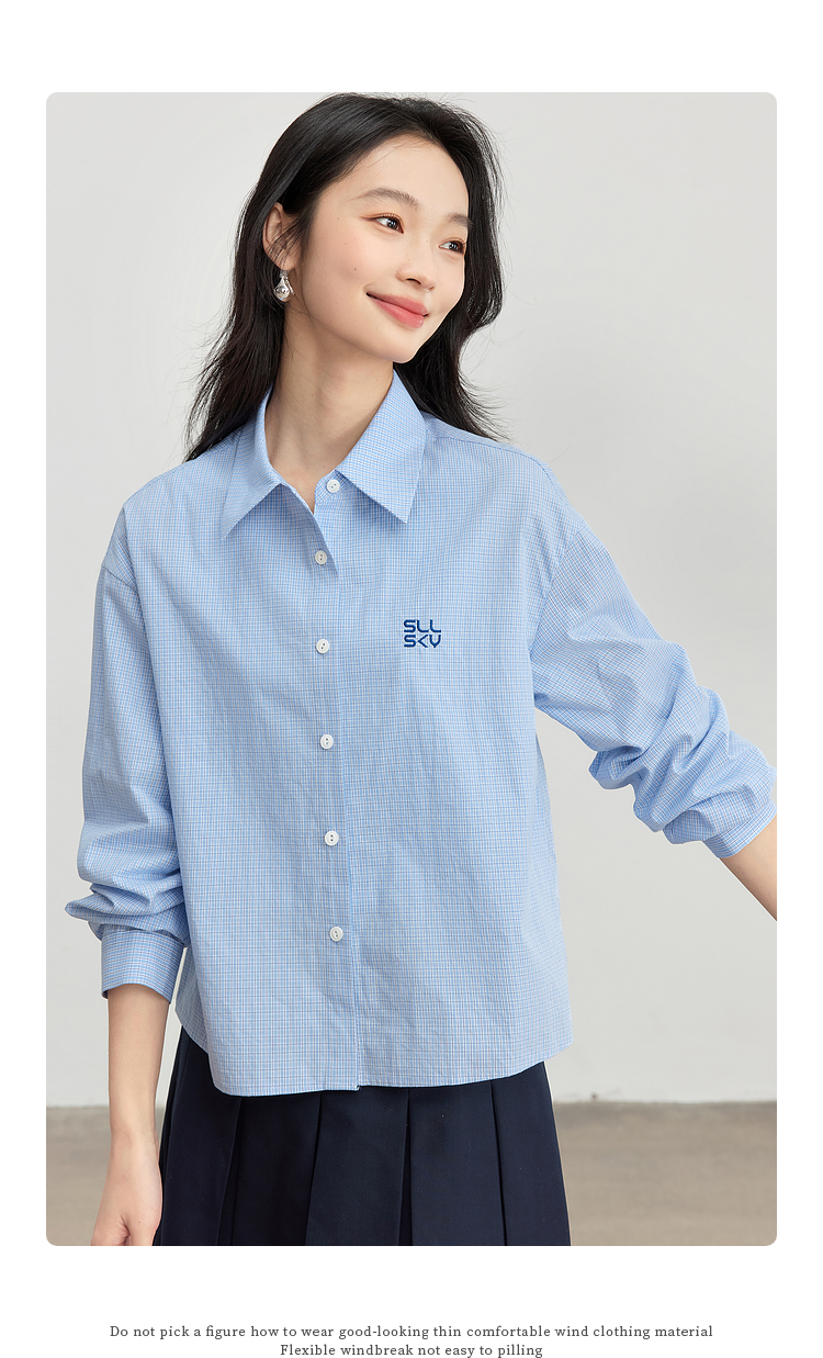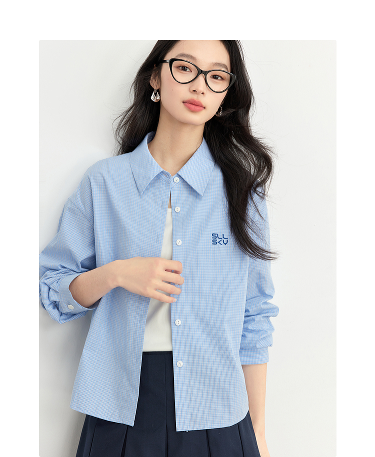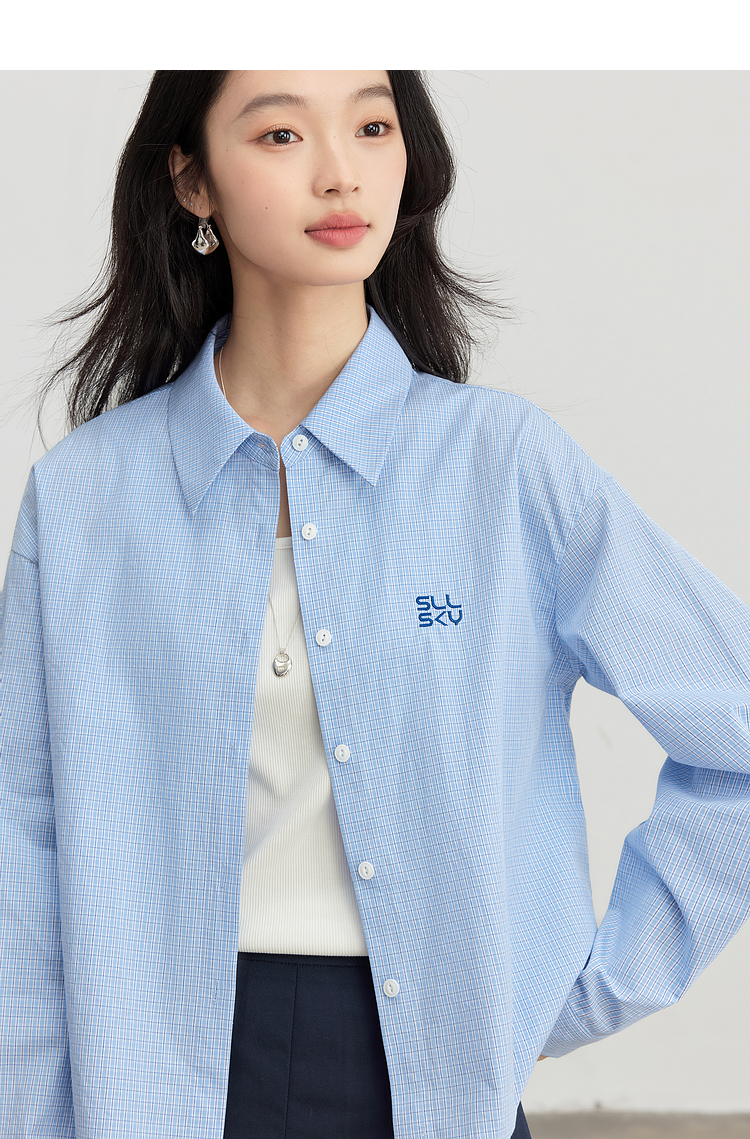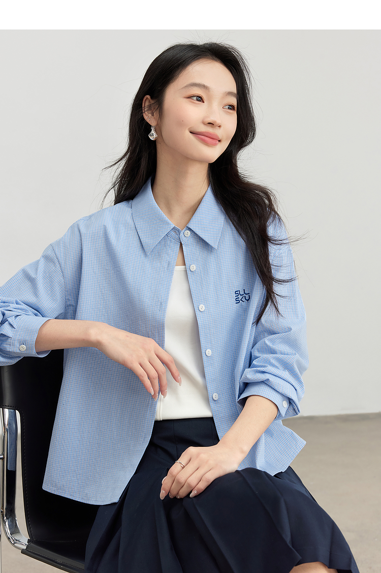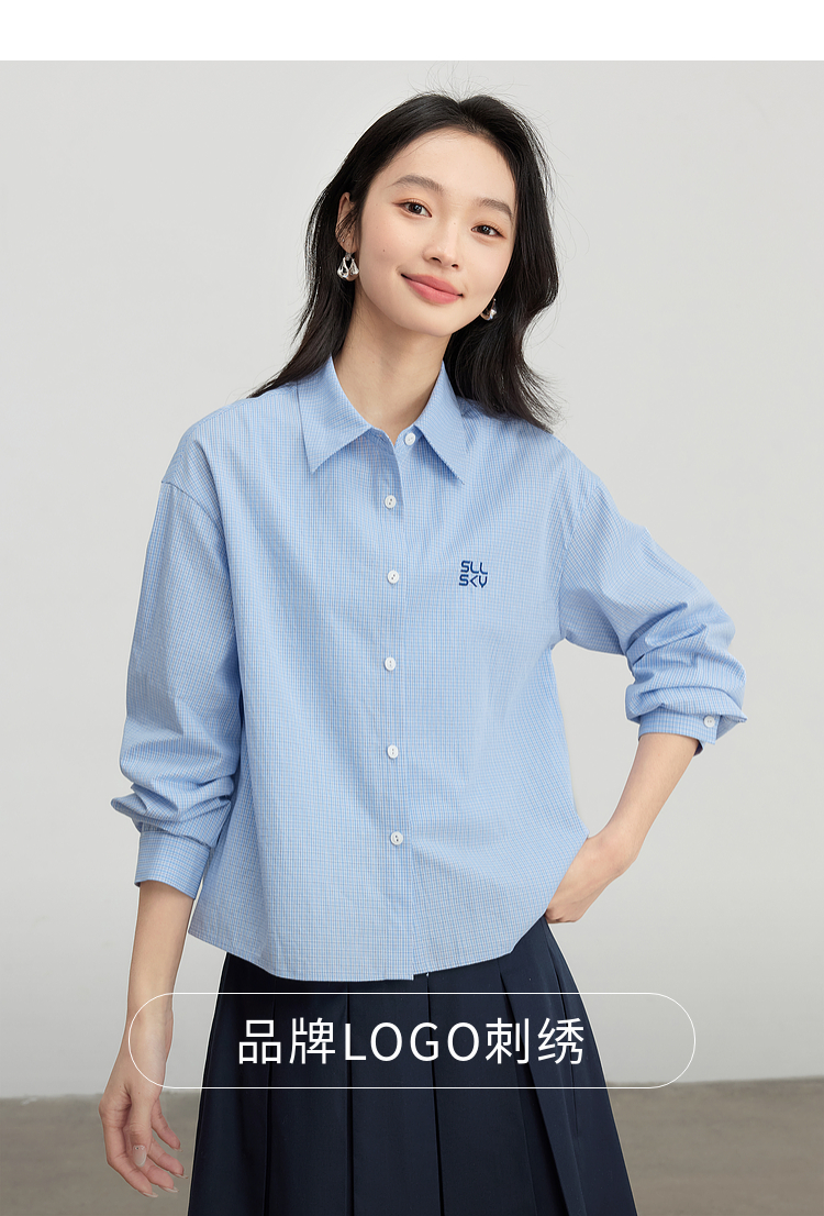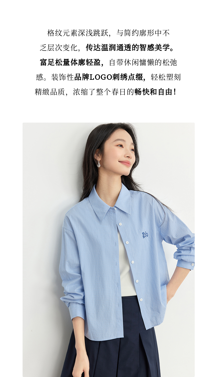 【专属特价】熙世界休闲宽松格纹衬衫女长袖2025年春季新款设计感LOGO刺绣上衣