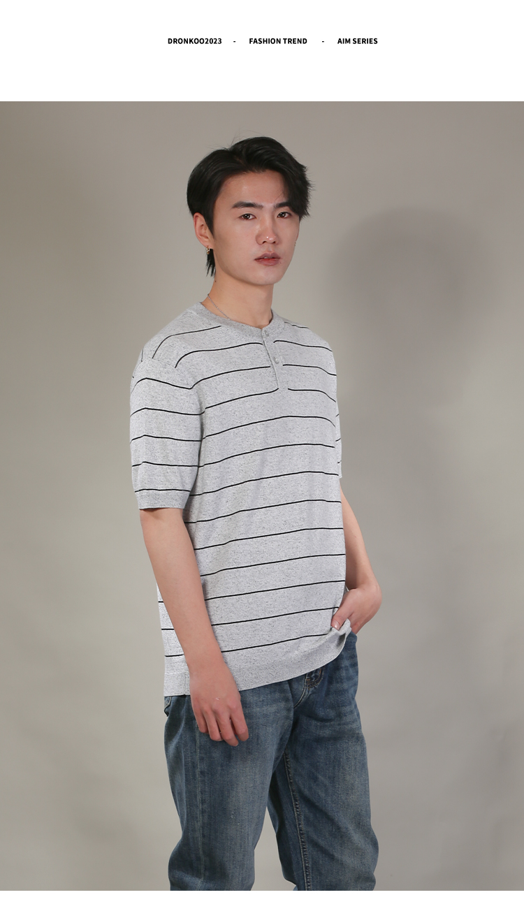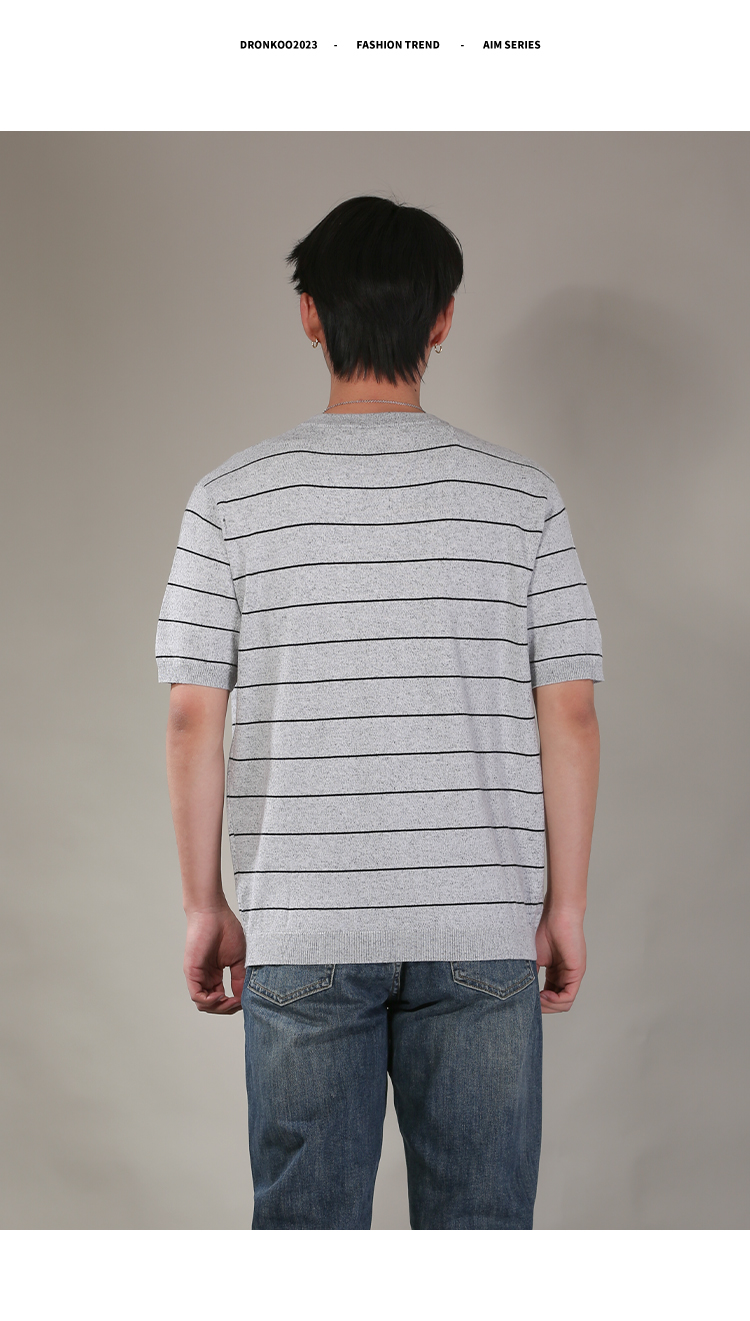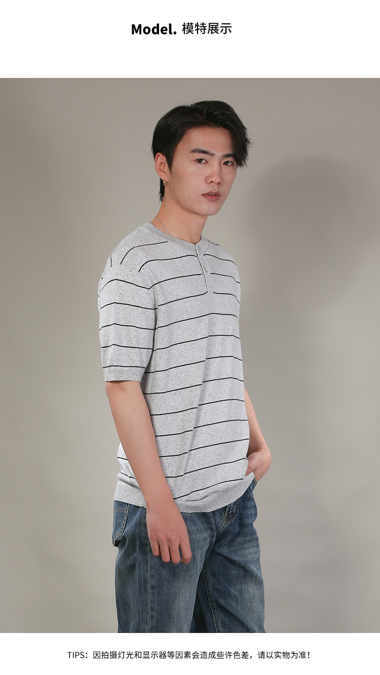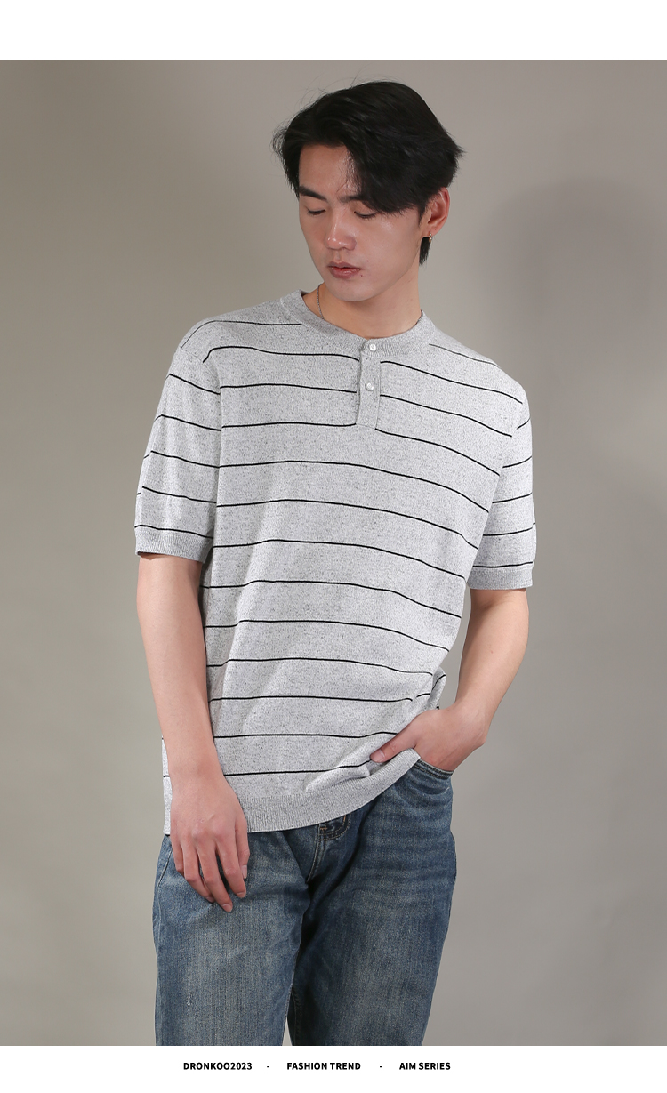 DRONKOO 2026 圆领开两粒扣细宽条纹花纱修身短袖薄毛衣