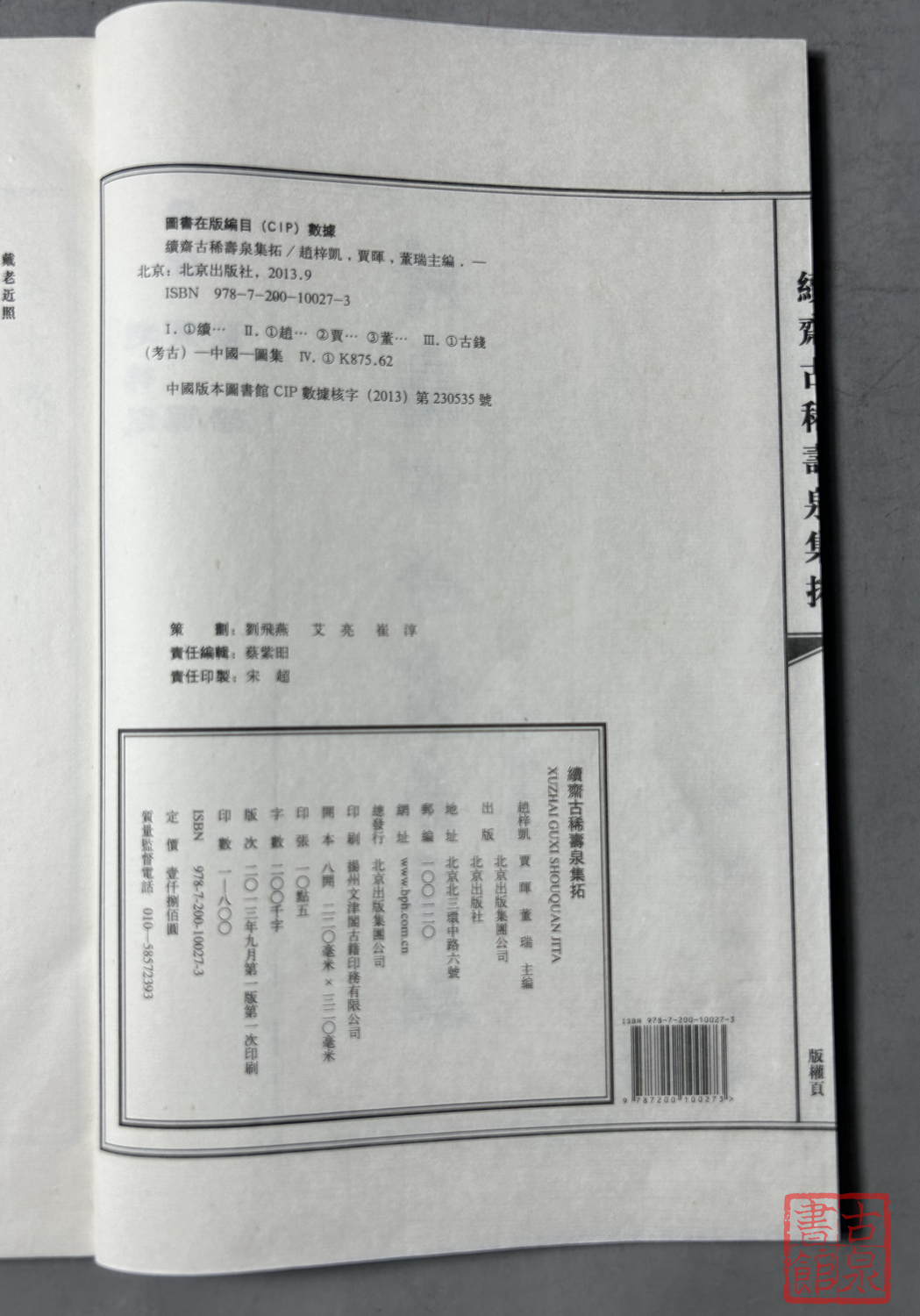 1.北京出版社。2013年9月1版1印,印量800册。宣纸双色套色印刷,带外封,是当今泉界书籍印刷的极致。