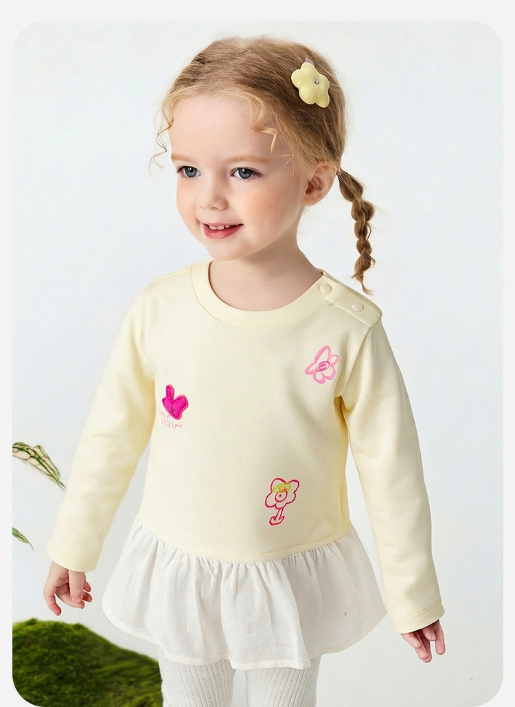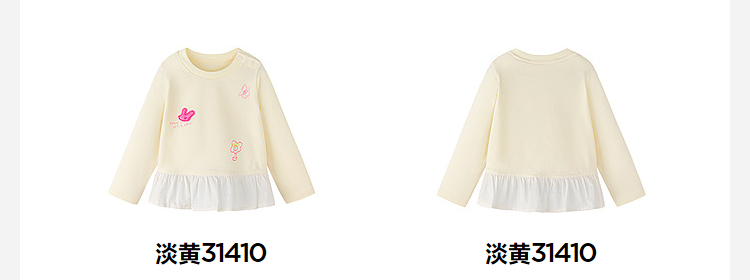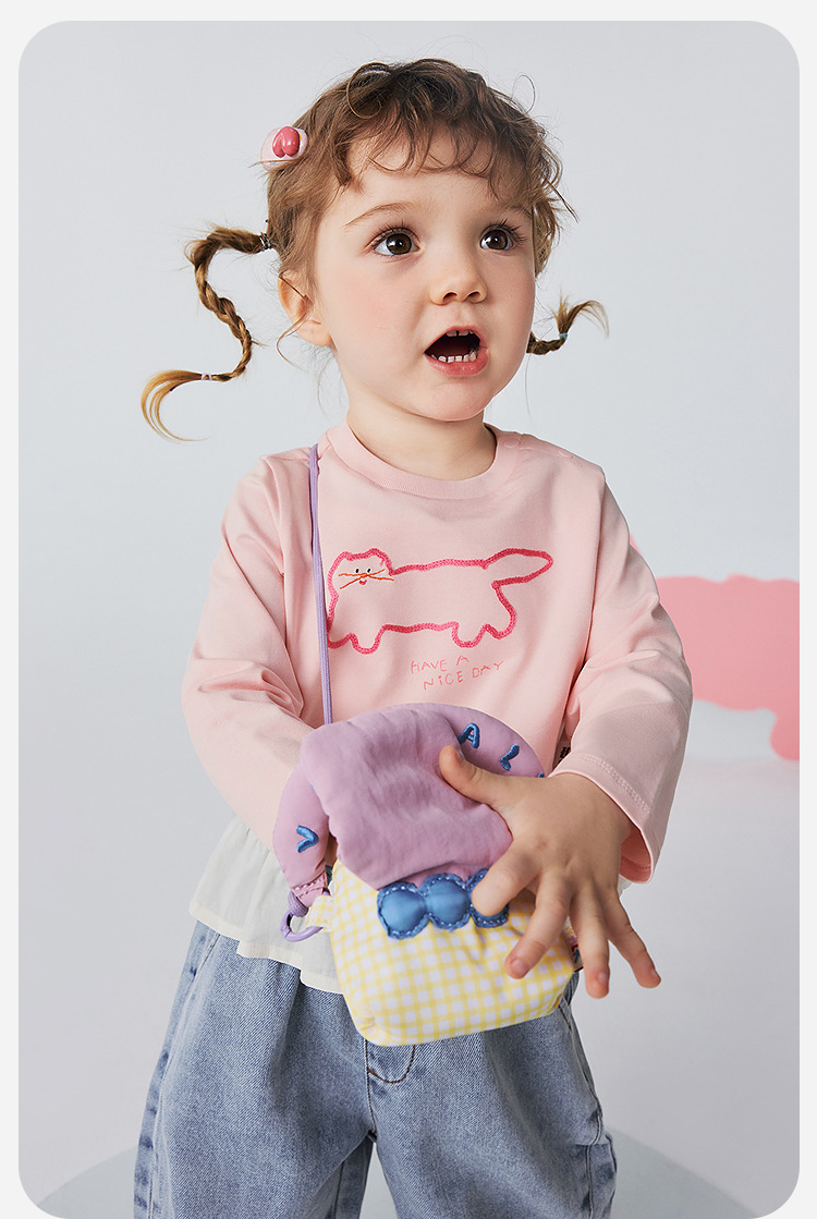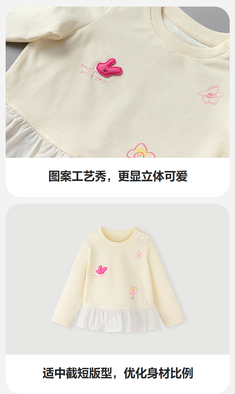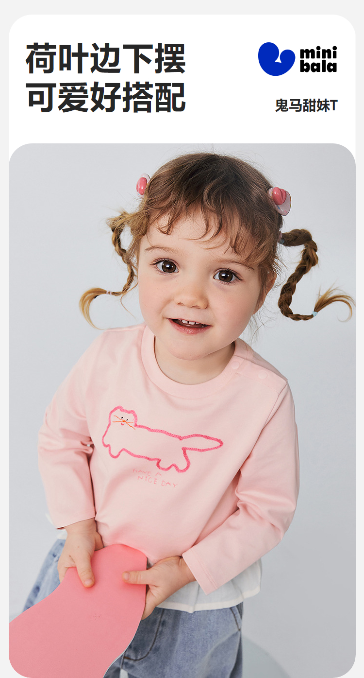 迷你巴拉女童宝宝拼接长袖T恤春新款亲肤植物纤维甜美荷叶边上衣