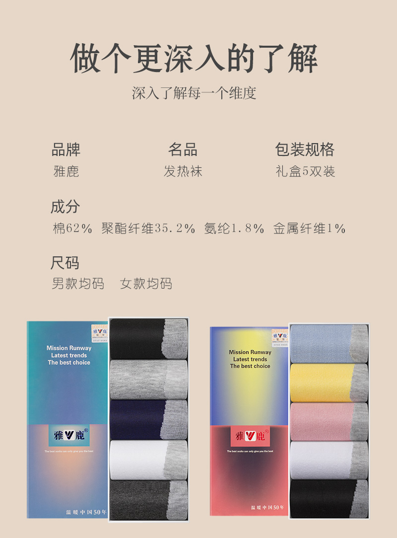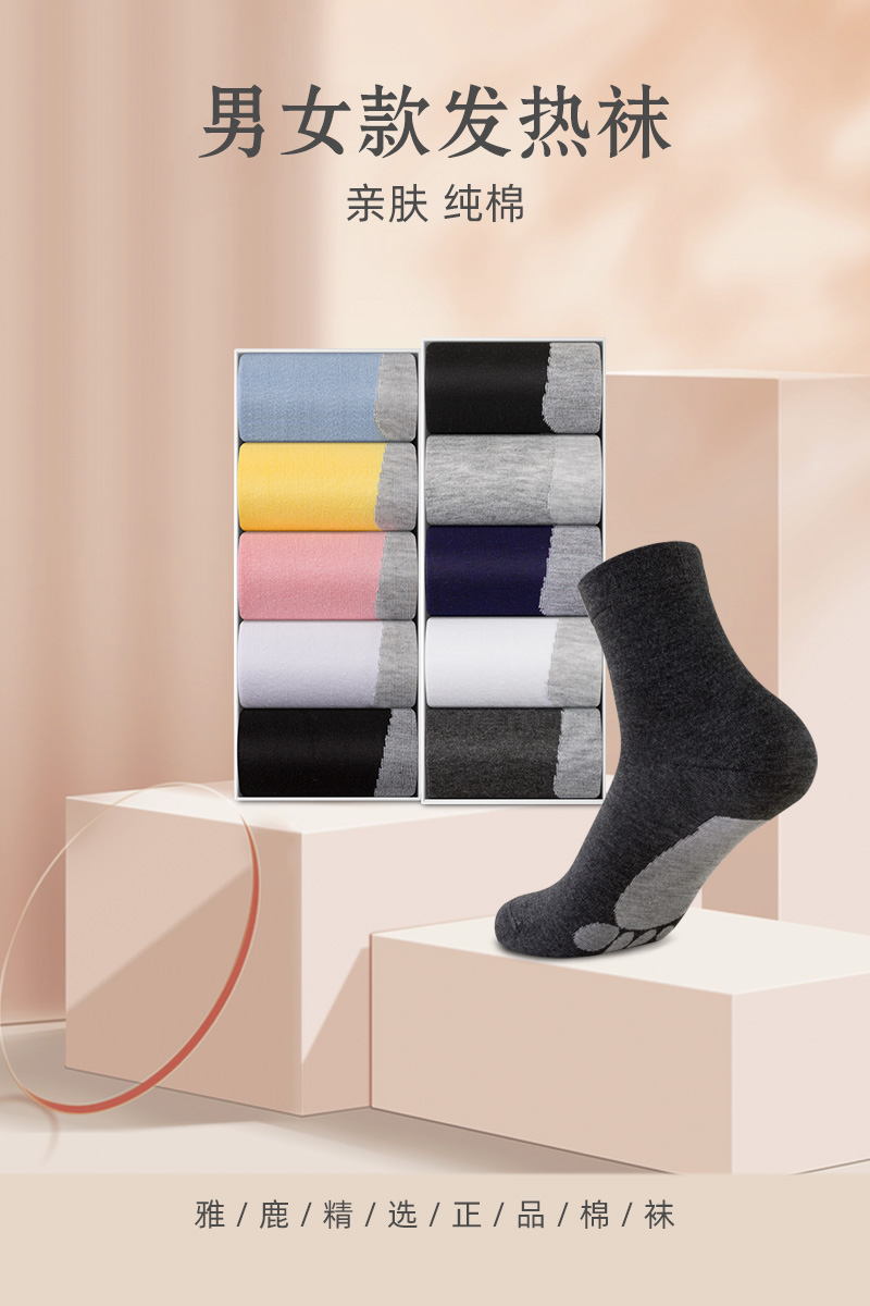 【品名】:雅鹿发热袜 【规格】: 5双一组/礼盒装 【品牌】:雅鹿 【款式】:女款、男款 【颜色】:固定颜色 【尺码】:均码 【发货】:吉林 【时效 】:工作日48-72小时发货,节假日顺延! 【快递】 申通极兔邮政 随机,新疆 西藏+20,北京+2 【售后标准】 1、质量问题、错发/漏发/破损等签收后24小时内验货,若有问题,请拍照,问题单+快递单【合影拍照】,单号必须【清晰可见】联系客服处理,穿洗后不售后。 2、非产品质量问题,不影响二次销售支持七天无理由退换货,运费自行承担。 3、袜子一旦穿洗后不售后,穿着摩擦后轻微起球属于正常现象不影响穿着不售后!