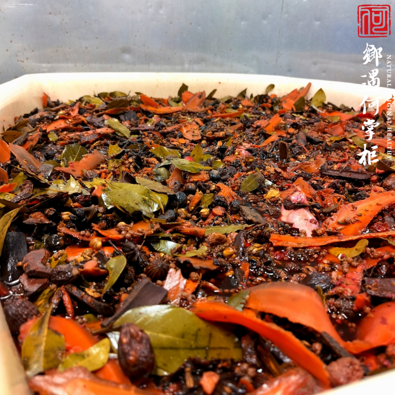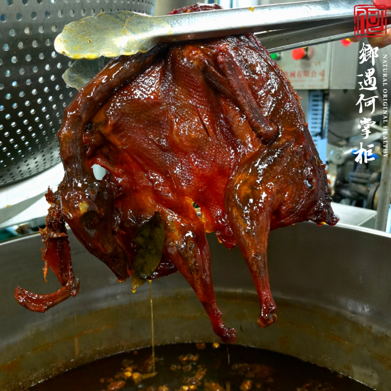 第二步:腌制。吊起晾干水分,用白扣、香叶、草果等 30多种香辛料按比例混合,反复滚揉腌制。每2小时翻缸一次,浸泡一天一夜,确保腌制均匀,达到初步的去腥入味,激发鸭子天然的肉香。
