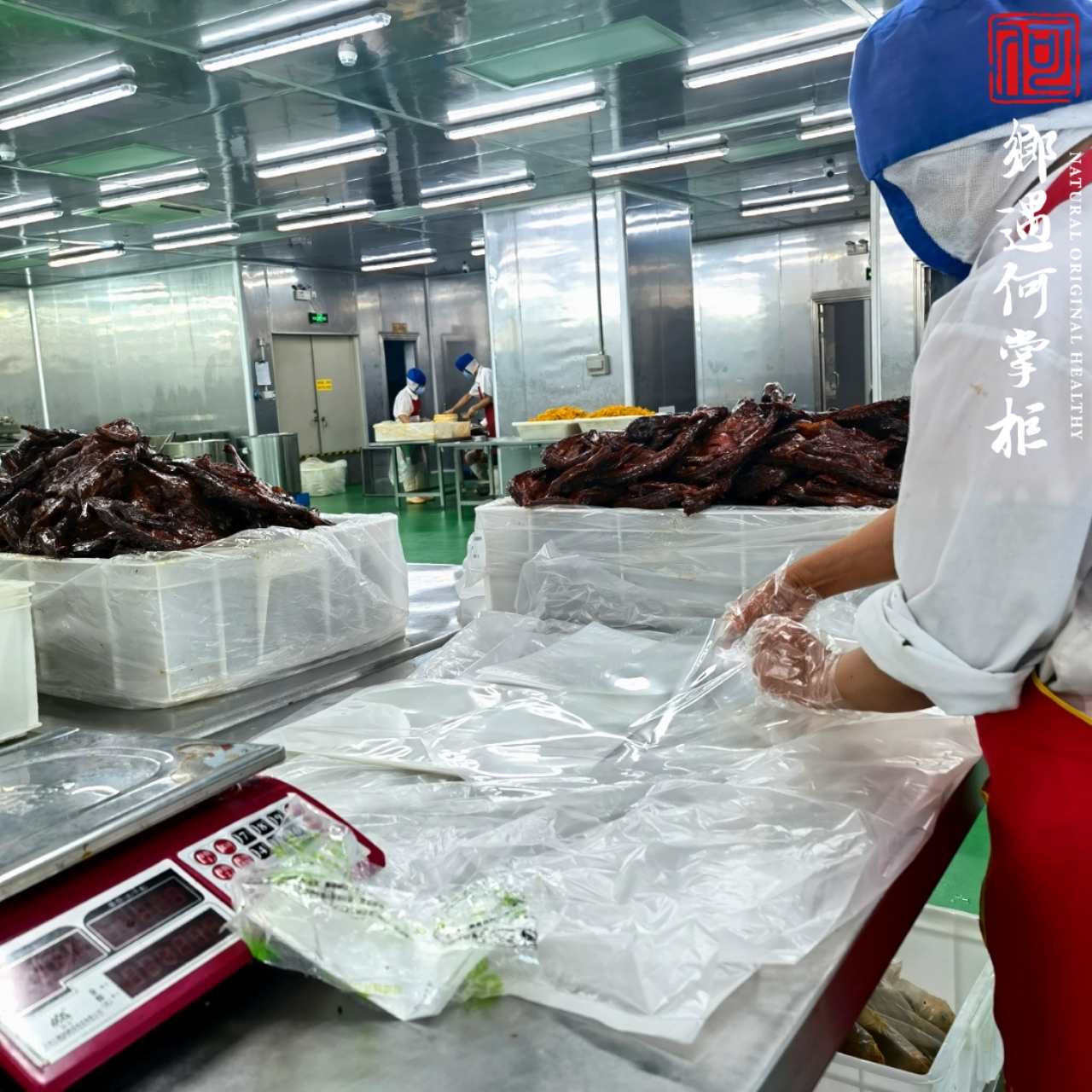第六步:包装。进入打包室,挑选完整鸭子,加内、外双层袋,防止骨头划破包装漏气,再进行真空压缩。