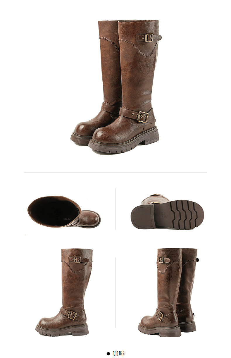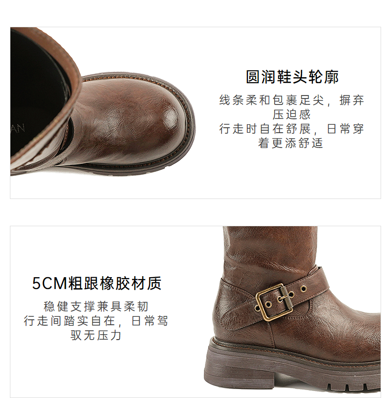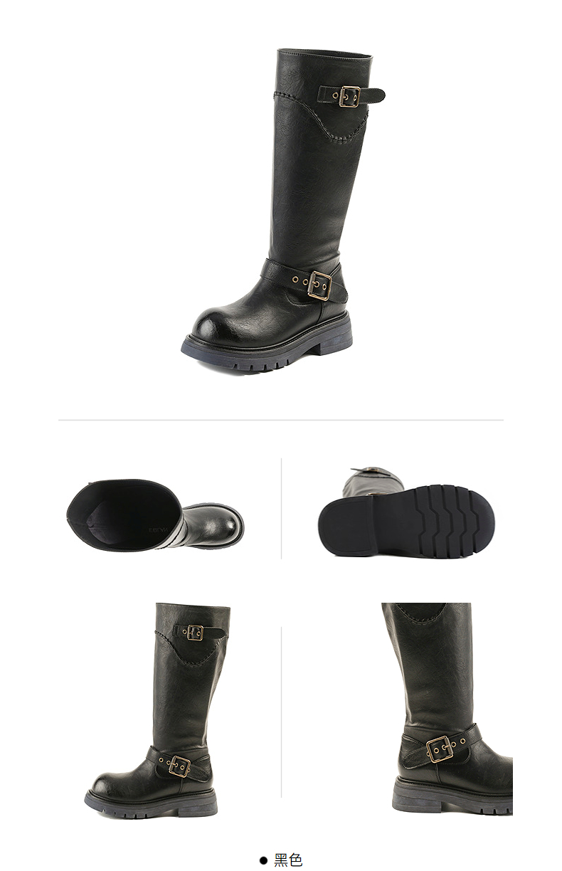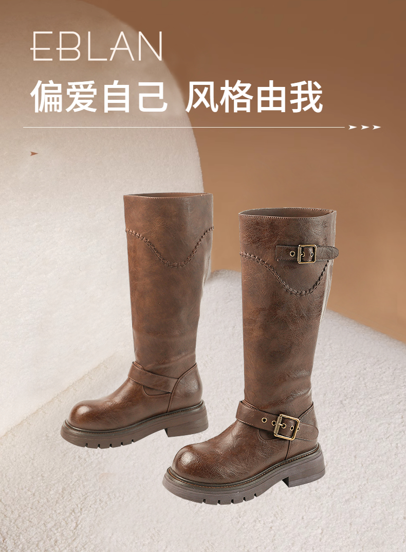 伊伴冬季机车风酷飒长筒骑士靴圆头粗跟增高B25505302