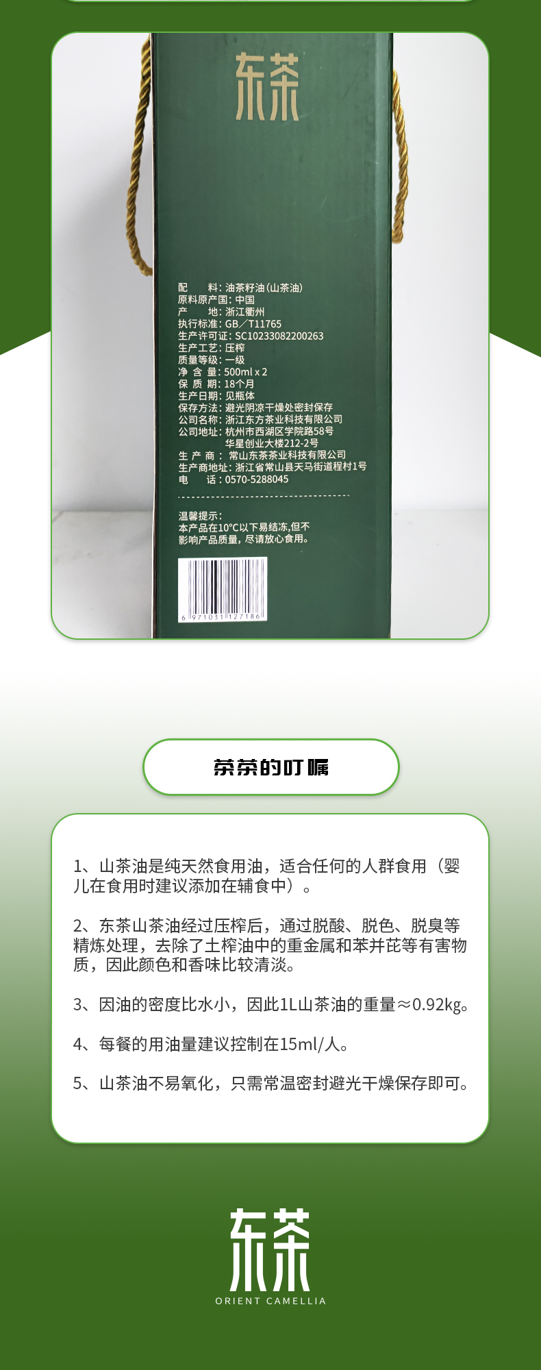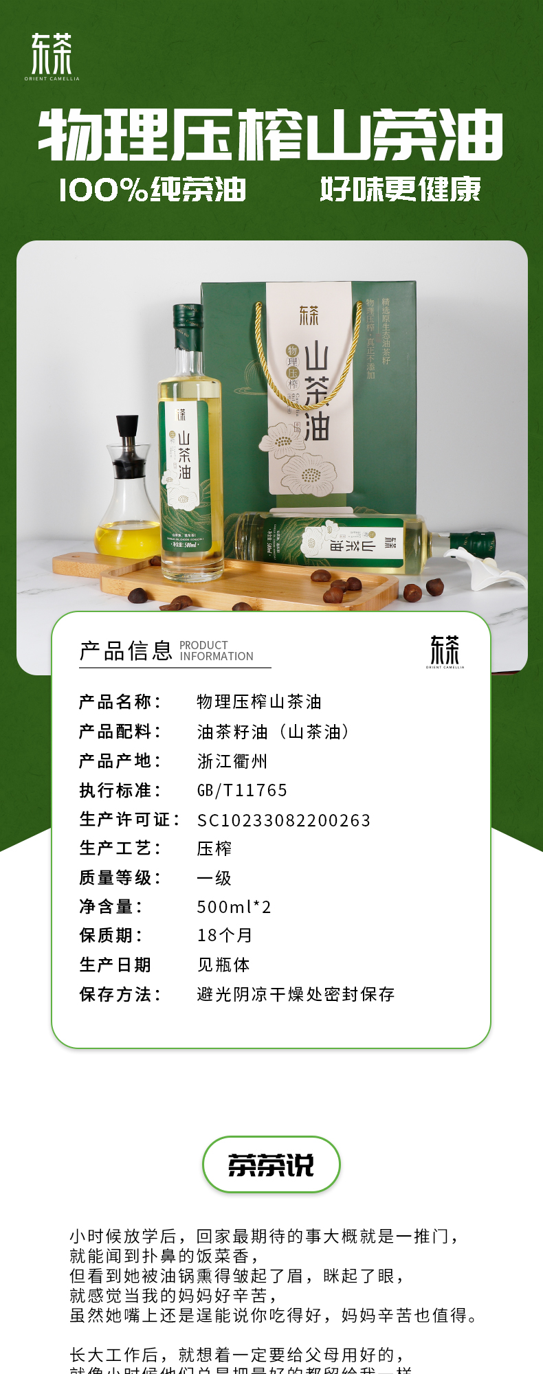 东茶物理压榨山茶油(礼盒)500ML*2
