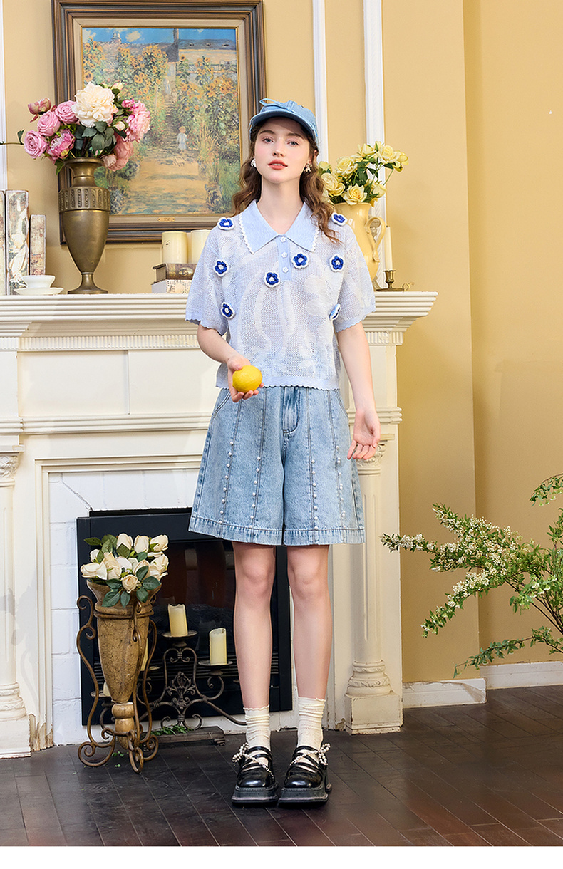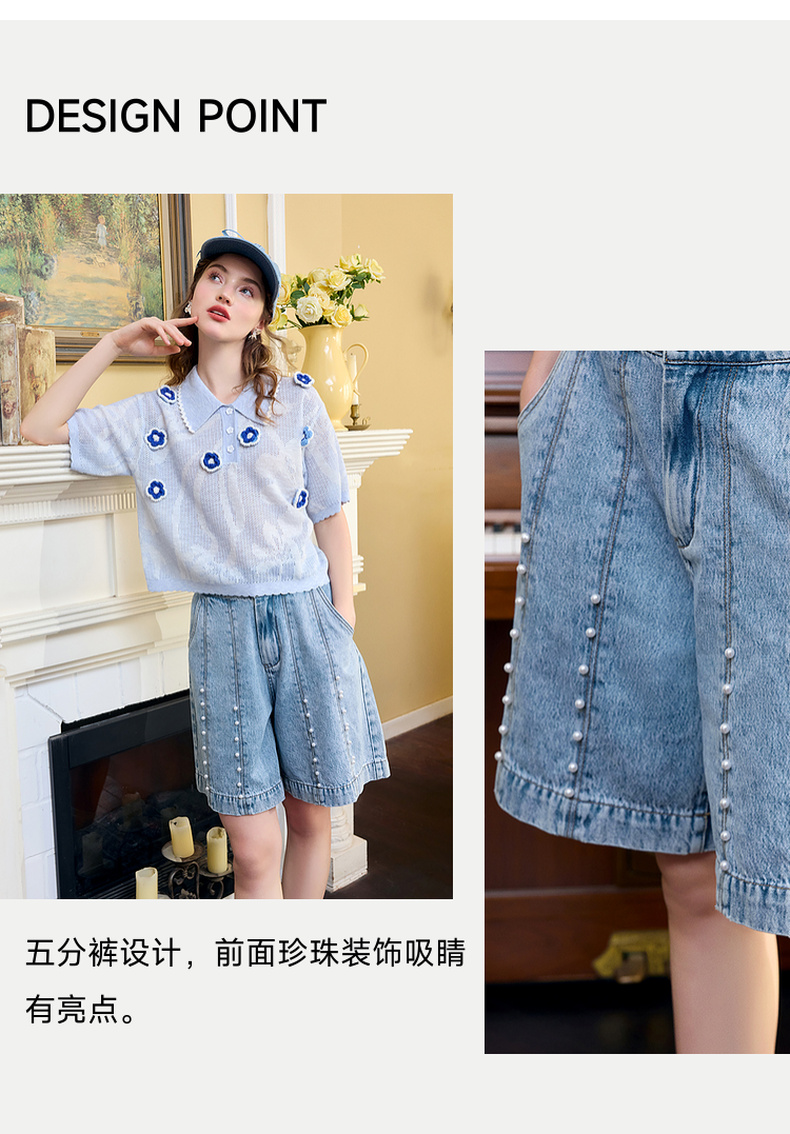 两三事 幻色灵珠 2024夏季新款休闲钉珠洗水做旧五分裤牛仔裤女