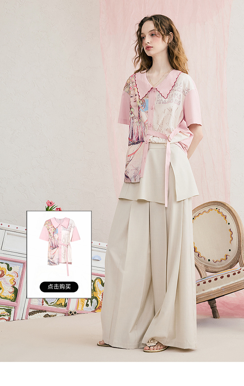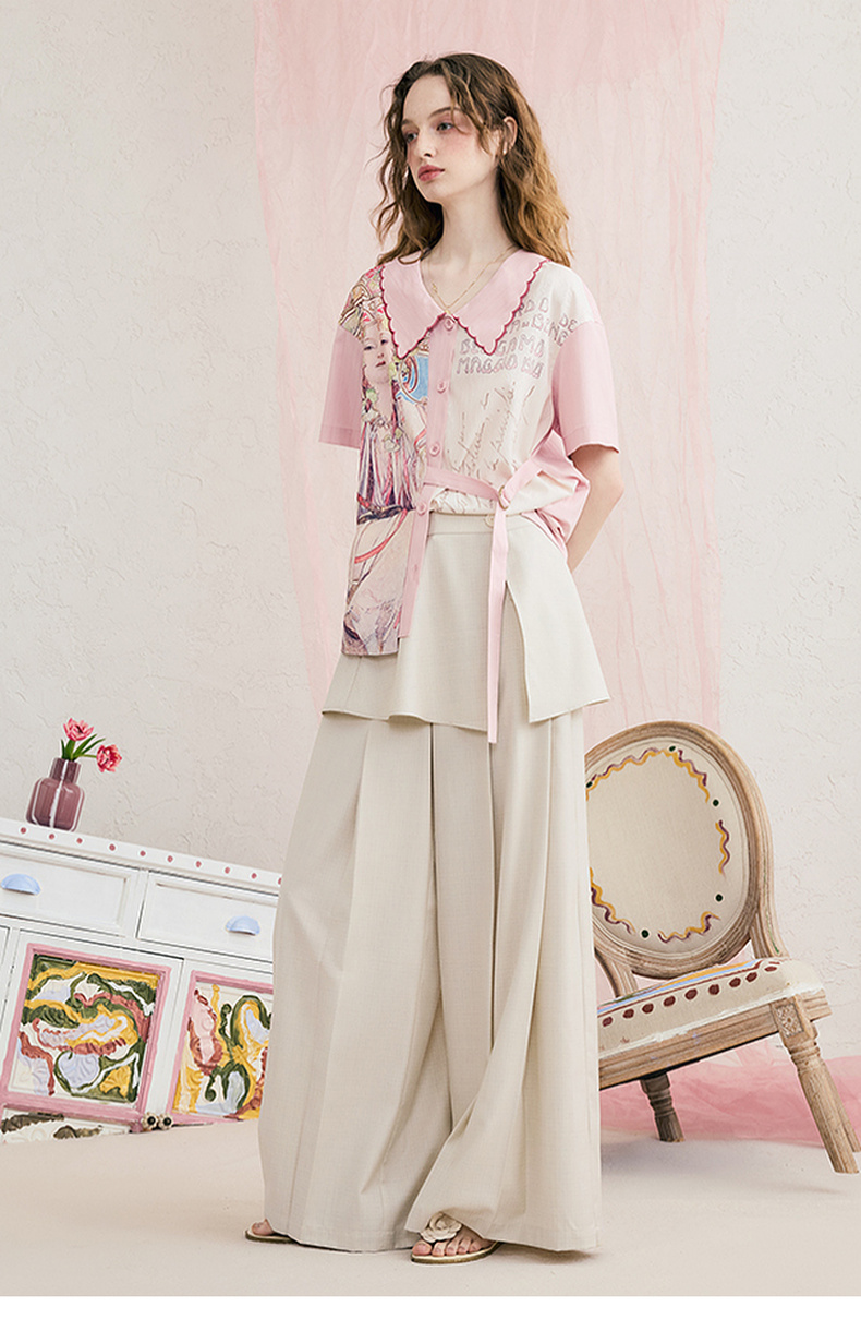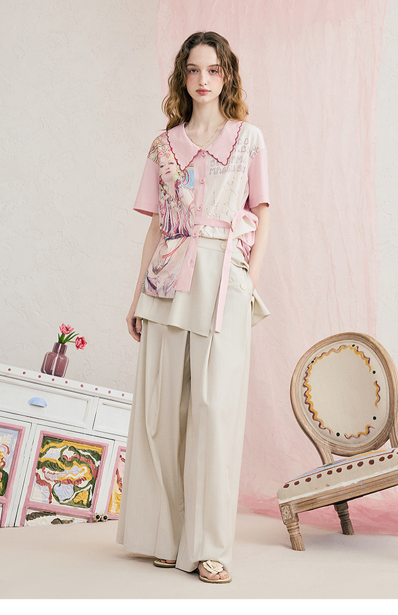T恤 两三事迷蝶把戏 夏季新款时尚印花蝴蝶结拼接纯棉短袖t恤女