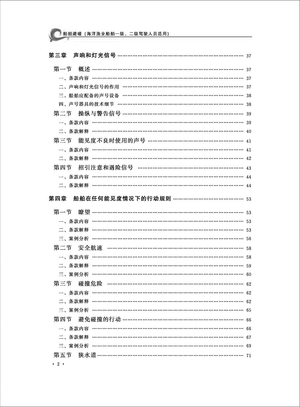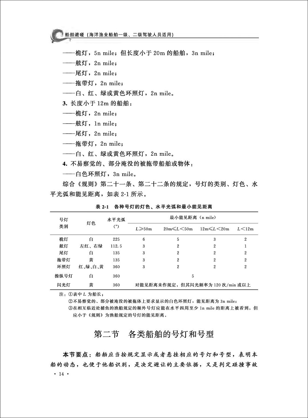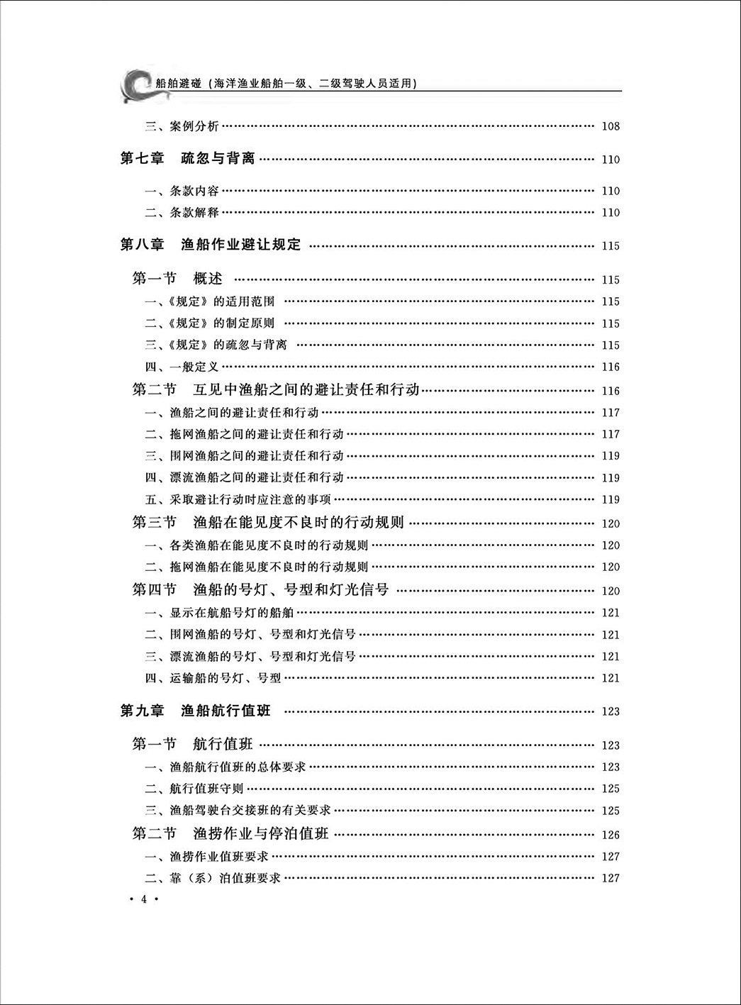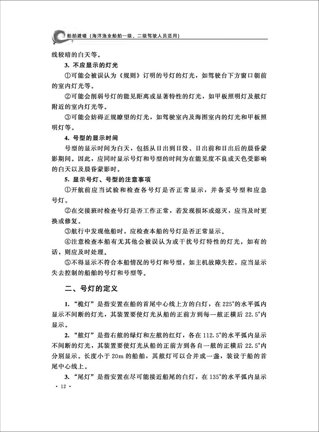 在农业部的领导下,组织有丰富教学、培训经验和渔业船舶实际工作经验的专家共同编写。该书内容包括:总则、号灯和号型、声响和灯光信息、船舶在任何能见情况下的行动规则、船舶在互见中的行动规则、船舶在能见度不良时的行动规划、疏忽与背离、渔船作业避让规定、船舶航行值班等。内容全面涵盖渔业船员考试大纲中对船舶避碰科目所要求的知识点,并结合渔业船员整体的实际情况,以岗位需求为出发点,理论联系实际,始终围绕渔业船员培训的特点,具有较强的针对性和适用性。重点突出渔业船员适任培训和航海实践所需掌握的知识和技能,适用于渔业船员的考试和培训,也可作为航海相关从业人员的业务参考书。