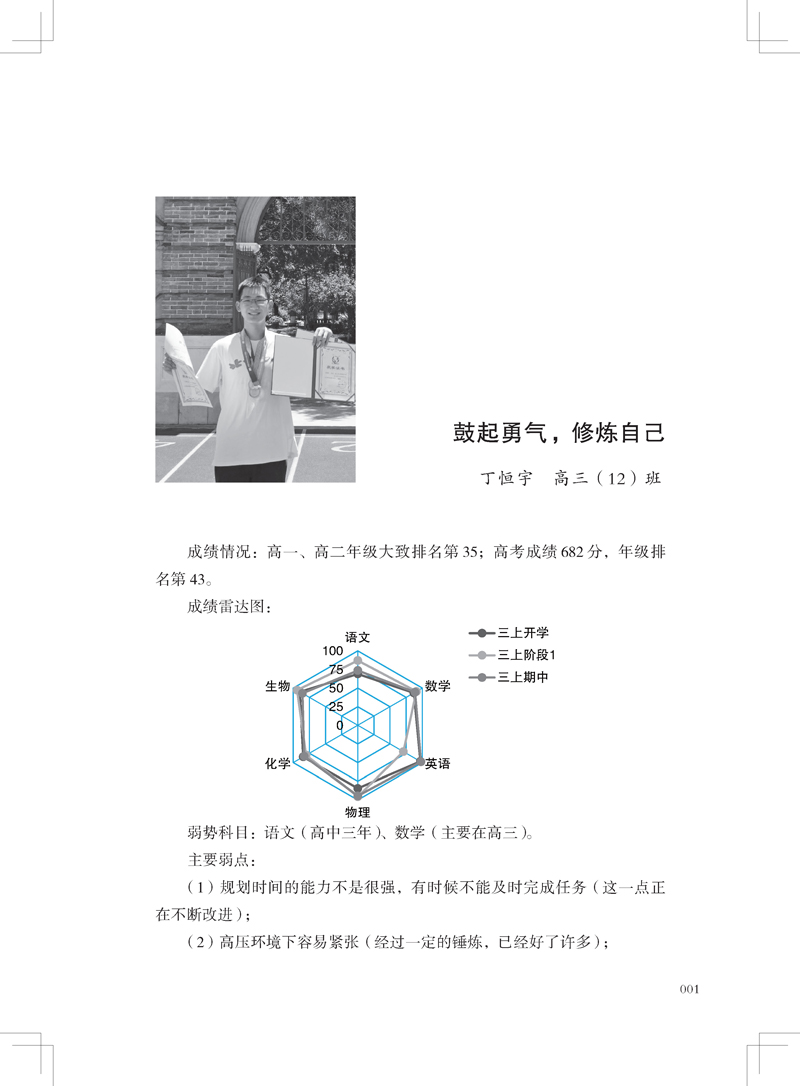 鼓起勇气,修炼自己… ………………………… 丁恒宇 高三(12)班 / 001 在青春激昂中拼搏 在理想主义中成长… …… 陈宇轩 高三( 1 )班 / 021 银杏树相伴的时光… …………………………… 孙牧远 高三(11)班 / 030 “双轨战士”的追梦之路………………………… 陈应涵 高三( 8 )班 / 042 人生舞台,绽放自我… ………………………… 高艺碹 高三(14)班 / 063 关注自己,稳住心态… ………………………… 黄勃翔 高三(11)班 / 073 雕刻那个六边形… ……………………………… 吕俊辰 高三(12)班 / 081 以学为乐,学无止境… ………………………… 杨楚云 高三( 4 )班 / 092 踏实认真助力生长… …………………………… 金亦扬 高三( 5 )班 / 101 按部就班,脚踏实地… ………………………… 沈函宇 高三( 8 )班 / 114 努力成就最美的绽放… ………………………… 谭 訸 高三( 9 )班 / 120 勇于挑战,突破限度… ………………………… 张毓峰 高三( 9 )班 / 128 平心态,懂取舍… ……………………………… 于川皓 高三(10)班 / 139 涅槃重生,成就新我… ………………………… 李小彤 高三(11)班 / 147 蛰伏三年,破茧而出… ………………………… 汪昊宇 高三(14)班 / 157 成长·破茧… …………………………………… 童嘉毅 高三(12)班 / 170 念念不忘,必有回响… ………………………… 杜达儒 高三( 8 )班 / 178 目标明确,坚定前行… ………………………… 李 硕 高三( 8 )班 / 183 稳定心态,专注当下… ………………………… 孙思杰 高三( 8 )班 / 194 反思求索,谋求精进… ………………………… 王瑞扬 高三(12)班 / 203 相信自己,做到极致… ………………………… 熊 诚 高三(13)班 / 216 相信自己,无畏前行… ………………………… 杨雪嫣 高三(10)班 / 223 明确道路不放弃… ……………………………… 史鹏九 高三( 3 )班 / 231 干今天的活,忘记昨天的事… ………………… 田乐祺 高三(13)班 / 243 保持热爱,奔赴未来… ………………………… 李 亨 高三(15)班 / 250 锚定目标,厚其积储… ………………………… 陈 龙 高三(15)班 / 263 纵有万难,逐一排除… ………………………… 刘豫京 高三(12)班 / 274 拒绝内耗,与自我和解… ……………………… 许如心 高三(11)班 / 285 生命在于绽放… ………………………………… 周思源 高三(10)班 / 292 乾坤未定,你我皆是黑马… …………………… 王敏达 高三(15)班 / 302 珍惜当下,莫向外求… ………………………… 纪佳彤 高三(10)班 / 313 厚积薄发,超越自我… ………………………… 刘谦益 高三(10)班 / 323 最青春的时节做最优异的自己… ……………… 郭锐蕾 高三(11)班 / 334 尽己所能,不惧未来… ………………………… 尹 涵 高三(12)班 / 344 仰望星空,脚踏实地… ………………………… 李 琢 高三(12)班 / 355 只争朝夕,不负韶华… ………………………… 方禹琪 高三(14)班 / 362 向内求索,向外生长… ………………………… 崔鲁玥 高三(12)班 / 371 勇敢面对未知… ………………………………… 姜紫涵 高三(10)班 / 386