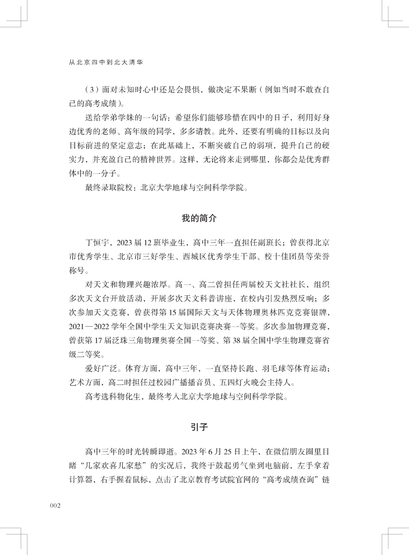 精彩书摘: 反思求索 谋求精进 我的经验 路 15 岁的我在朝阳走完了九载求学路,来到西城闯荡。彼时的我在学业上一路顺风顺水,在小学、初中的小圈子里独步一时,鲜有对手。但是,对于圈子外的世界,对偌大的北京城里其他同学的情况,我未曾关心,也自然不甚了了。当我作为四中学生第一次走进这座校园,在那个炎热的午后踏上蓝色跑道,在教学楼见到了未来的班主任和同学时,我的内心是惶惶的,我不知道自己将在这个群体中扮演什么角色,不知道自己的高中之路将要怎么走。正是从那时起,我踏上了将贯穿我的整个高中生涯的探索和精进自身之途。 探索 • 挣扎 • 坚定 高中开学一个月,身处竞赛班但从未接触过竞赛的我目睹着身边的同学在各个方面大显神通——“拉格朗日”“基尔霍夫”信手拈来,英语课上即兴发言技惊四座,古文翻译“信达雅”博得满堂喝彩……这个阶段的我满心崇拜,几乎在仰视着身边的同学。很快,第一次年级统考成绩发布,我的年级排在 40 左右,班级排位居第 10,和初中时稳拿年级第一相比,落差不小,但也在意料之中。直到此时,我终于对同学们的水平有了一个初步直观的认识——大家果然很厉害! 面对这一事实,我庆幸我的心态调整是成功的。承认别人的强大,但我也坚信:通过自己扎实的落实,受助于自己持久的兴趣,我可以在现有基础上取得进步。于是,我延续着初中刻苦勤奋的作风,6:30 起床,6:42 出宿舍,6:55 到班开始学习,晚上坚持上完四晚不缺席。到期中考试时,我的年级排提高到 30 左右;到期末,我成功挺进年级前 10。在这个过程中,我的信心逐渐增加,因为我通过实践确证了自己的学习方法切实可行,安心带来信心。 下半学期,我数次成功冲进前 10,信心满满。我已成功探知了自己在四中的位置,仿佛初中的时光又回到了我的身边。但是,升入高二的我一下子跌入了低谷。除过一次期中考试外再无前10 成绩,两次期末考试分别以年排 40+ 和 30+ 草草收尾,几乎创下历史最低成绩纪录。很久后我意识到,这并非什么突发偶然事件,其隐患已经埋藏太久:在绝大多数同学具有明显弱势科目的九科时代,我的成绩掩盖了自己落实不到位的现实,一日大家站在六科的平台上展开竞争,其弊病便暴露无遗。现实如此,但彼时的我未能及时归因,也自然难以获得对自己清醒的认识,难以理解自己的成绩何以呈现似不可逆的断崖式下跌。迷茫的阶段,碰上课内学习与课外生活之间矛盾的集中爆发,我进入了一个情绪不稳定期。 在这个阶段,我经常会受到焦虑感的无端攻击,身体上也出现了相应的反应,这直接影响到了我的学习专注度。身处其中,开始时,是无助的。 我希望通过运动缓解焦虑,但无奈效果不佳。后来,我沉下心来思考:既然焦虑生发于自身,那么我应该努力找到自己焦虑的根本缘由。找到源头,思考明白,说服自己,焦虑也就渐渐离我而去了。这样,我为高三赢得了一个好的开局。 升入高三,我摒除了外来的干扰,投入了前所未有的精力,也获得了学校年级的认可肯定,这让我信心倍增。高三一年,成绩跌宕起伏难以历数,但已然成长的我没有再因一时的得失而让自己被情绪所奴役。我怀着对自己的信心,怀着对奋斗的信仰,撑到了最后,得到了一个令自己满意的结果。升入高三前的夏天,一个学长对我说:“高三,是我在四中度过的最快乐的一年。”诚如其言,在一次次设定目标、付诸努力、达成成果的过程中,我一次次体会到充实,收获幸福感与满足感,当这一切告一段落之时,颇有一番恍如隔世意犹未尽之意。 从考入四中到顺利毕业,心态上几经风雨几历寒暑,终于从迷惘走向坚定、从恐惧走向勇敢。 行路心经 从前文所述的心路中不难看出,我和绝大多数人一样,在高中阶段经历了一段学法精进的过程。高二上学期时,同宿舍的好朋友曾毫不留情地指出我的学习效率低下,因为达到同样的程度,我的学习时间甚至会达到他的两倍。这使我不得不开始思考原因、谋求突破。终于,我找到了提升效率的方式——高度浓缩的三个字“想清楚”。这包含多方面的意思。 宏观上,“想清楚”是清晰地认识到自己在特定的学习阶段应该完成哪些任务,能够对某天某个时间自己的所作所为有所把握、有所掌控。任务必然会有很多,如果不能明确自己的节奏,考卷来了刷考卷,作业来了写作业,就会陷入被动,有针对性地解决自己问题的任务很容易会被抛到脑后或者一拖再拖,这是很不利的。所以我们应该主动出击,“想清楚”针对自己的情况,每天应该干些什么。 在宏观之下、中观尺度上,面对一项具体的任务,我觉得我们需要明确自己想要通过它达成什么目标。以高三下学期海淀一模为例,坐在考场上候考时,我会问自己:这场考试我的着重关注点在哪里,我想要通过它来验证或者解决什么问题。我在西城一模当中发现了自己在英语考试时间分配上的问题,所以我便告诉自己:海淀一模的主要任务是检验我调整时间分配的方法是否切实有效。于是,我在这一次考试过程中就会着重关注这一点。平时与之一样,面对一份作业试卷,或者一场随堂考试,我们应该清楚自己想从中获得的是什么。如若你旨在进行选择题提速,那么你就应该按照考场的方式来处理它,而不是在做题过程中把对每个选项的理解都做到 100%。 在此基础上再缩小一步,微观尺度的“想清楚”是针对每一