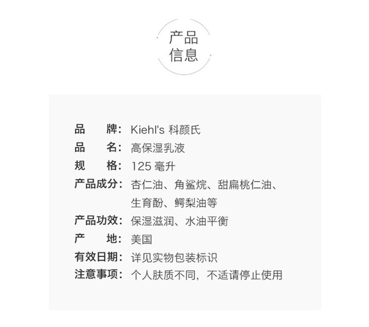 【Kiehl's 科颜氏】高保湿精华爽肤水250ml+科颜氏高保湿乳液125ml 水乳组合 补水保湿 水润舒缓肌肤