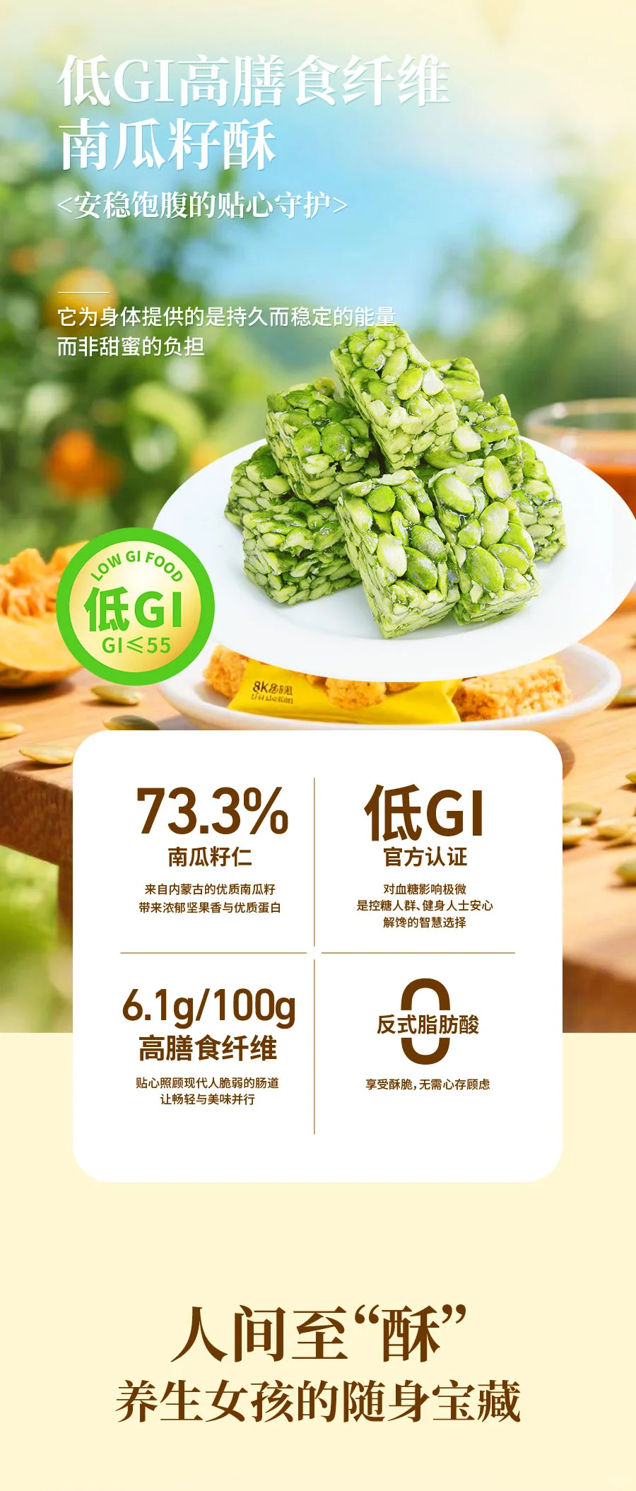 每块酥里,73.3%都是实实在在的南瓜籽仁,一口下去,满嘴都是天然坚果的酥香与醇厚。这,就是真材实料的味道