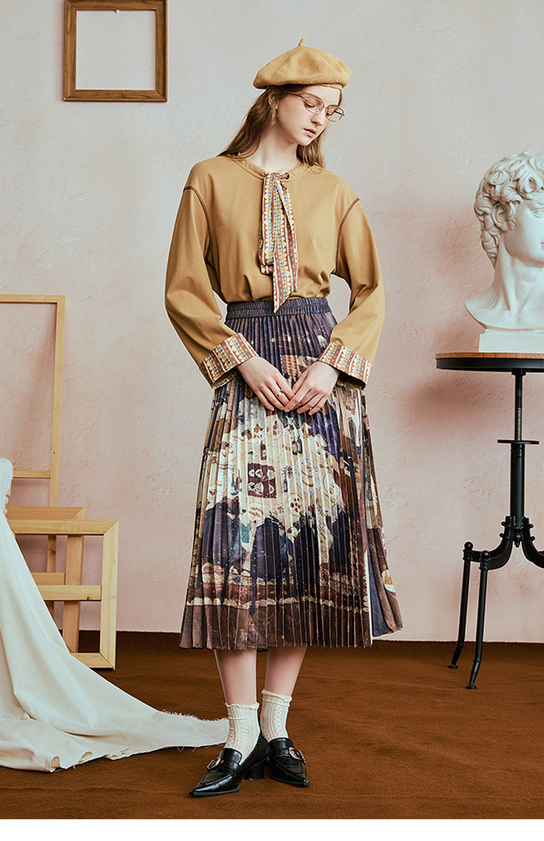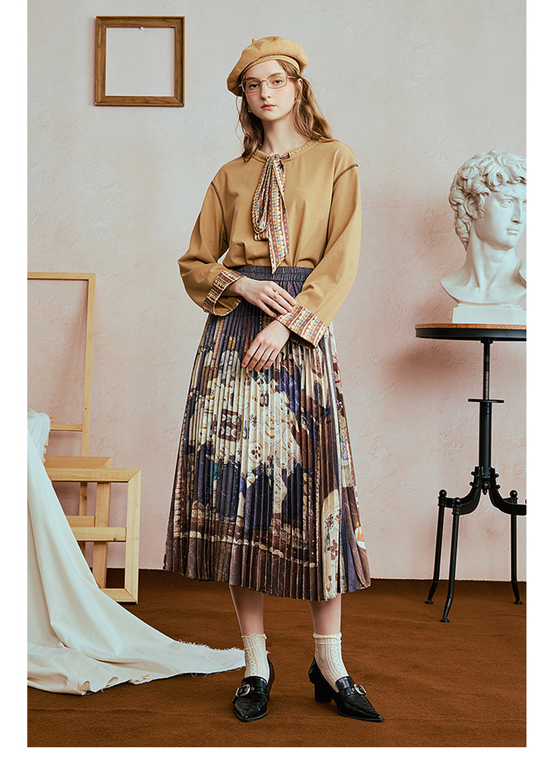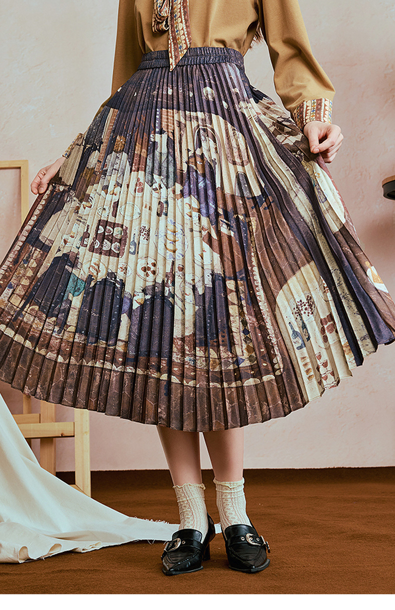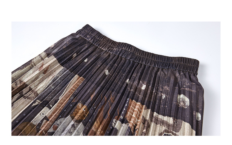 两三事 枫火阅川 2025秋季新款复古印花不规则百褶裙高腰半身裙