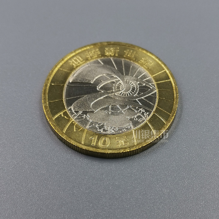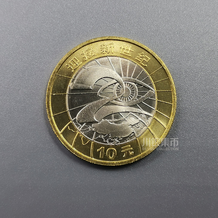 【背面图案】:光芒四射的太阳为底纹,以地球、彩带和人的眼睛构成象征2000年的图形,内缘上方为“迎接新世纪”字样,下方为“10元”字样。