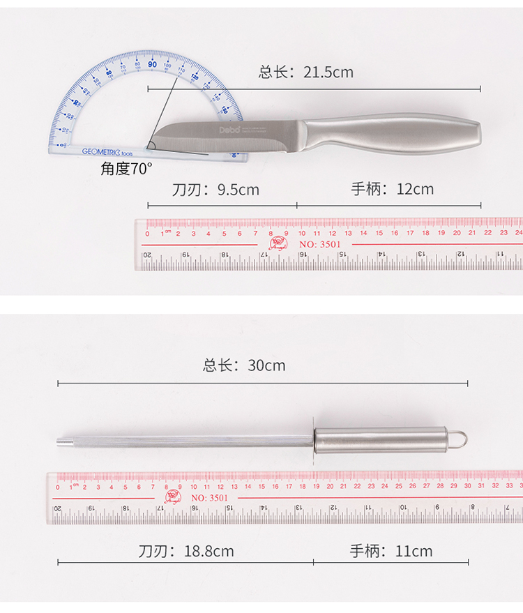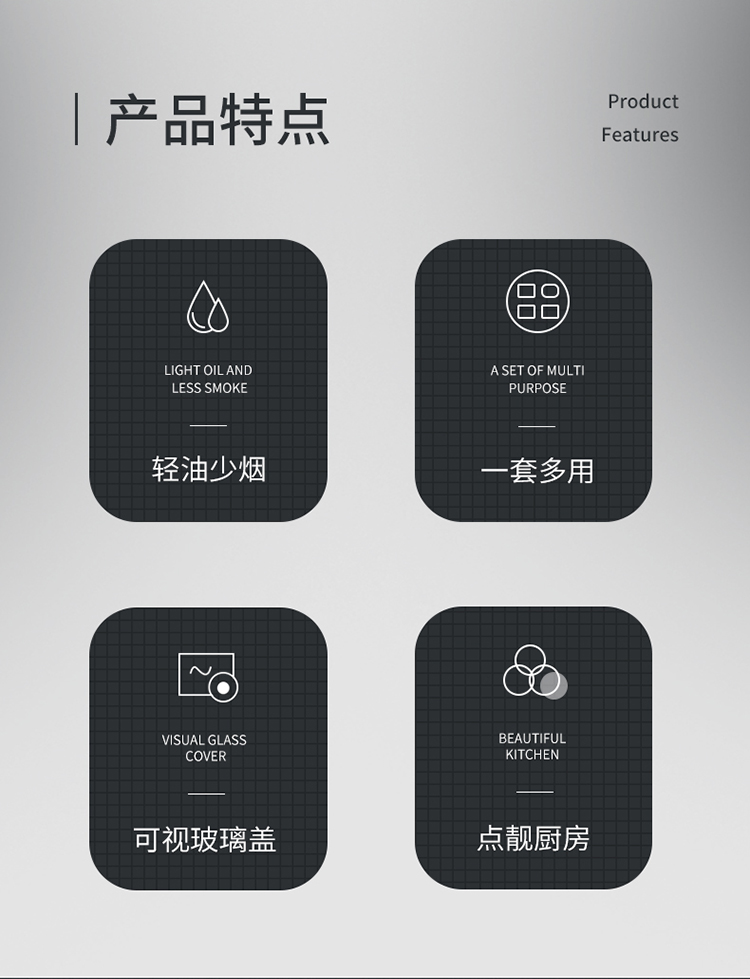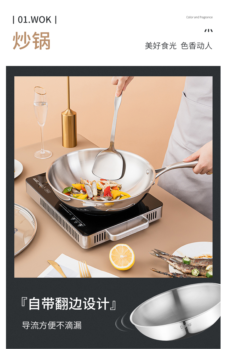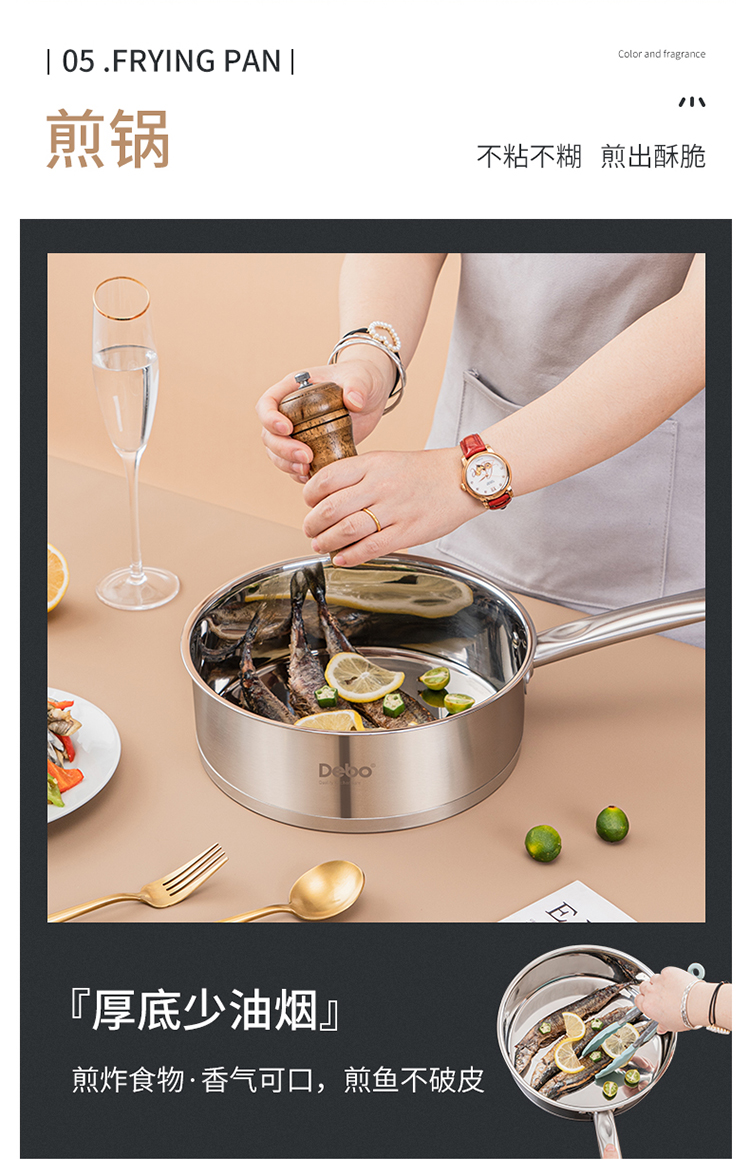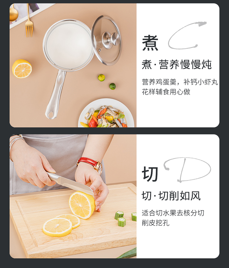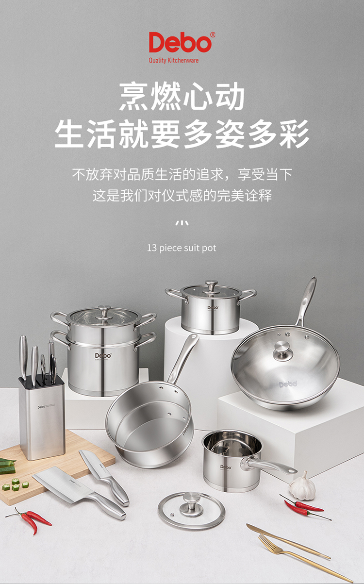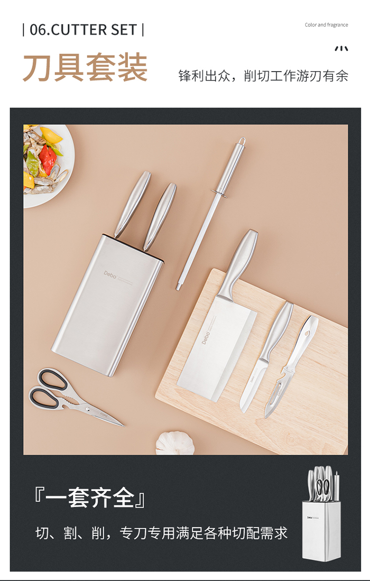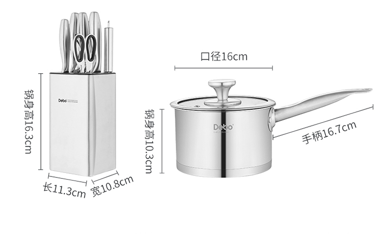 配置:蒸锅*1、炒锅*1、奶锅*1、汤锅*1、煎锅*1、玻璃盖(蒸锅盖1+奶锅盖1+汤锅盖1+炒锅盖1)*4、刀座*1、多用刀*1、鹅毛夹*1、锯刀*1、切菜刀*1、多功能刀*1、磨刀棒*1、厨房剪*1