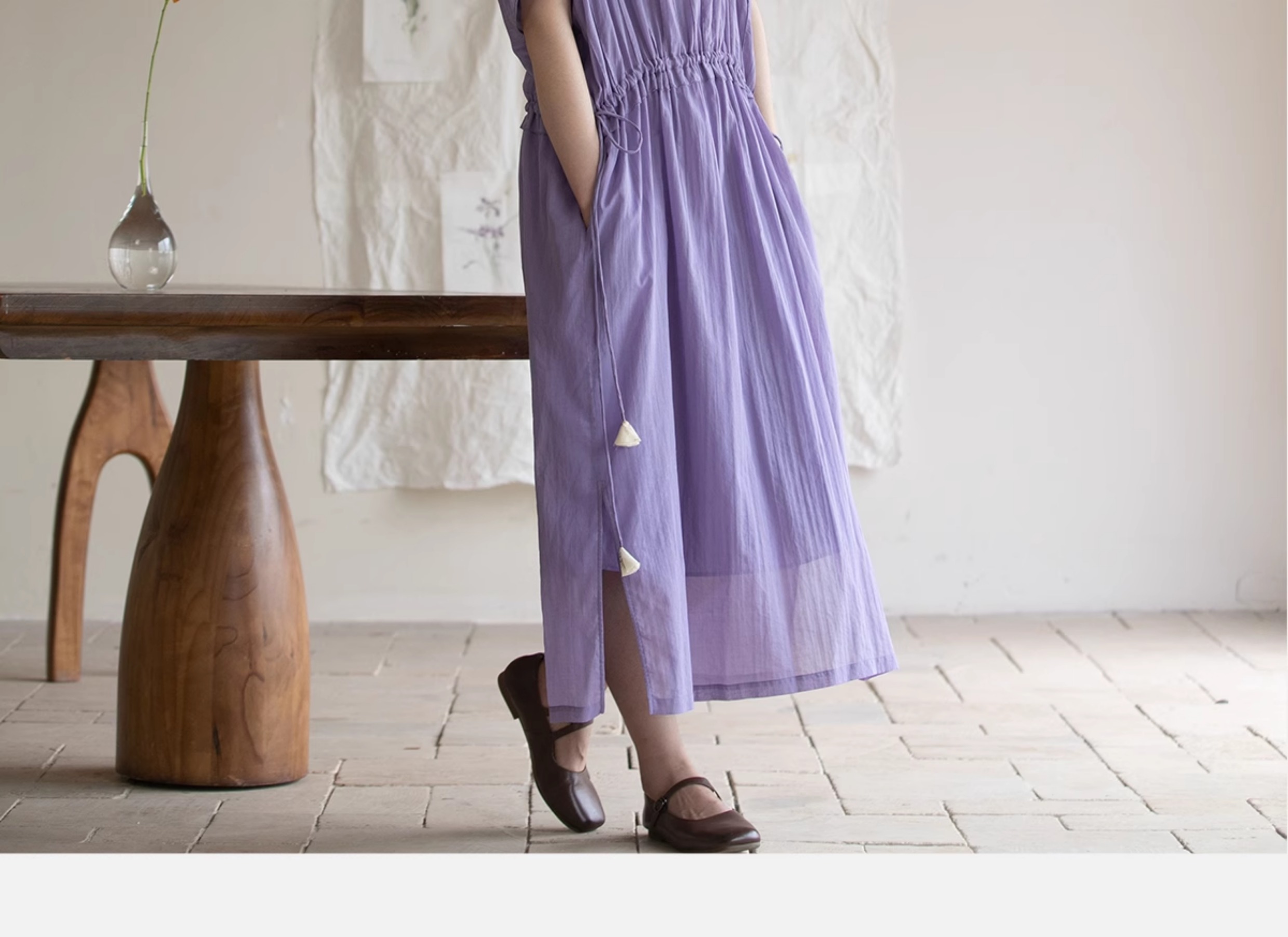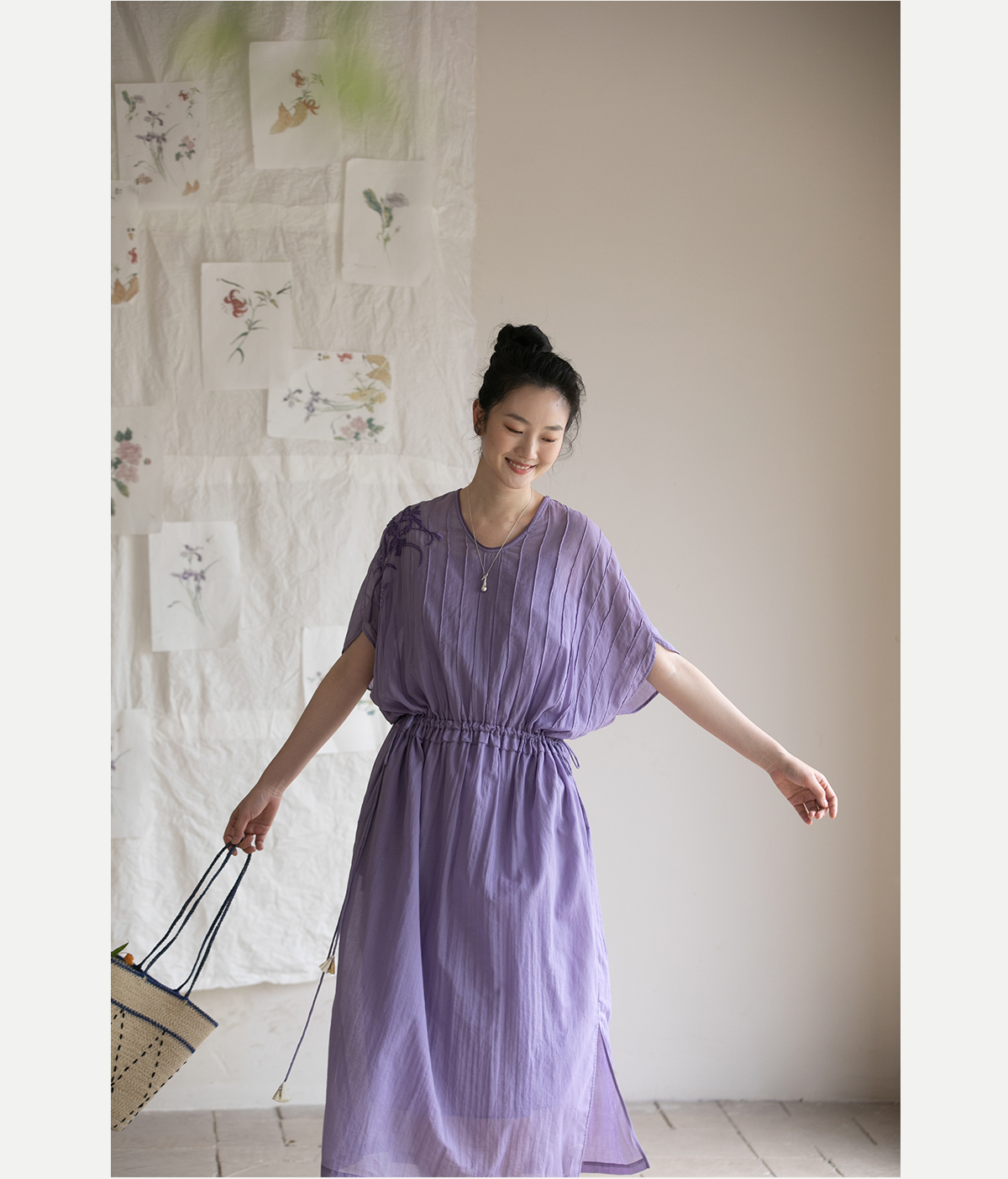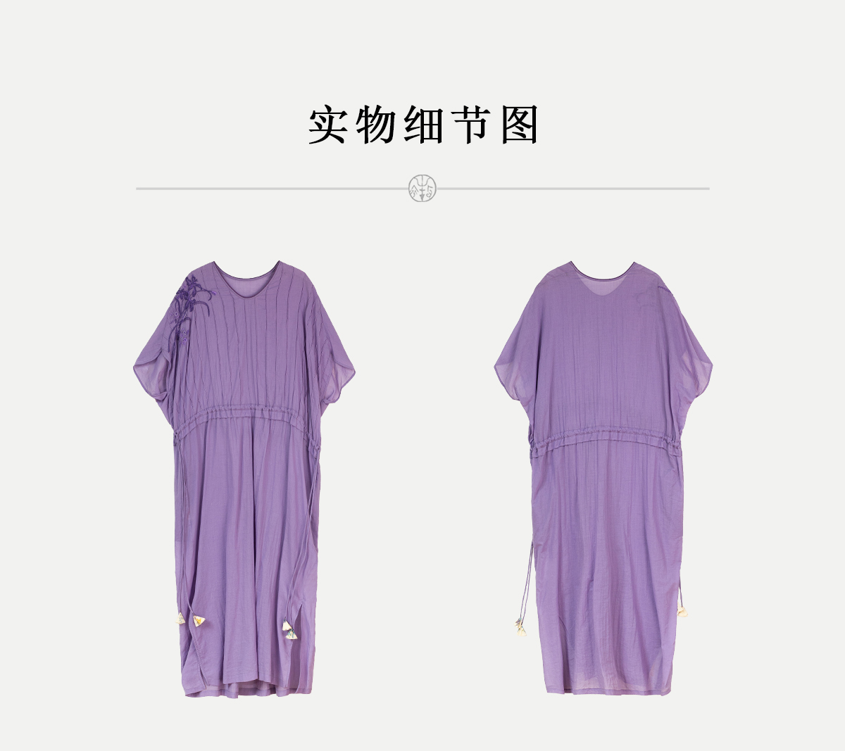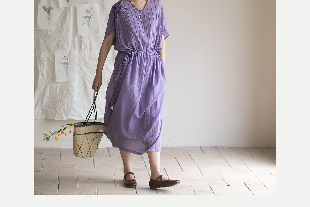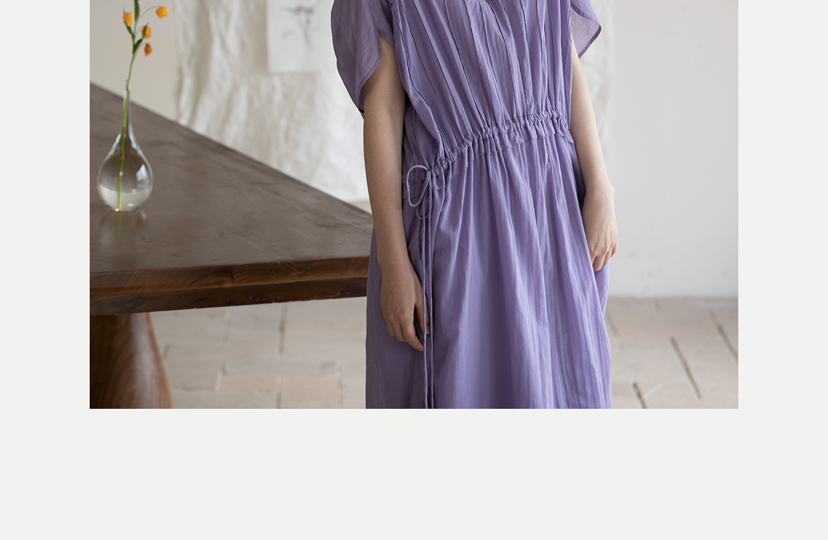 牧衣游原创 印花纯棉连衣裙新品轻薄抽绳设计感V领文艺长裙 清雨