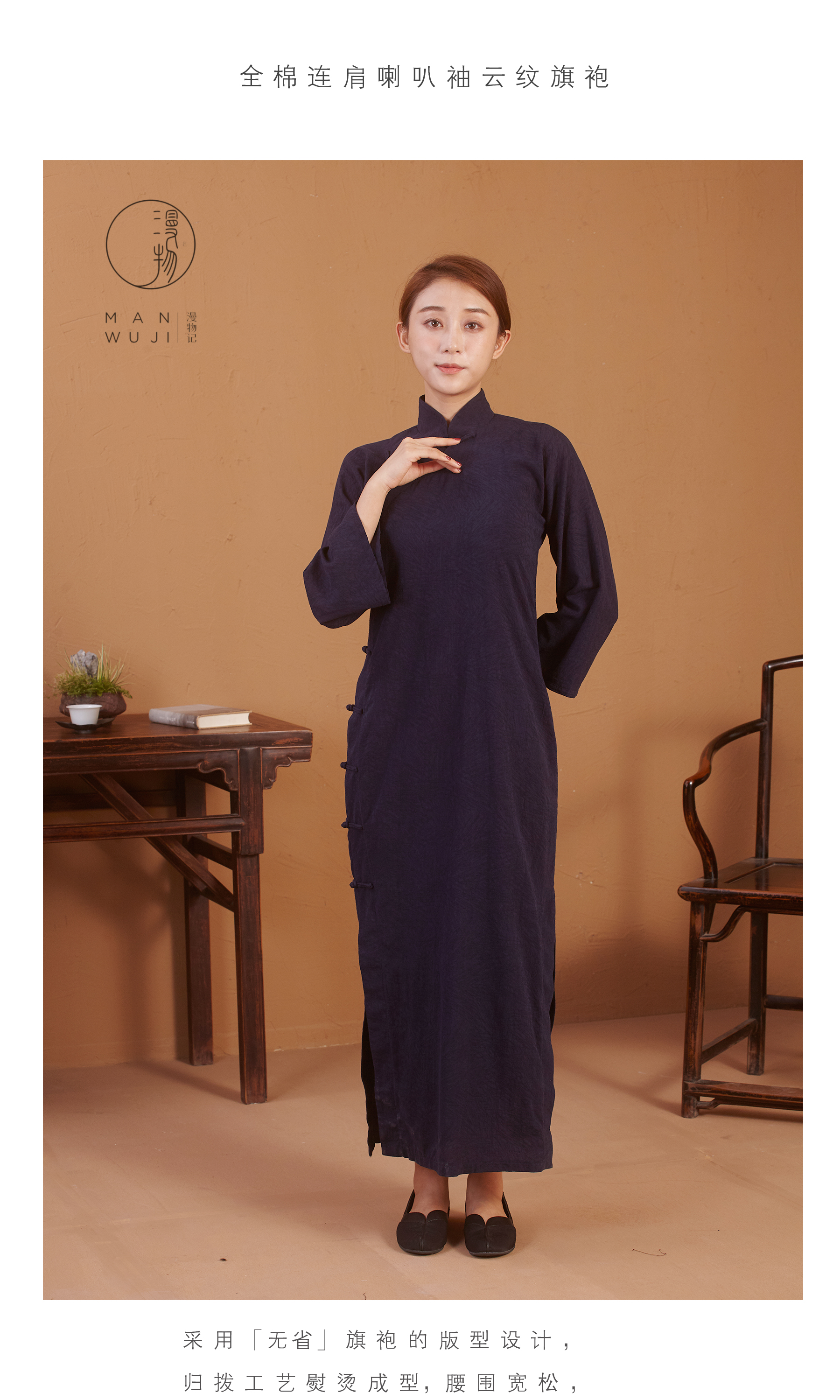全棉连肩喇叭袖云纹旗袍
