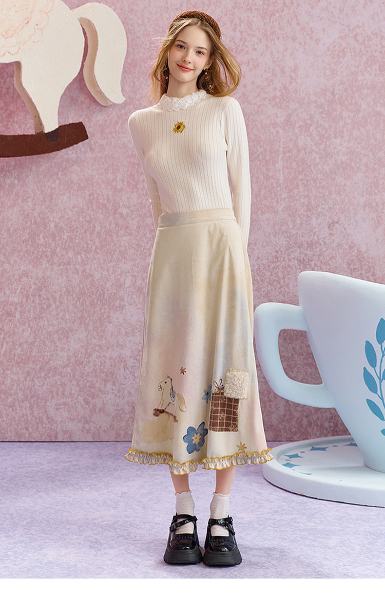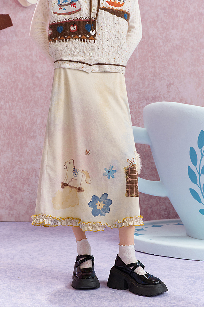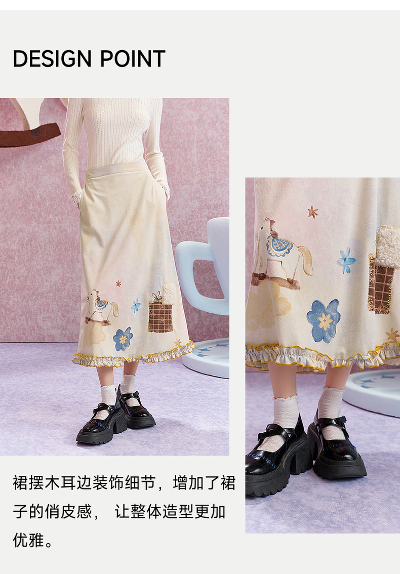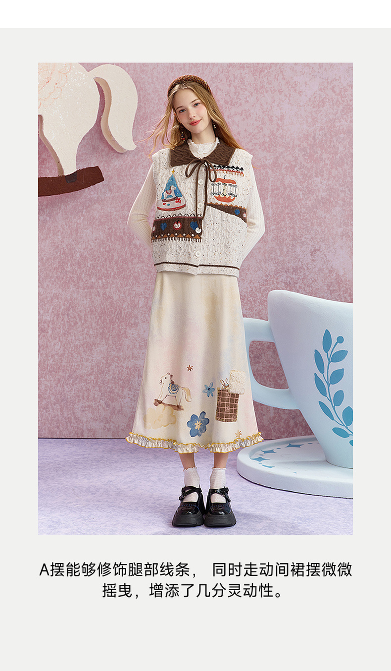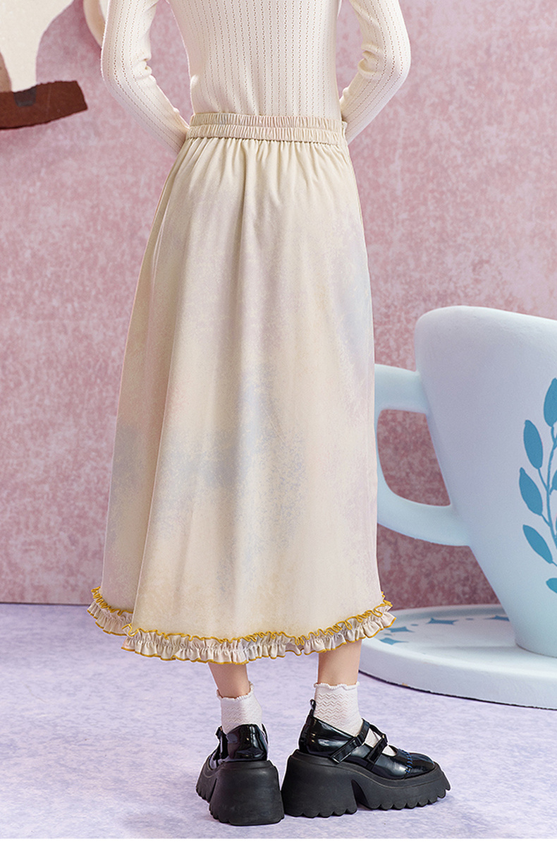 两三事 虹色甜心 2025秋季新款小清新拼布印花木耳边裙摆半身裙