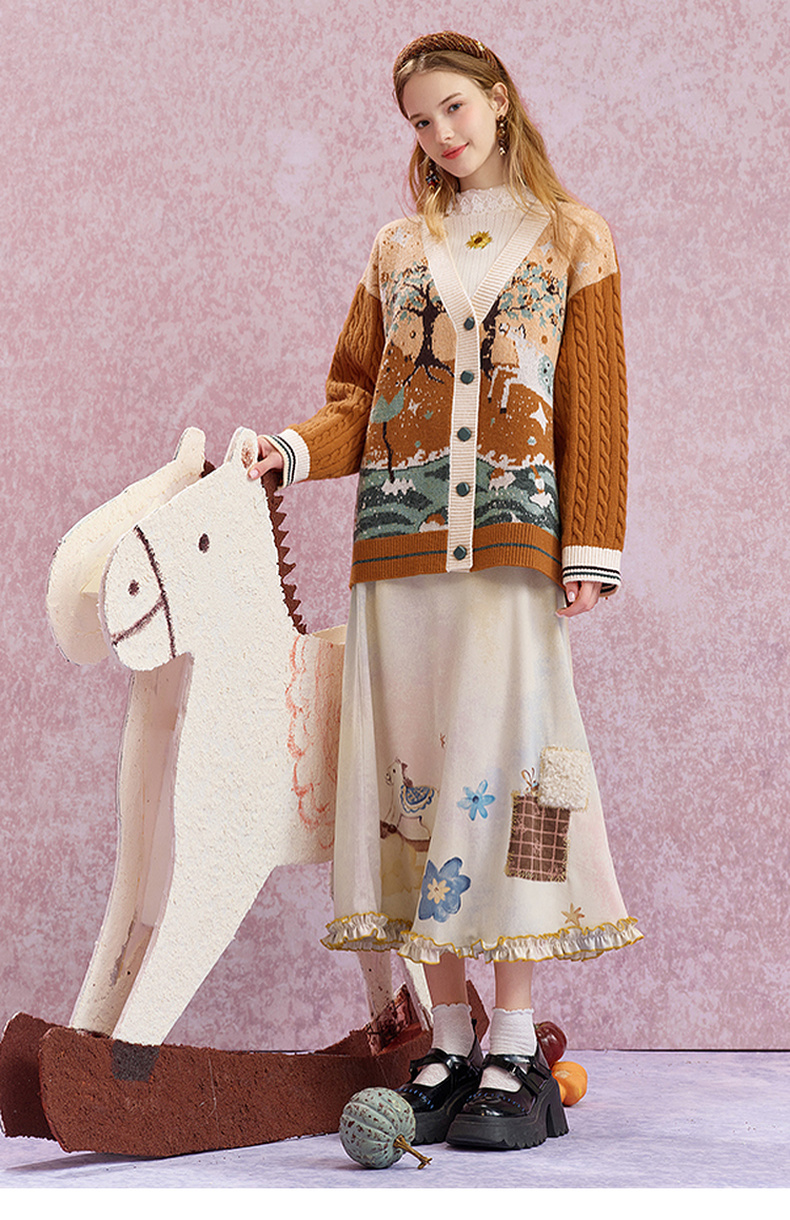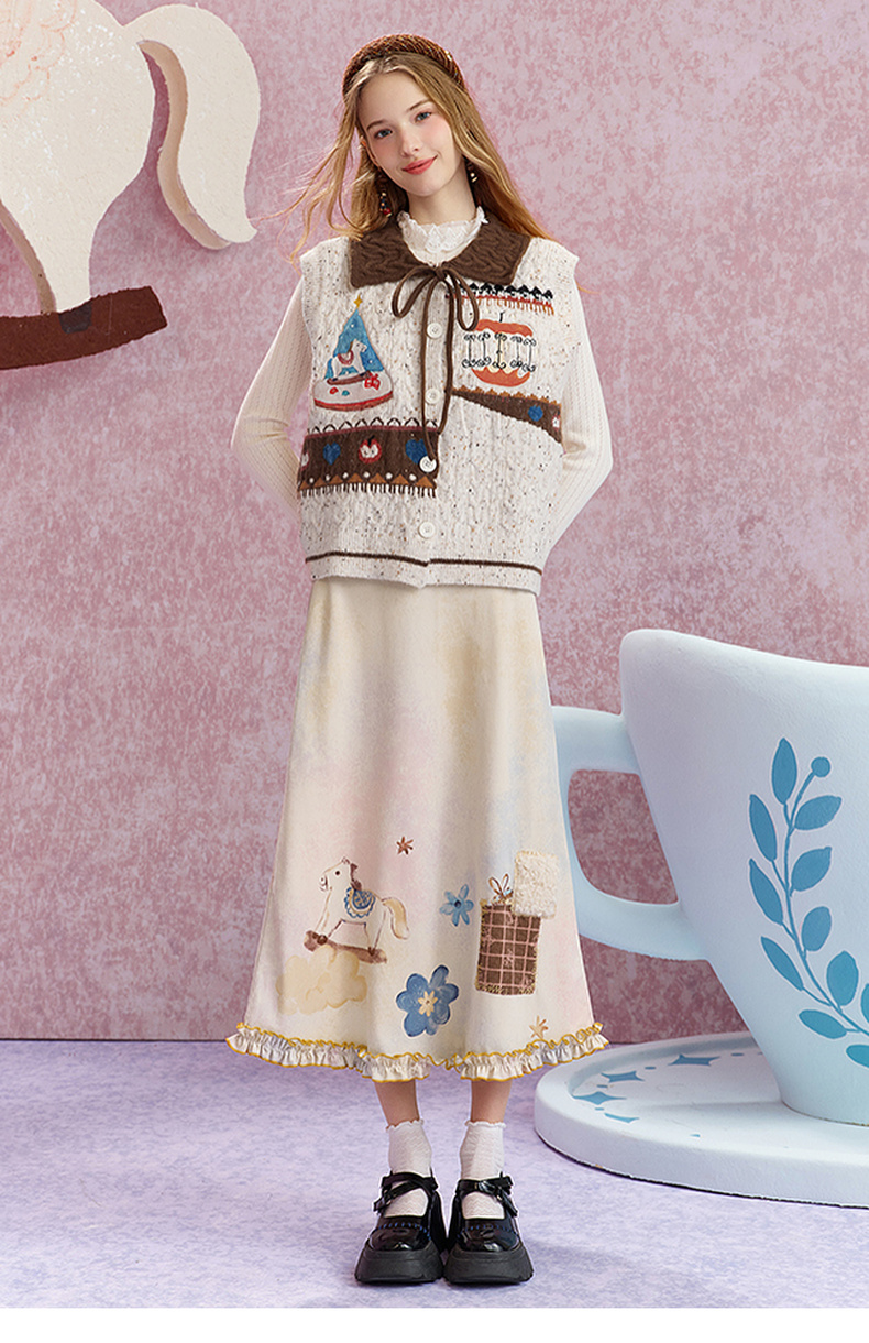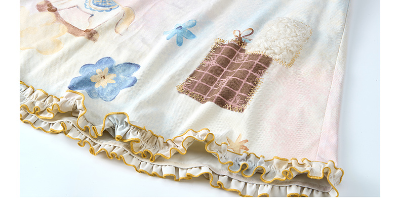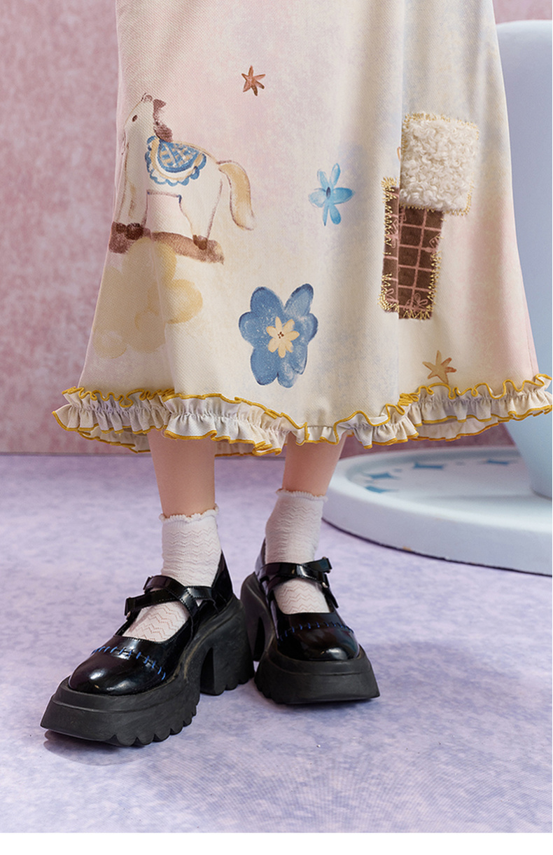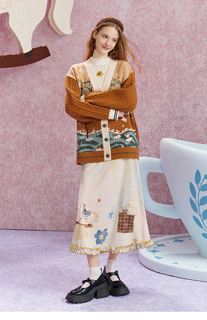 两三事 虹色甜心 2025秋季新款小清新拼布印花木耳边裙摆半身裙