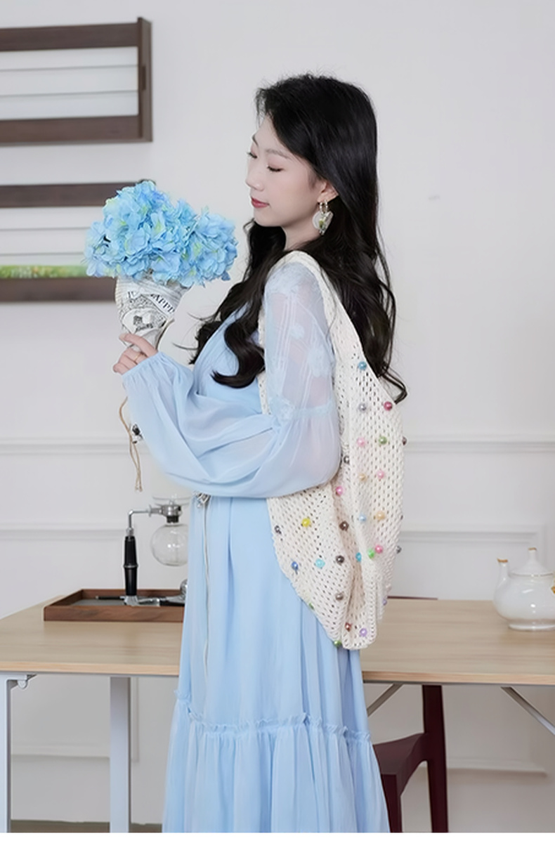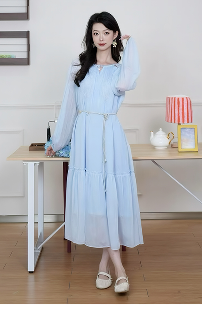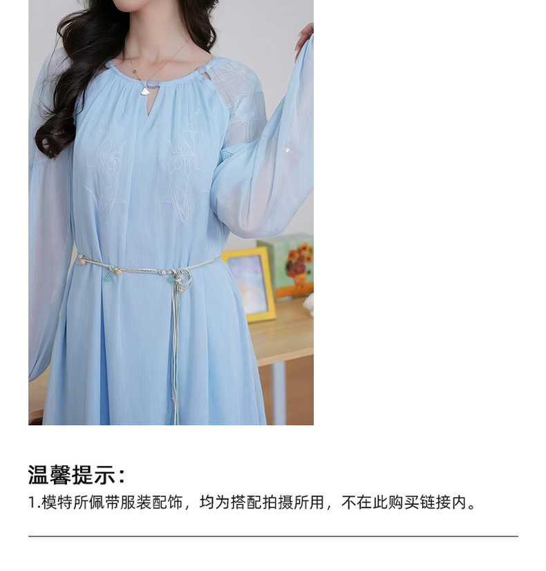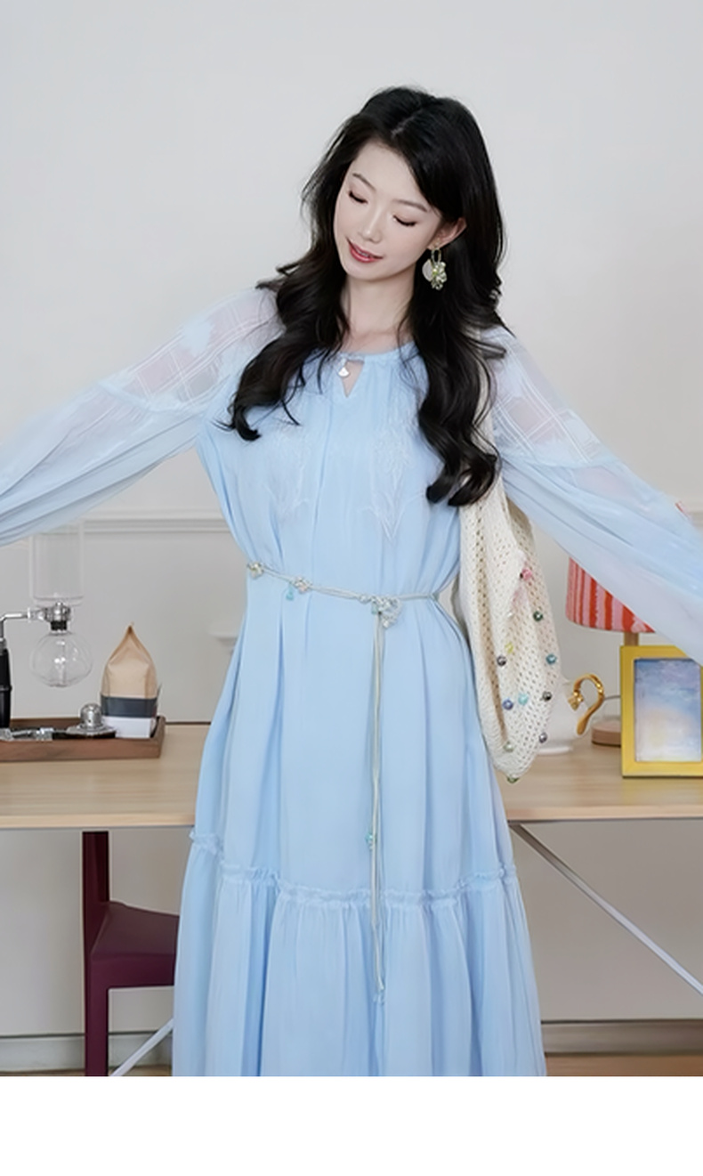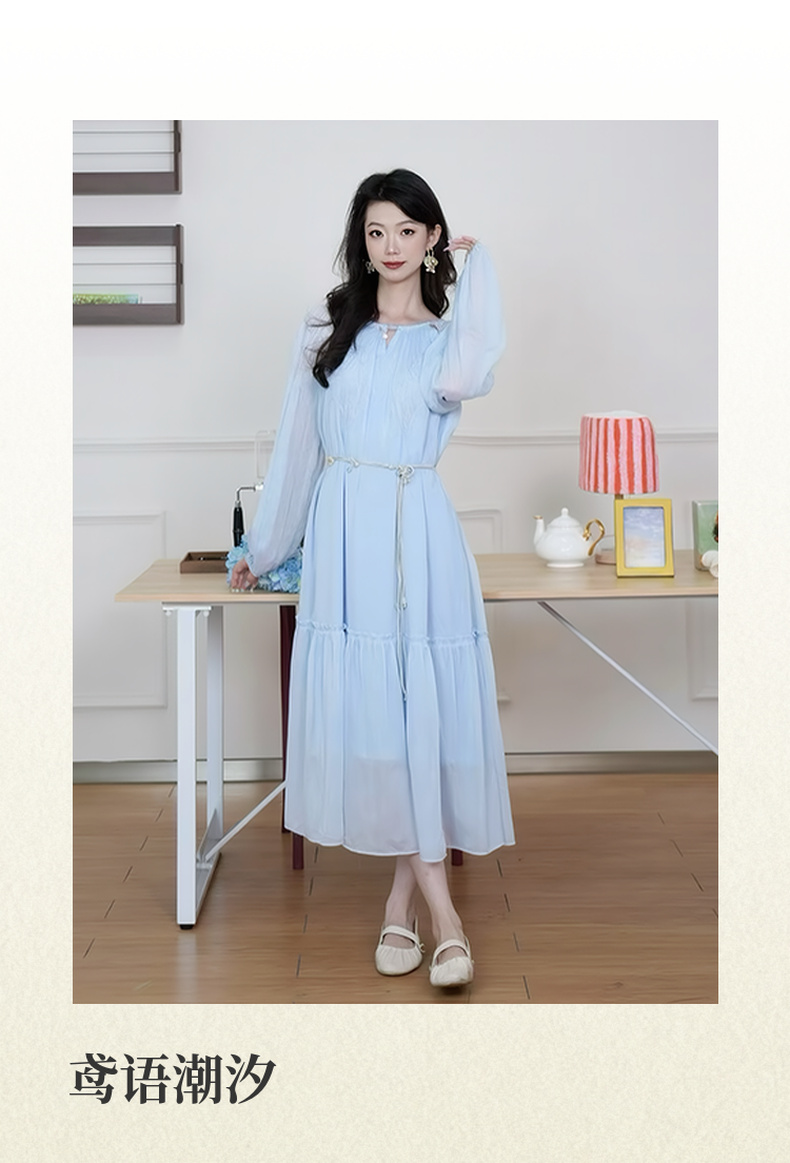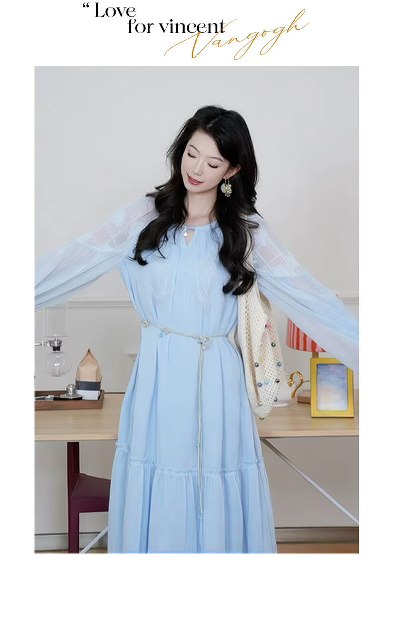 两三事梵高文艺鸢语潮汐2025夏季新款优雅透视拼布刺绣绑带连衣裙