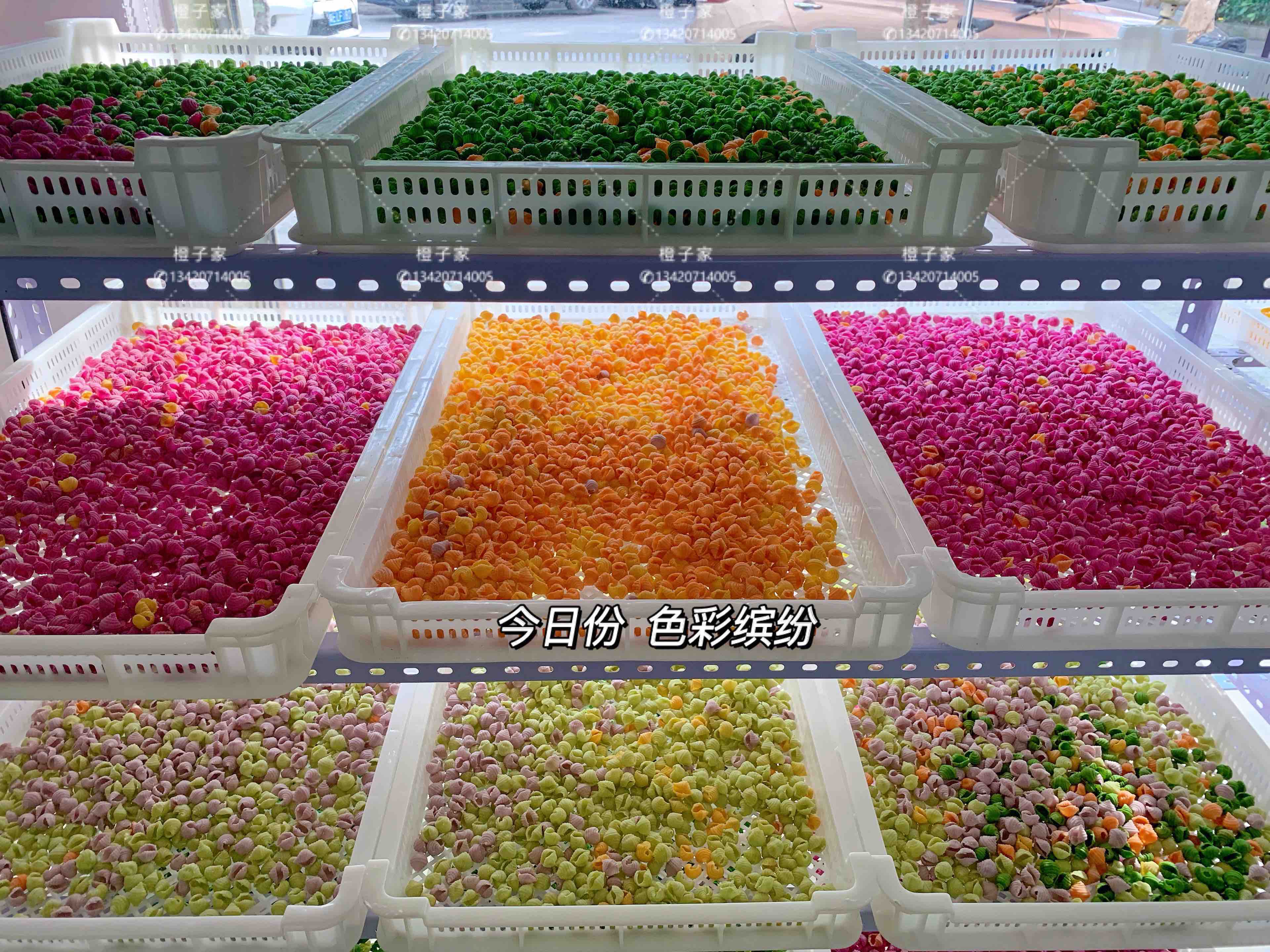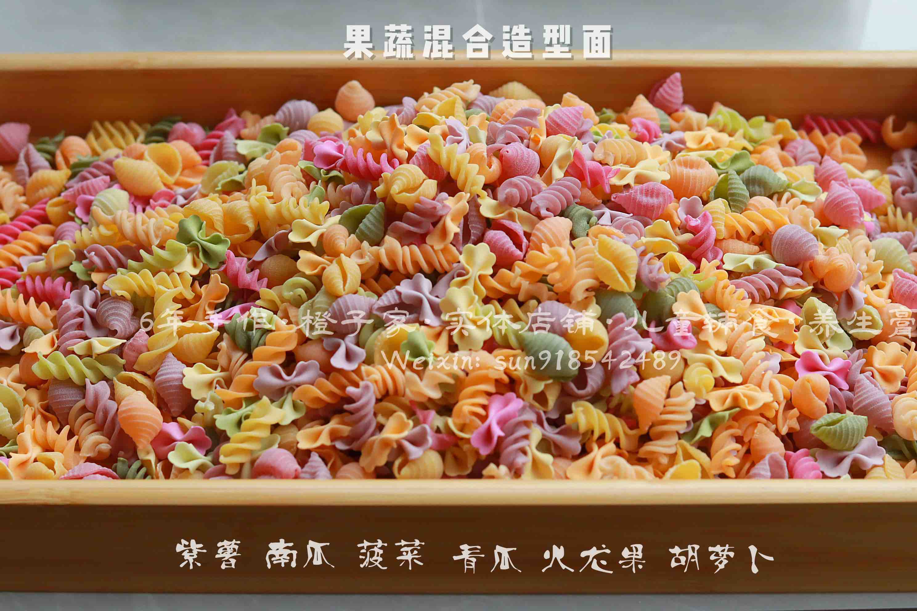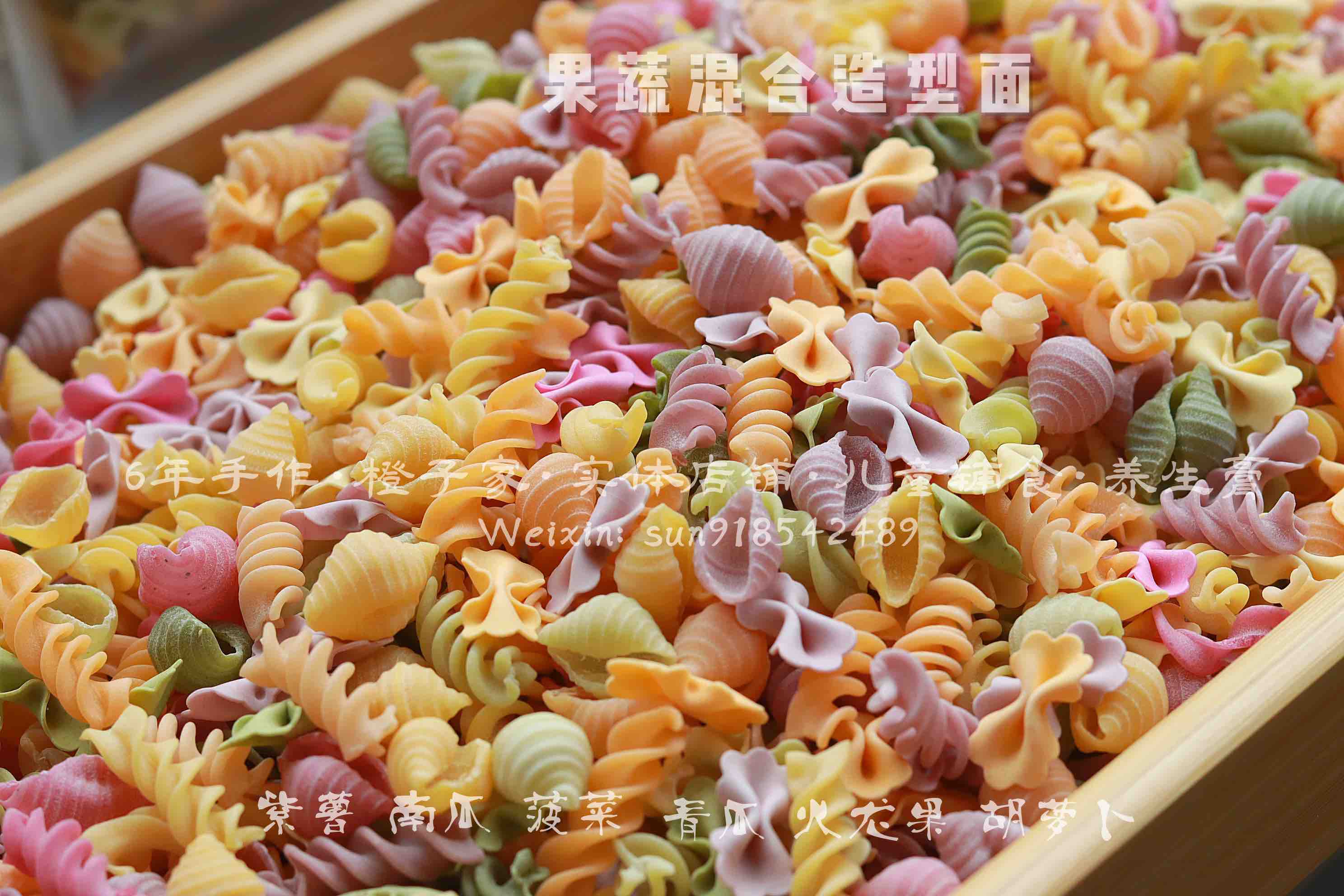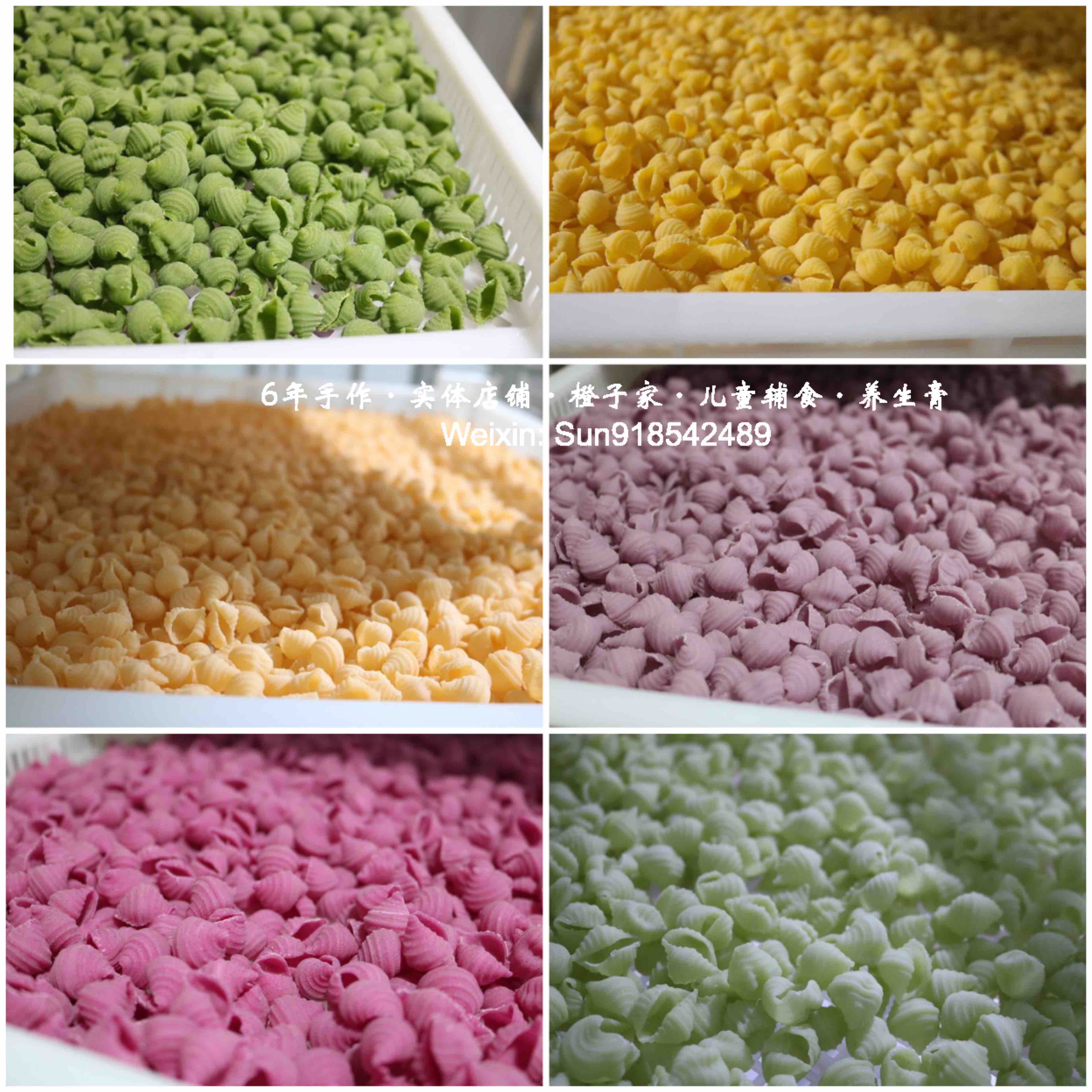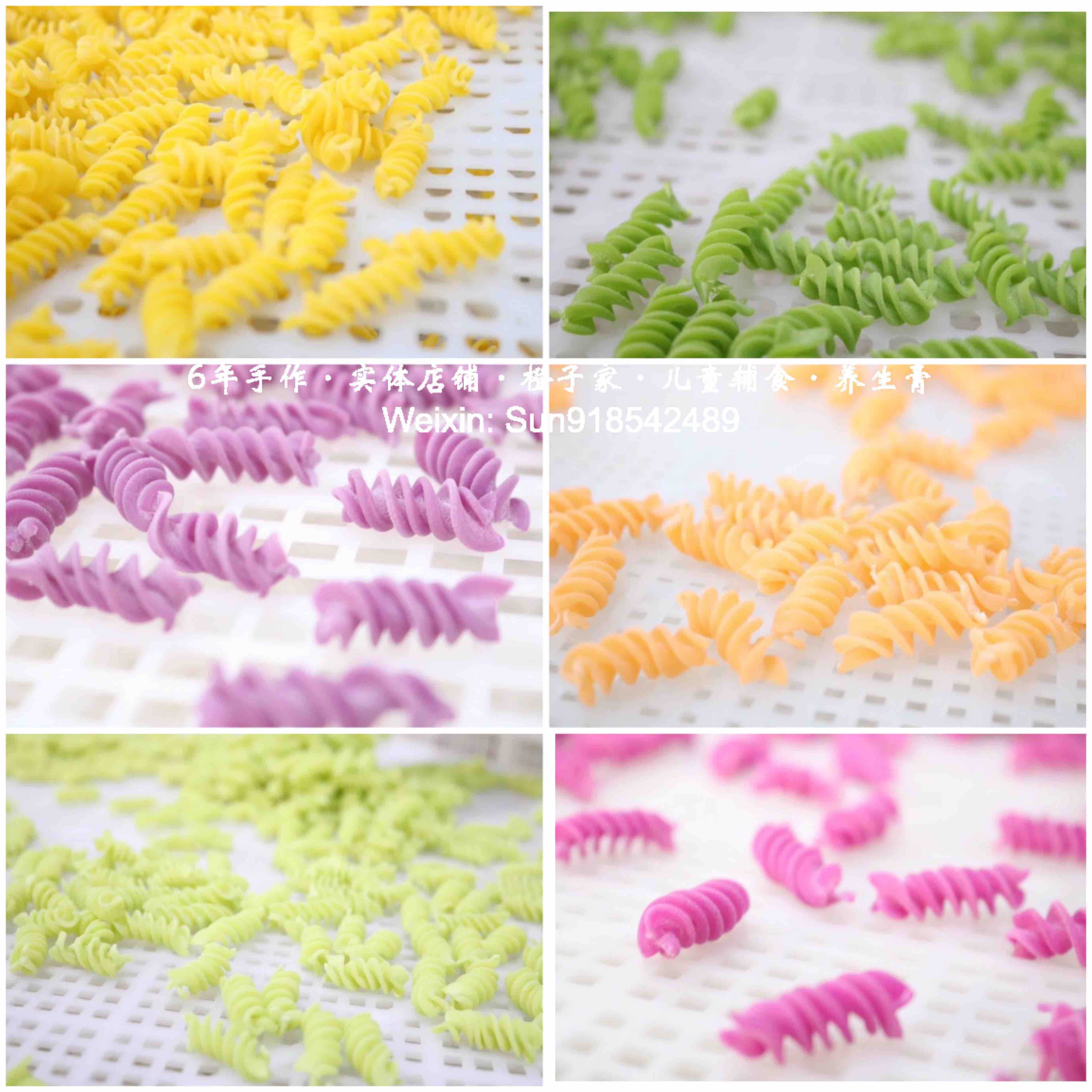 【原材料】优质小麦粉、新鲜果蔬泥。其中红色(红心火龙果/甜菜根),绿色(菠菜/黄瓜),紫色(紫薯),橙色(胡萝卜),黄色(南瓜),黑色(黑芝麻)。