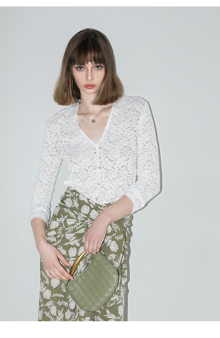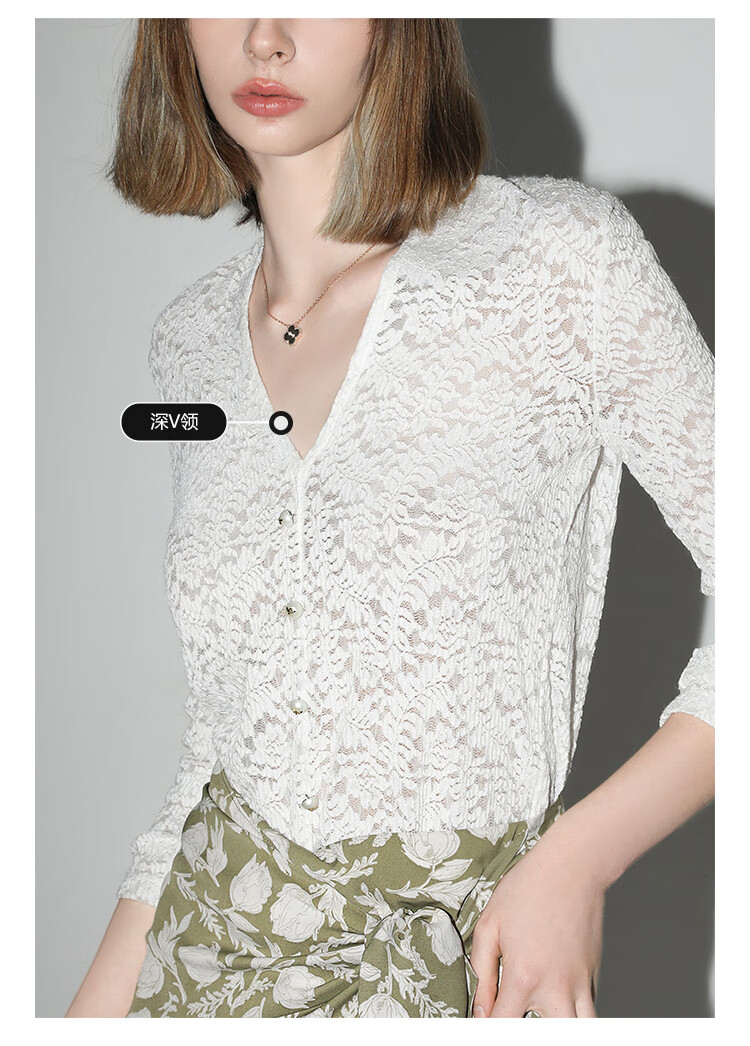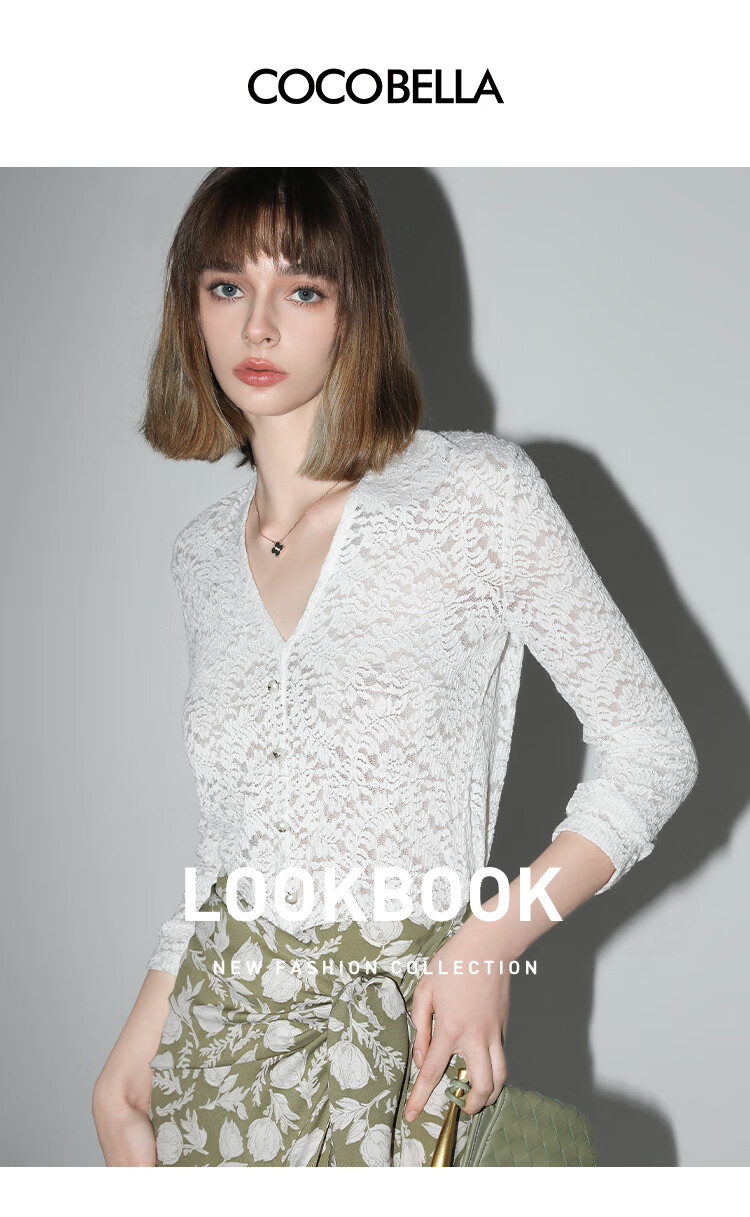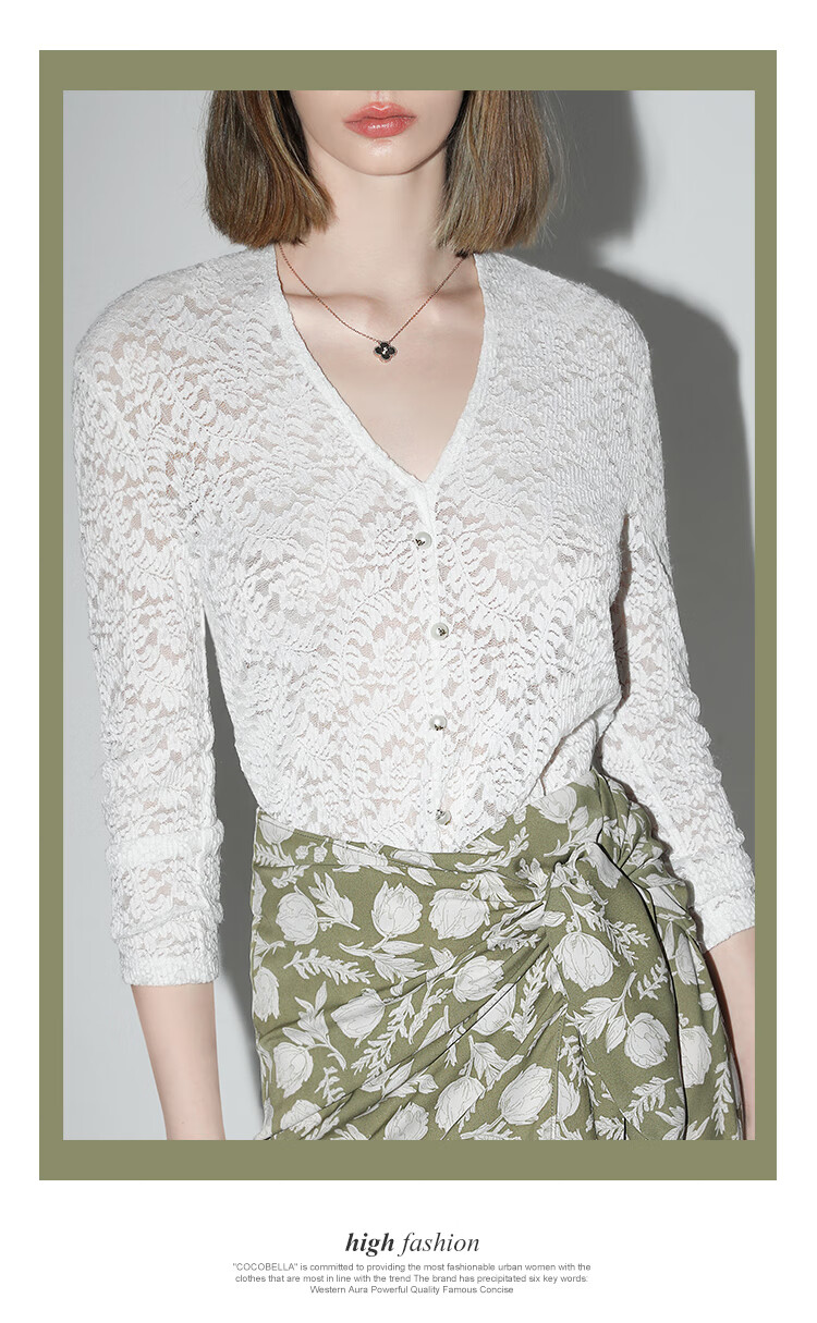 COCOBELLA优雅微透视镂空蕾丝衬衫女深V领长袖针织衫NLC55