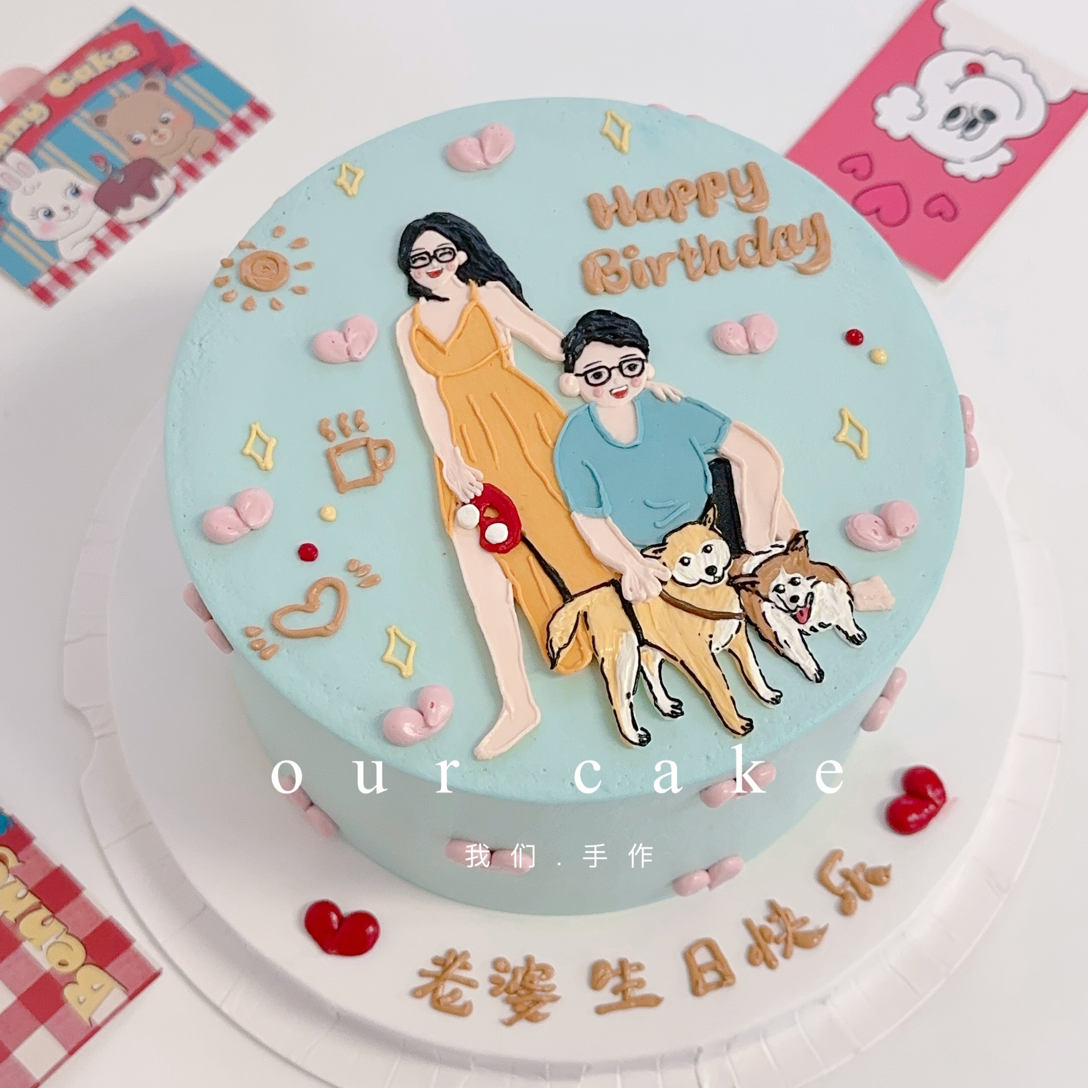 一家四口/情侣宠物手绘蛋糕-低糖处理无添加