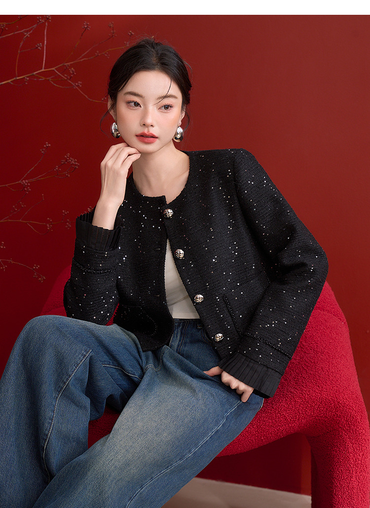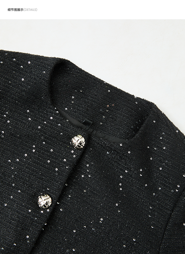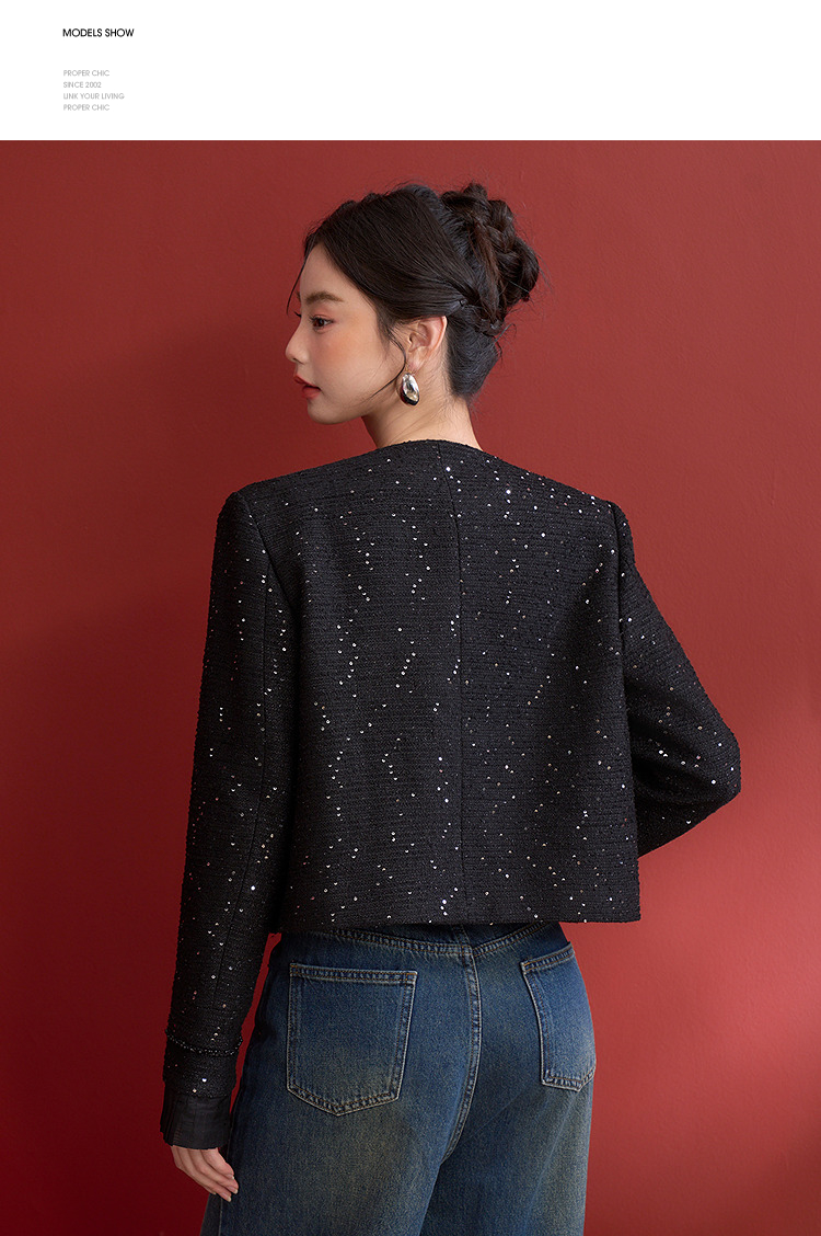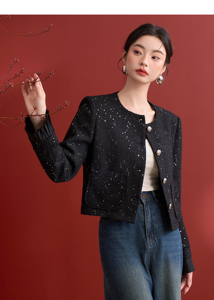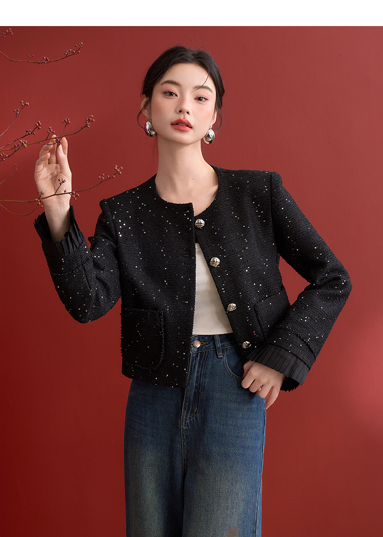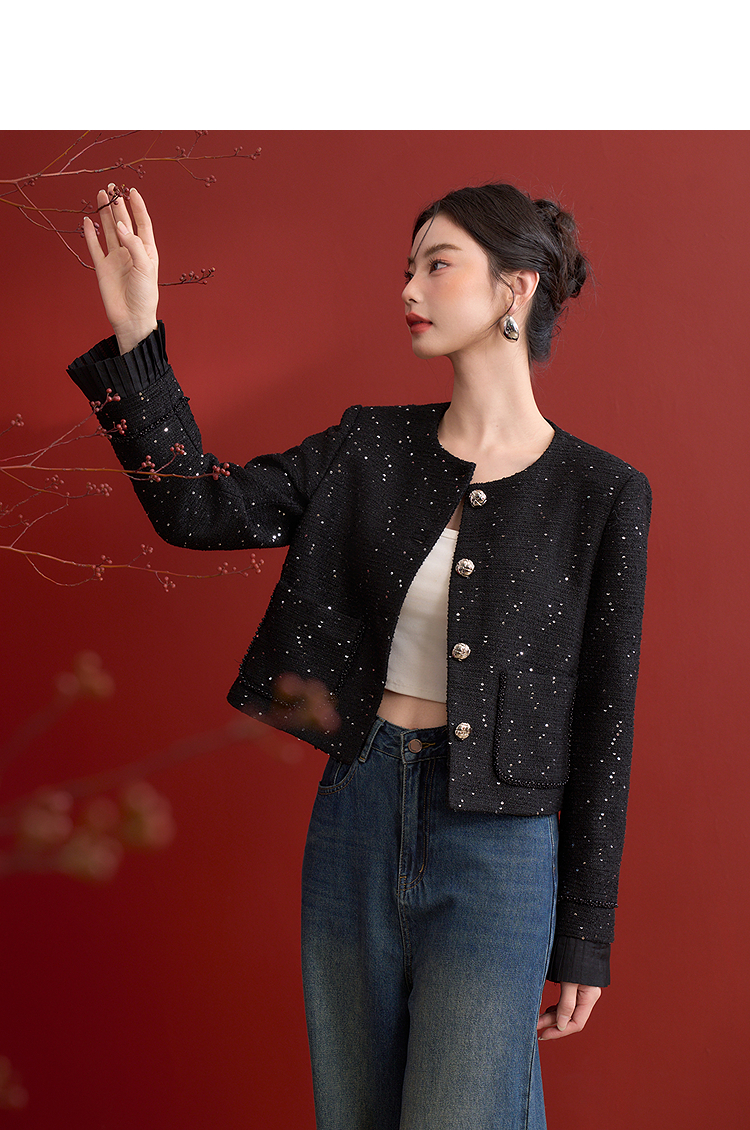 名媛千金风亮片细闪小香风外套女毛边圆领上衣V0150151