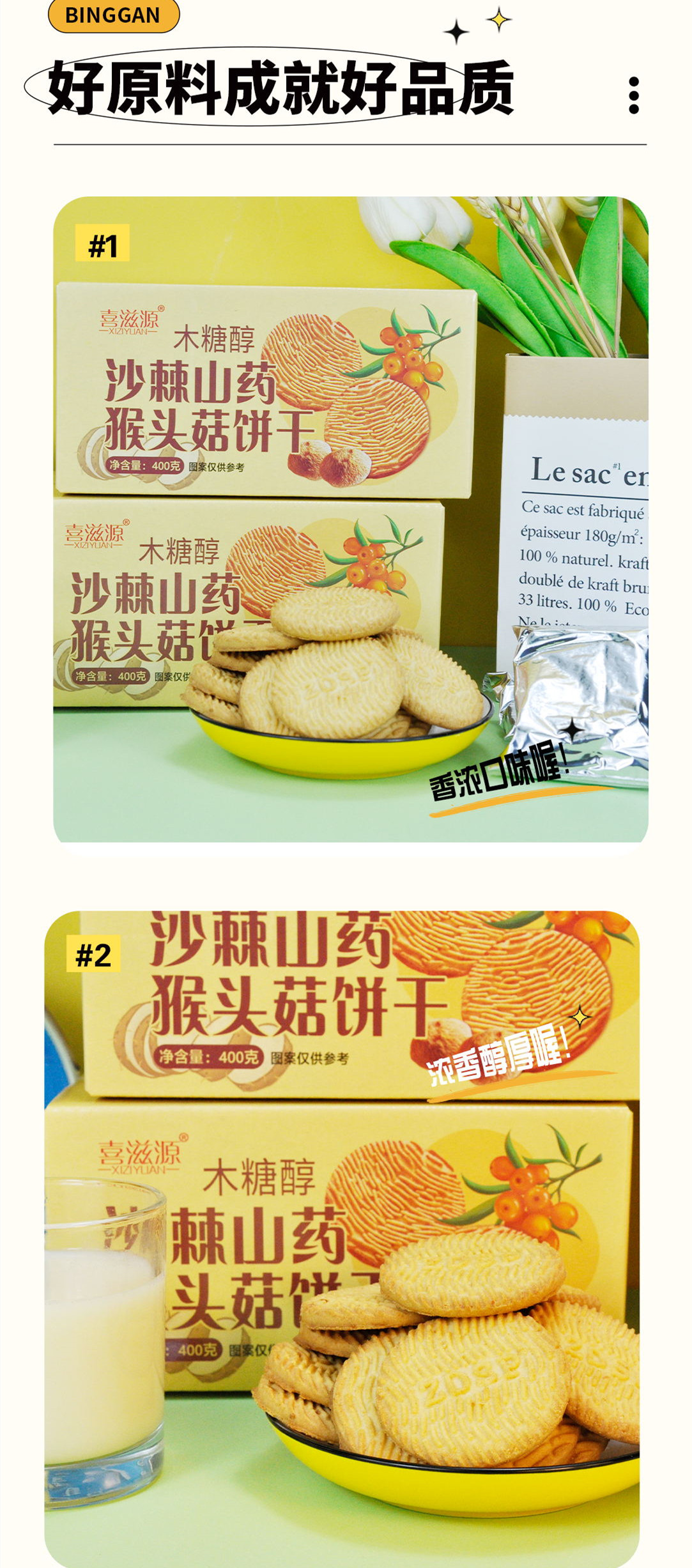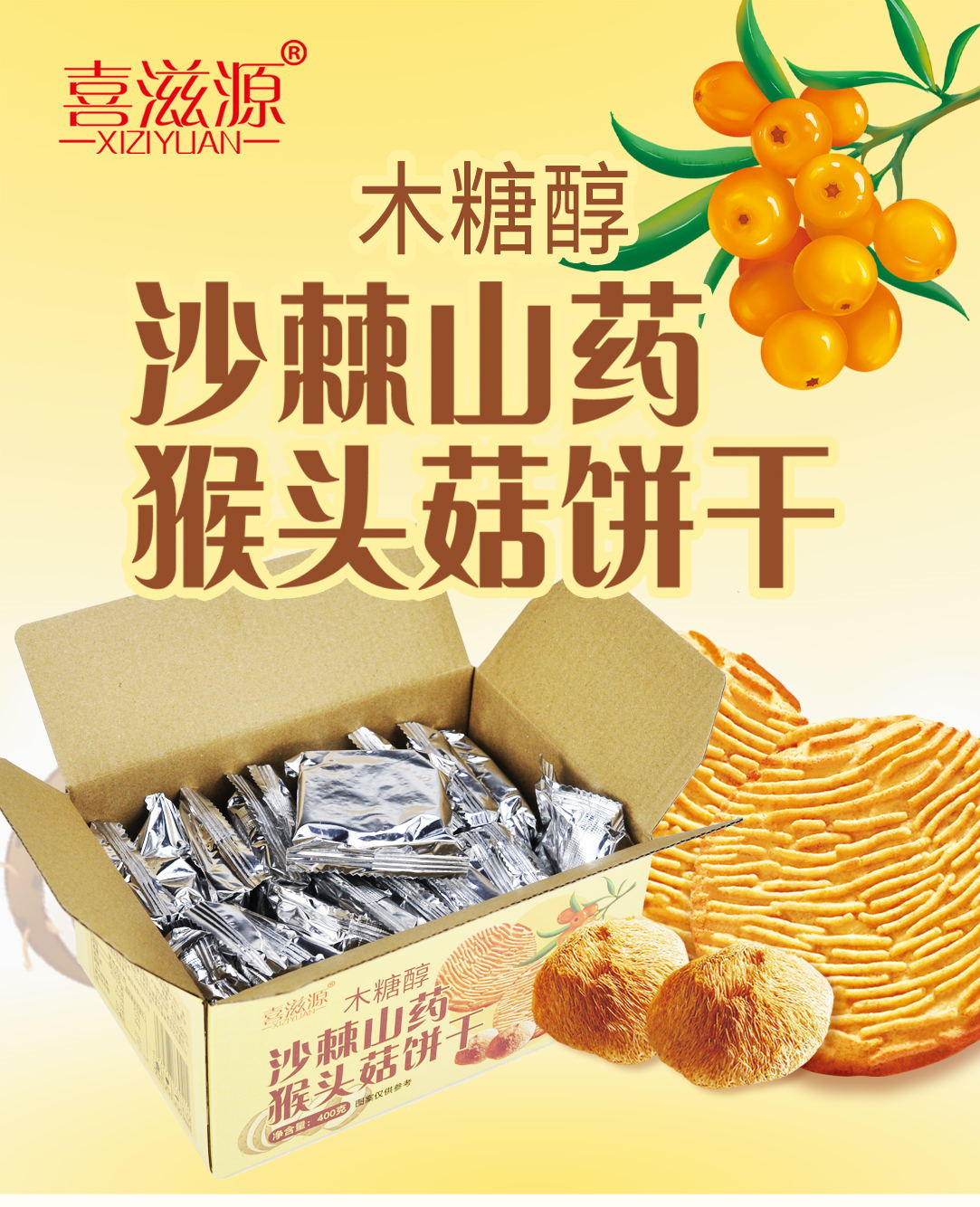 【4盒装】木糖醇沙棘山药猴头菇饼干 无添加蔗糖 香酥脆酥性饼干早餐代餐休闲零食400g/盒