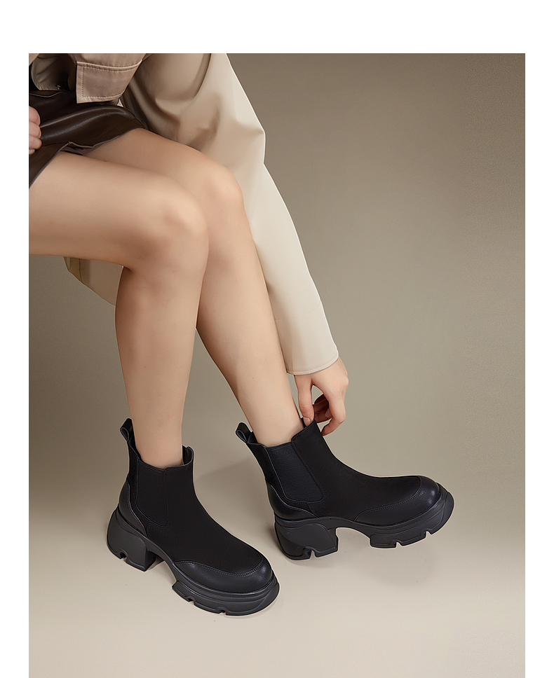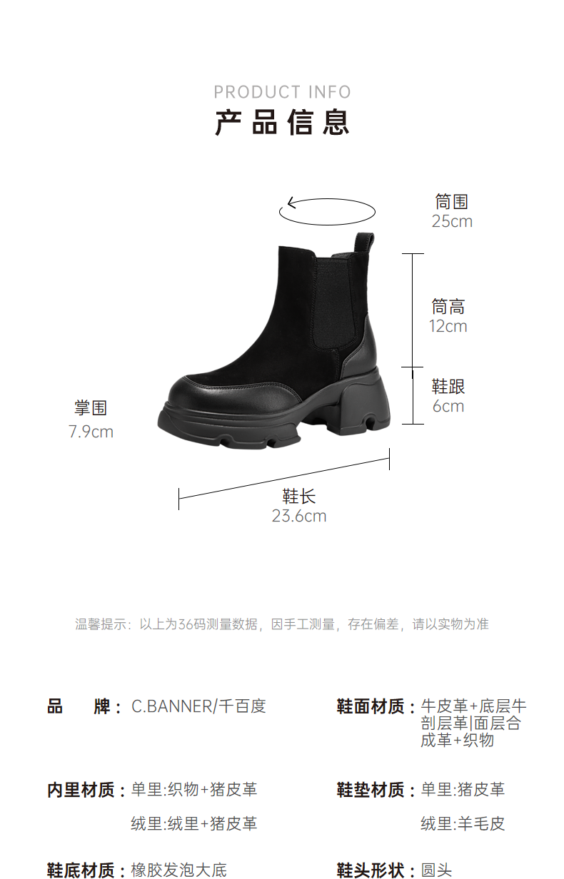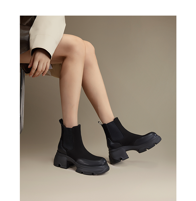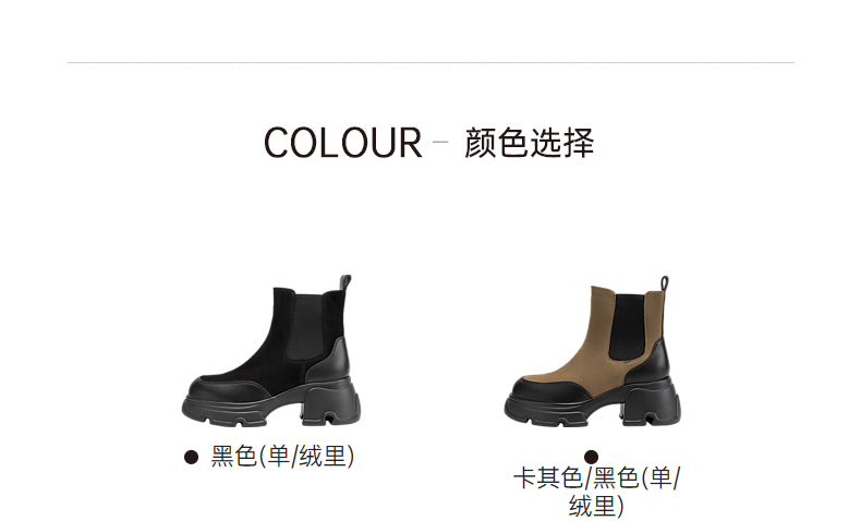 千百度厚底拼接加绒切尔西靴女冬季烟筒靴加绒保暖短靴子A24637301