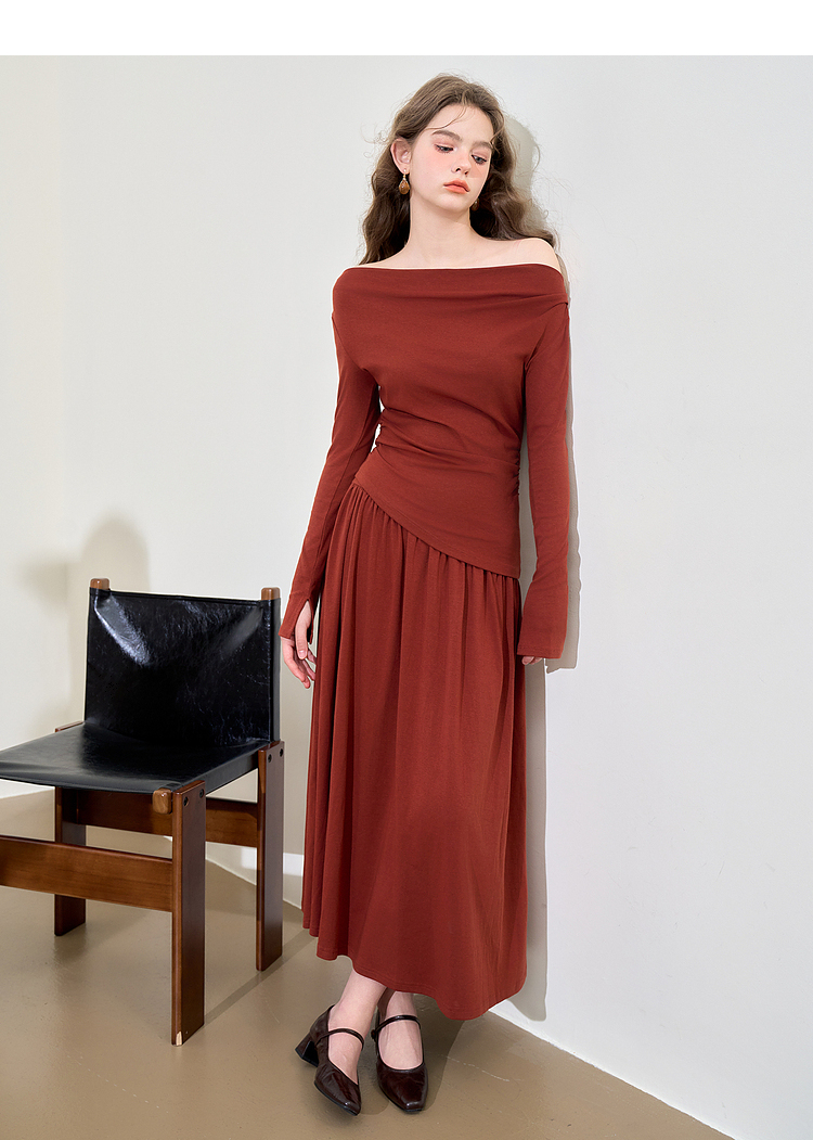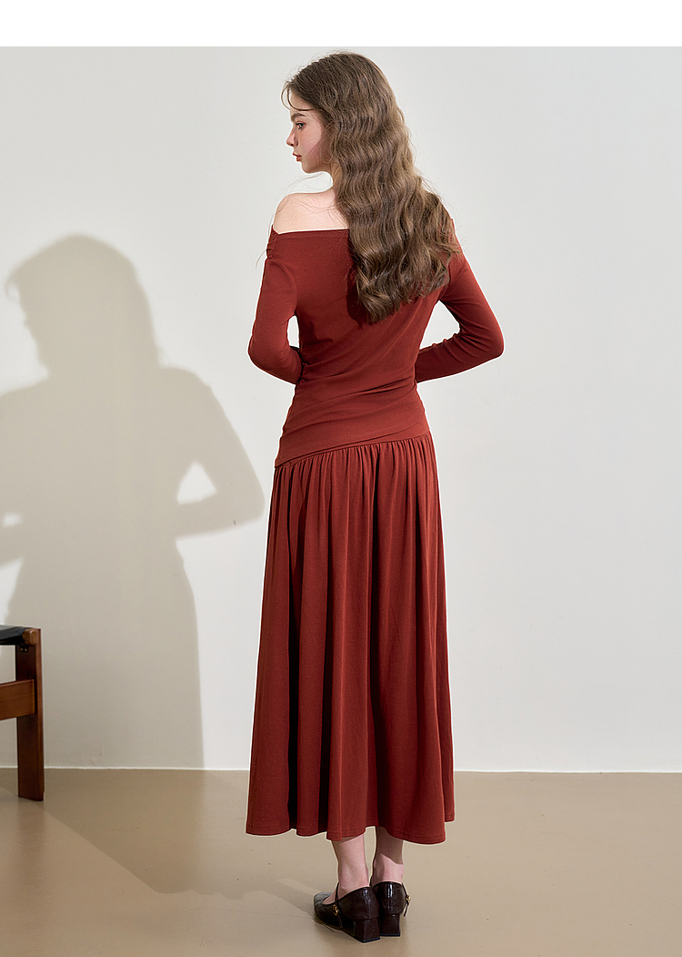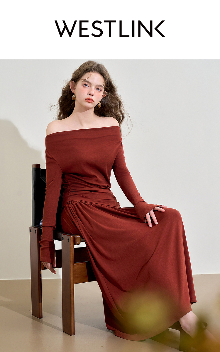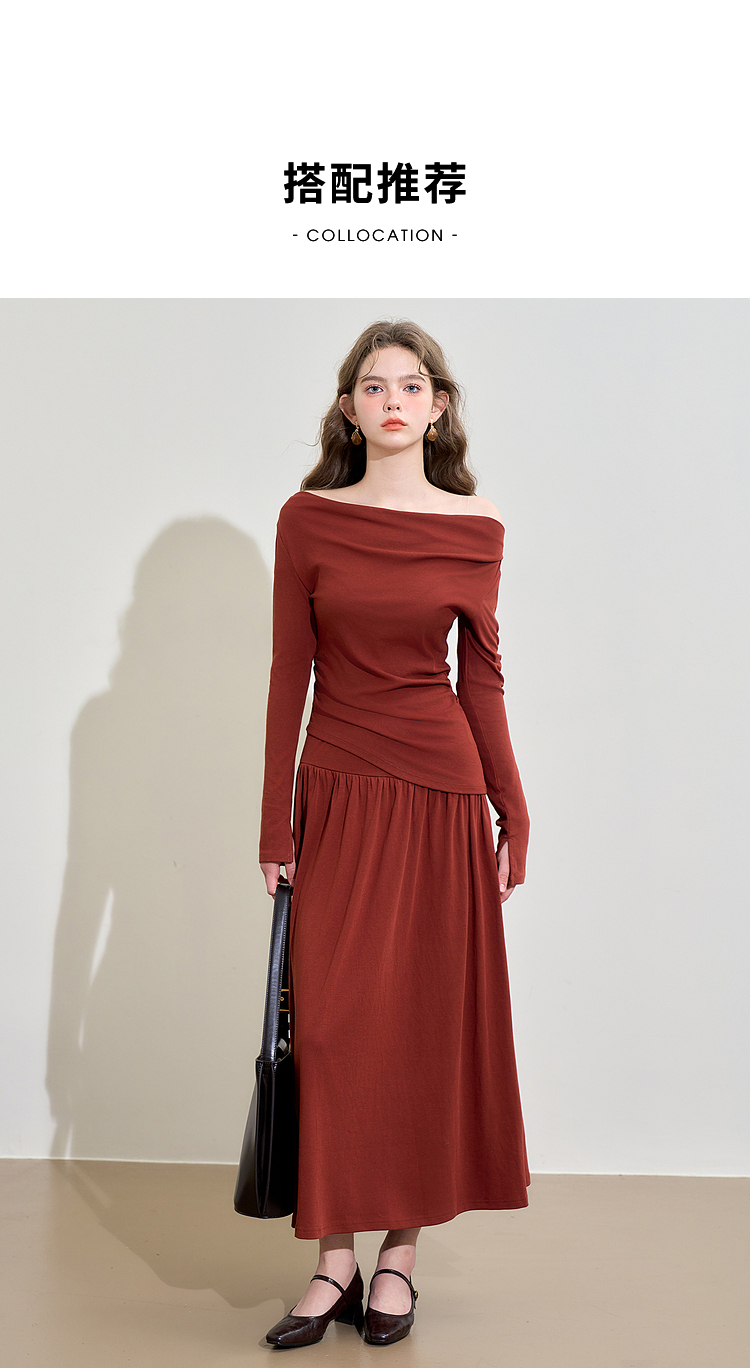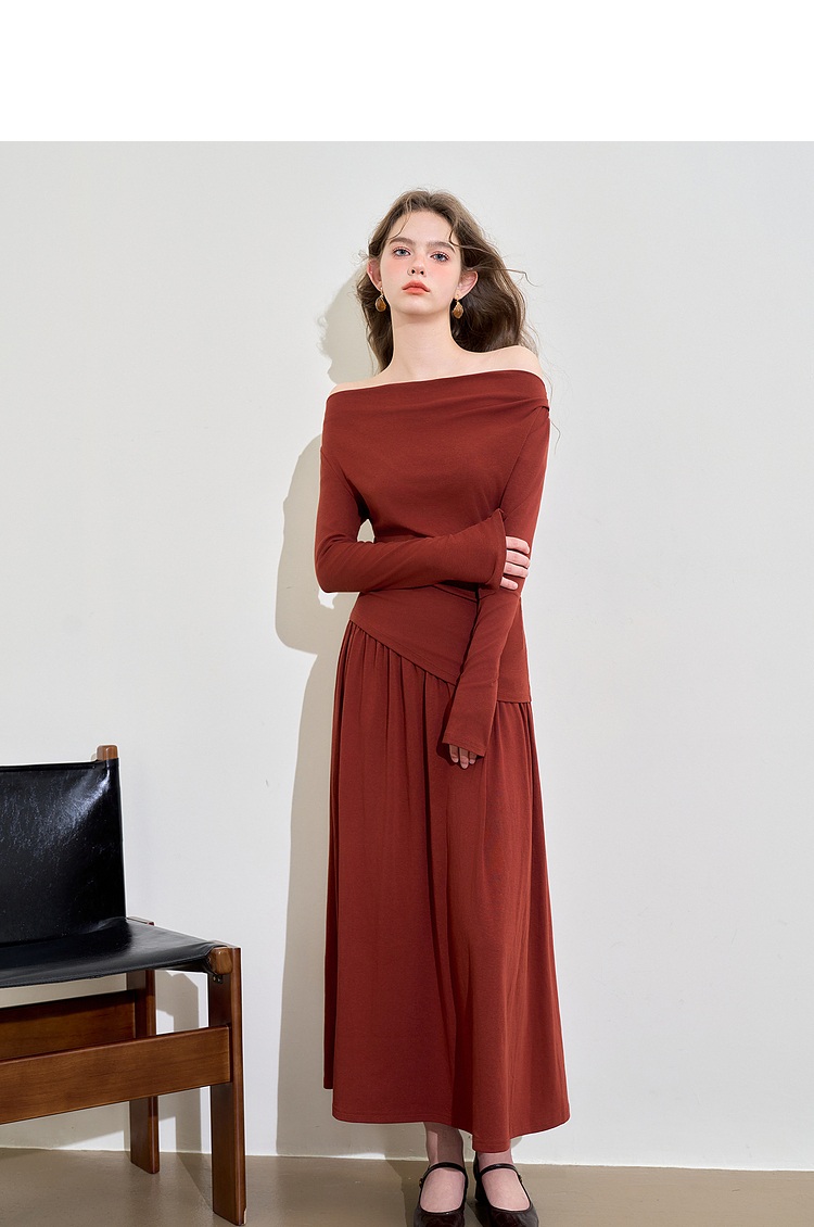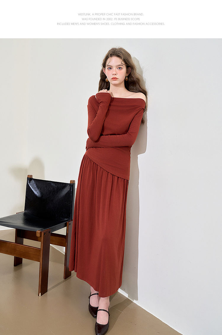 西遇法式酒红色两件套女新款一字肩上衣半裙针织套装D3542302