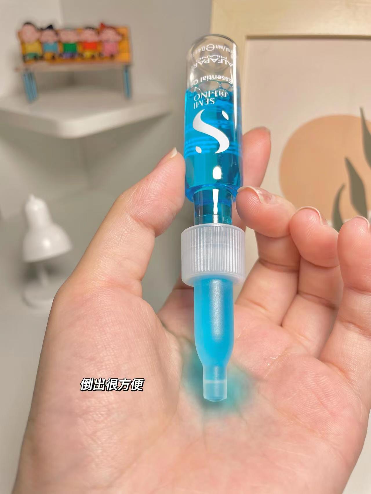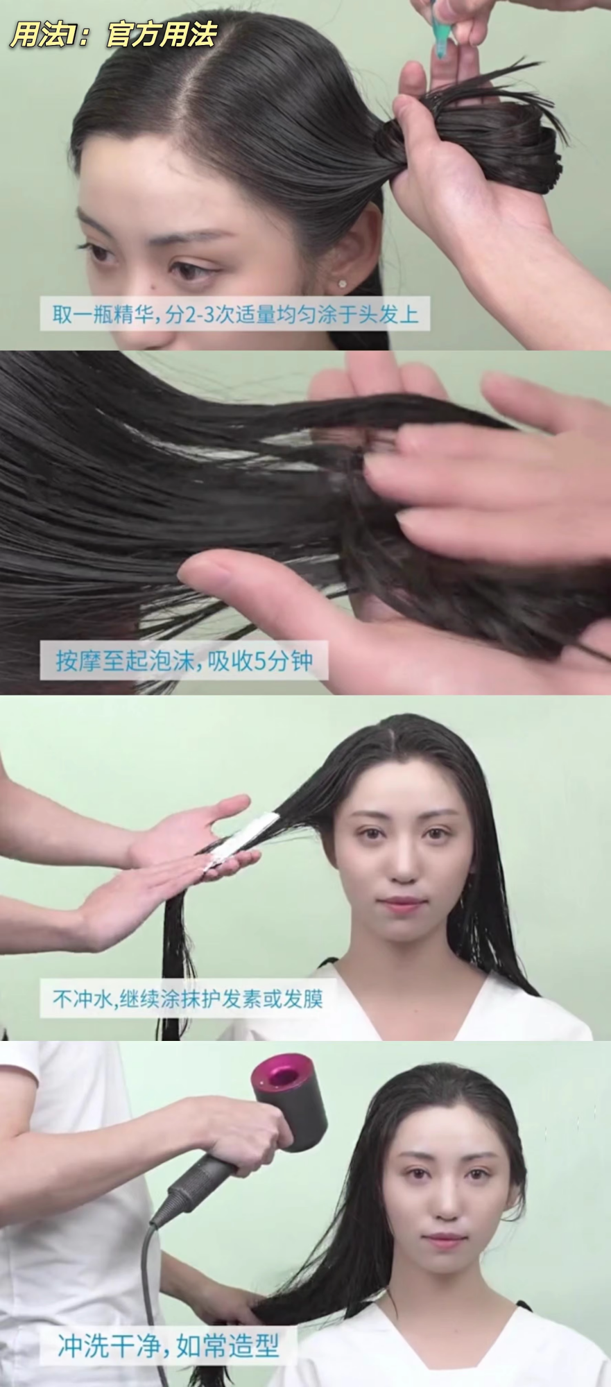 1、正常洗头后用毛巾擦到半干,取一瓶精华,分两至三次均匀涂抹到头发上,按摩至起泡